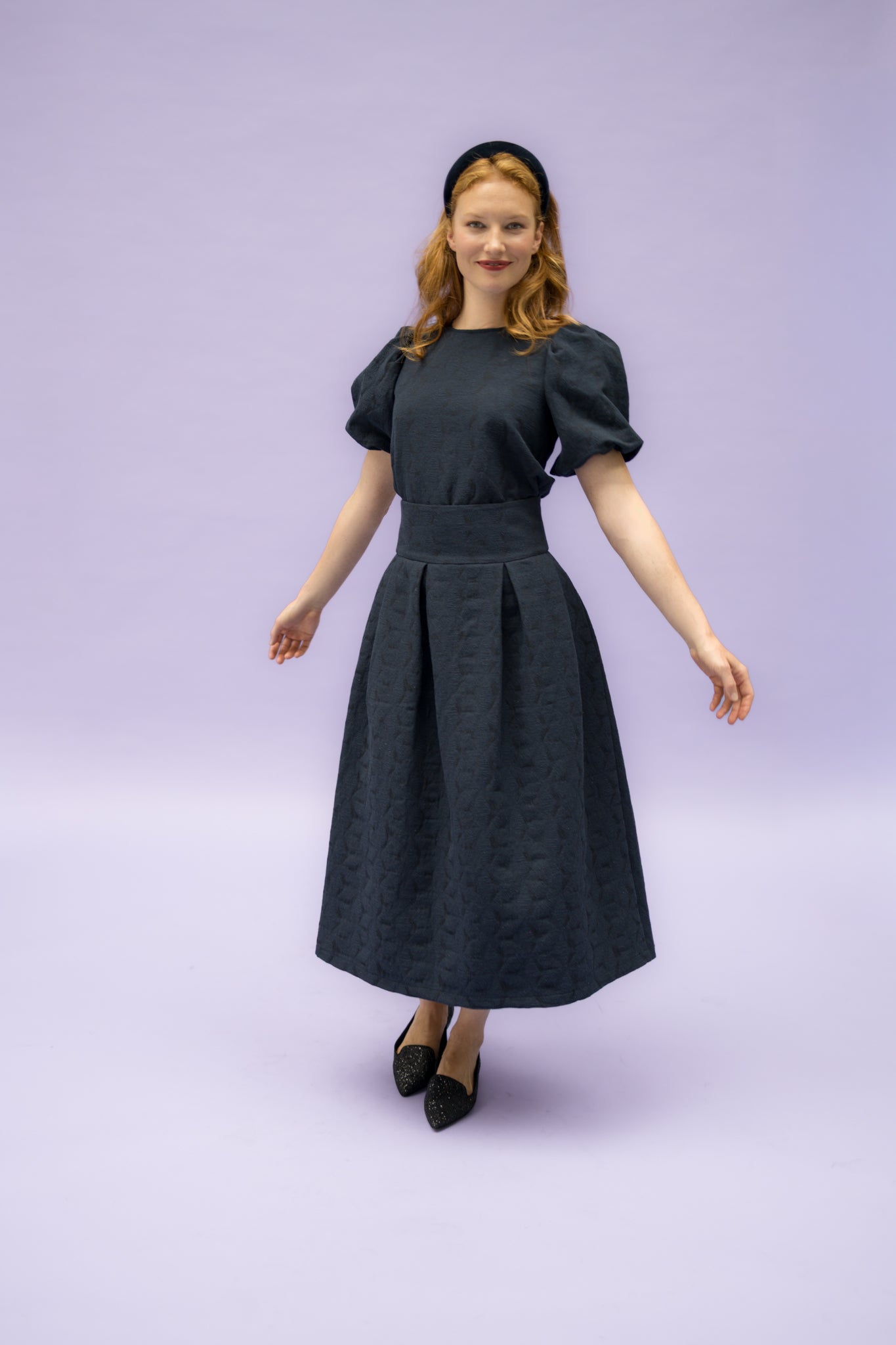 Es handelt sich um einen festen Jacquardstoff, blau-schwarz gemustert.
