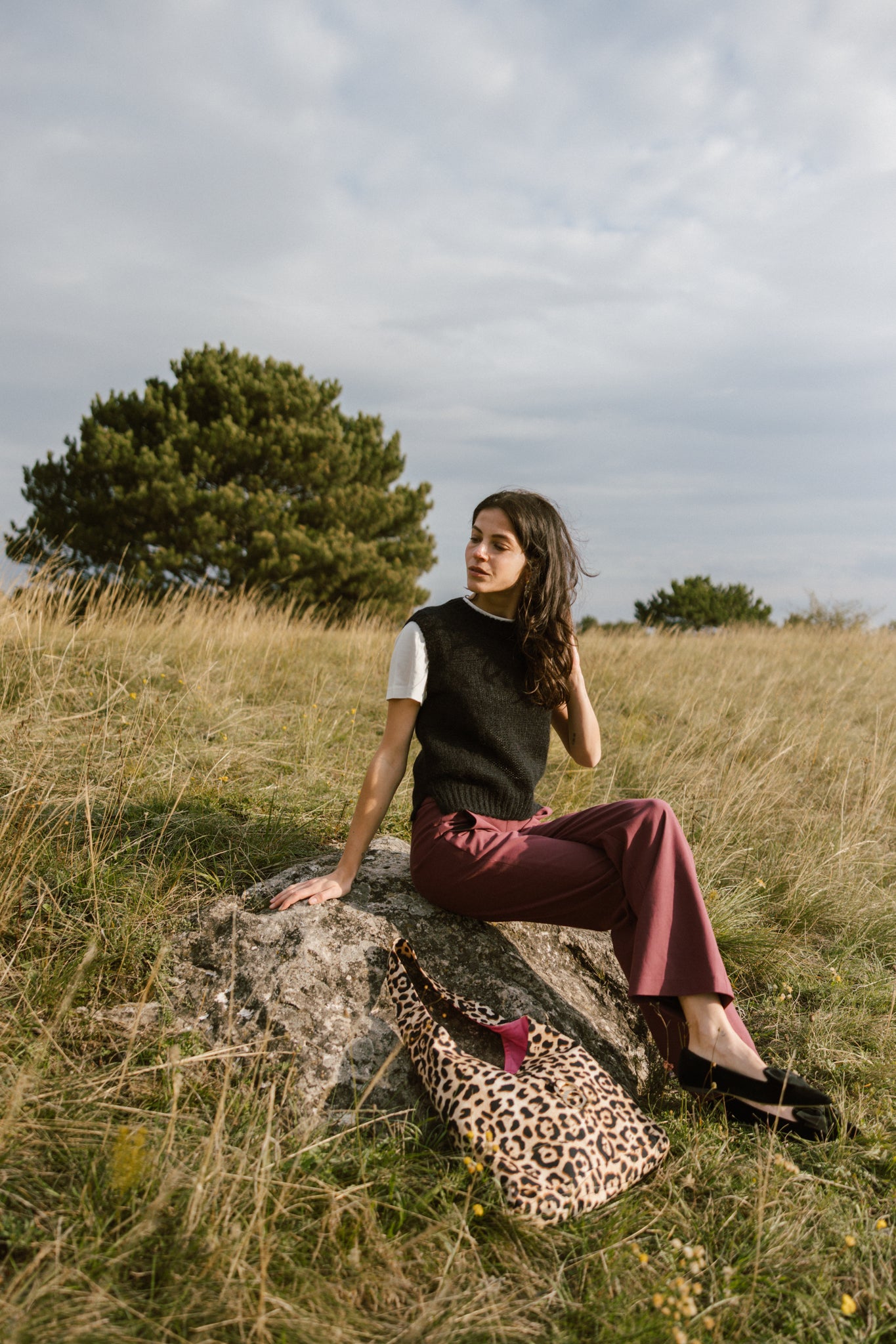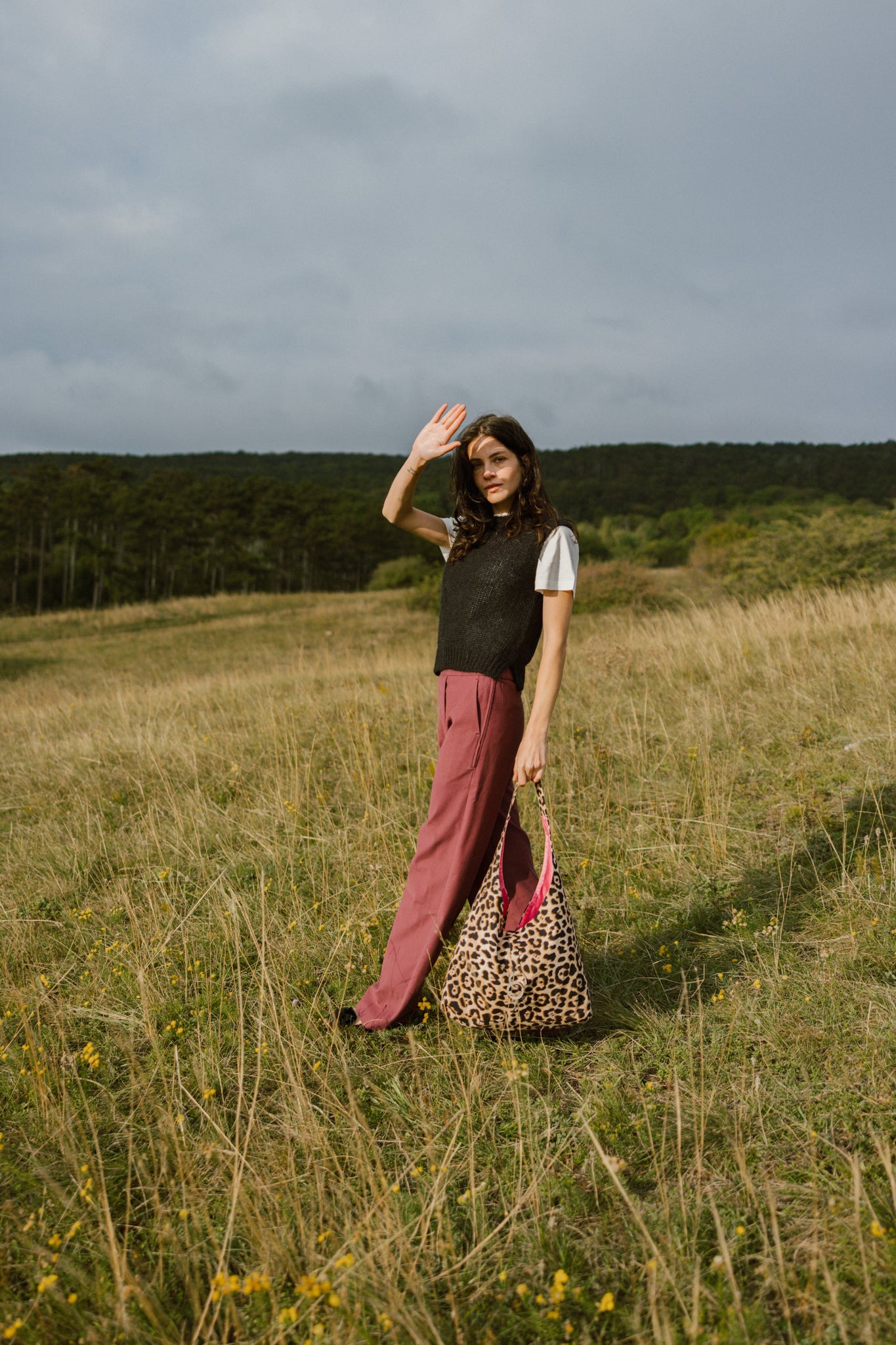 Here it is, the first CONSCHES pants. AVA has a straight slightly flared leg, a zip on the side and an elastic in the waistband with a paperbag look. This makes them comfortable to wear and pull on.