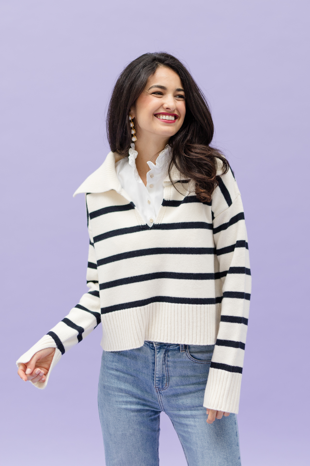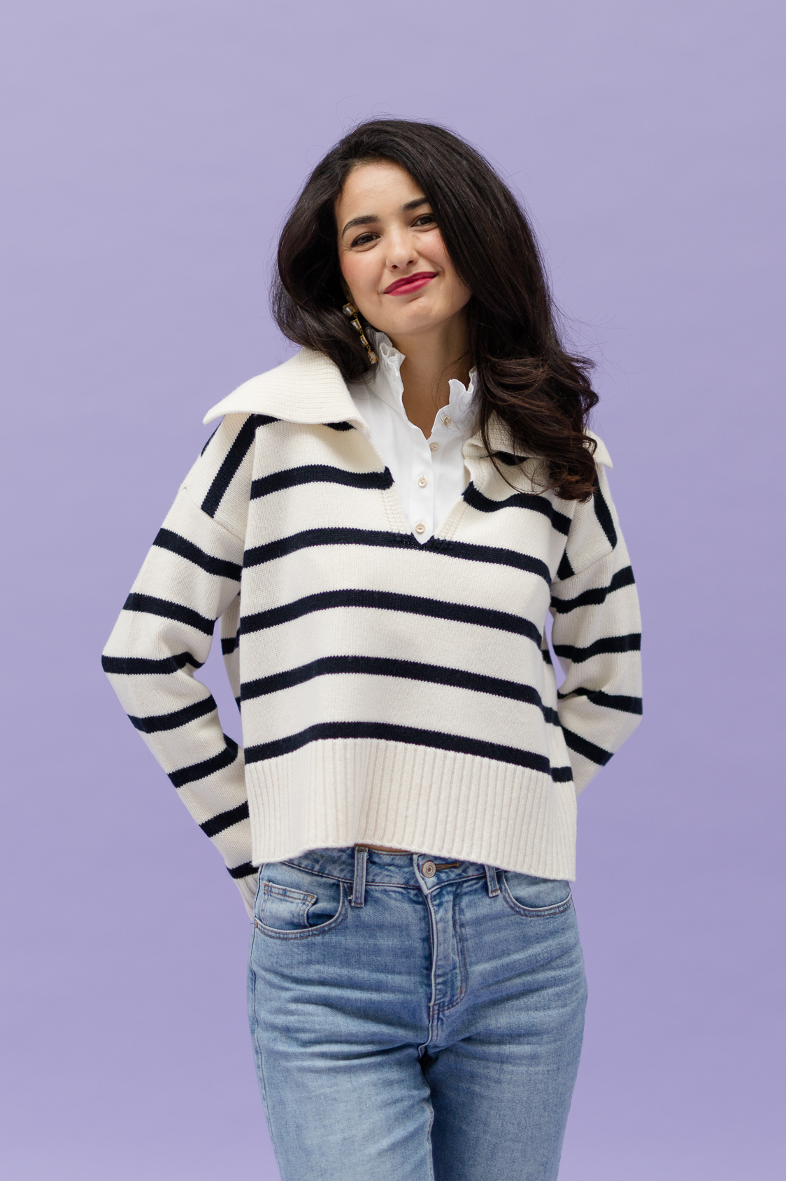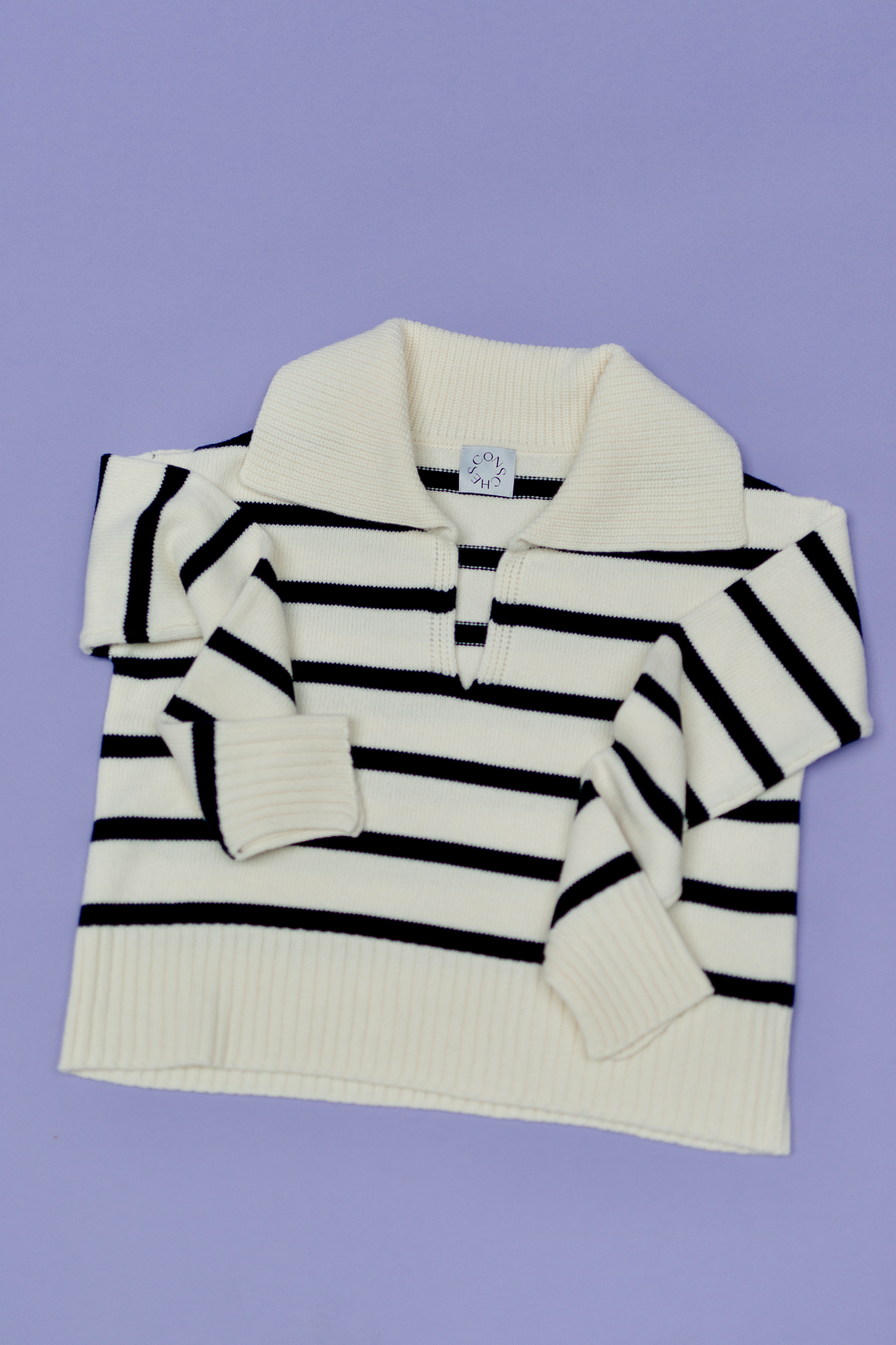 ALLEGRA strikes the perfect balance between casual chic and thoughtful details. The classic stripe pattern meets an open polo collar, adding a sporty yet elegant touch. Subtle slit details at the sleeves create a refined accent and give the piece that special something. Made from soft knit fabric, ALLEGRA offers exceptional comfort and effortless style. Whether paired with jeans for a relaxed look or dressed up with tailored trousers or skirts – this sweater is a true wardrobe favorite.