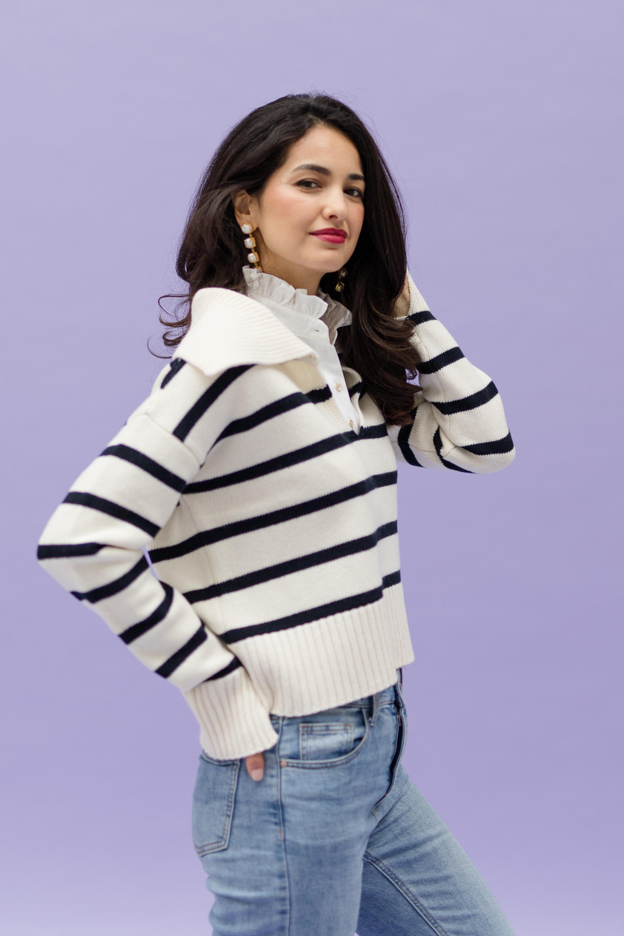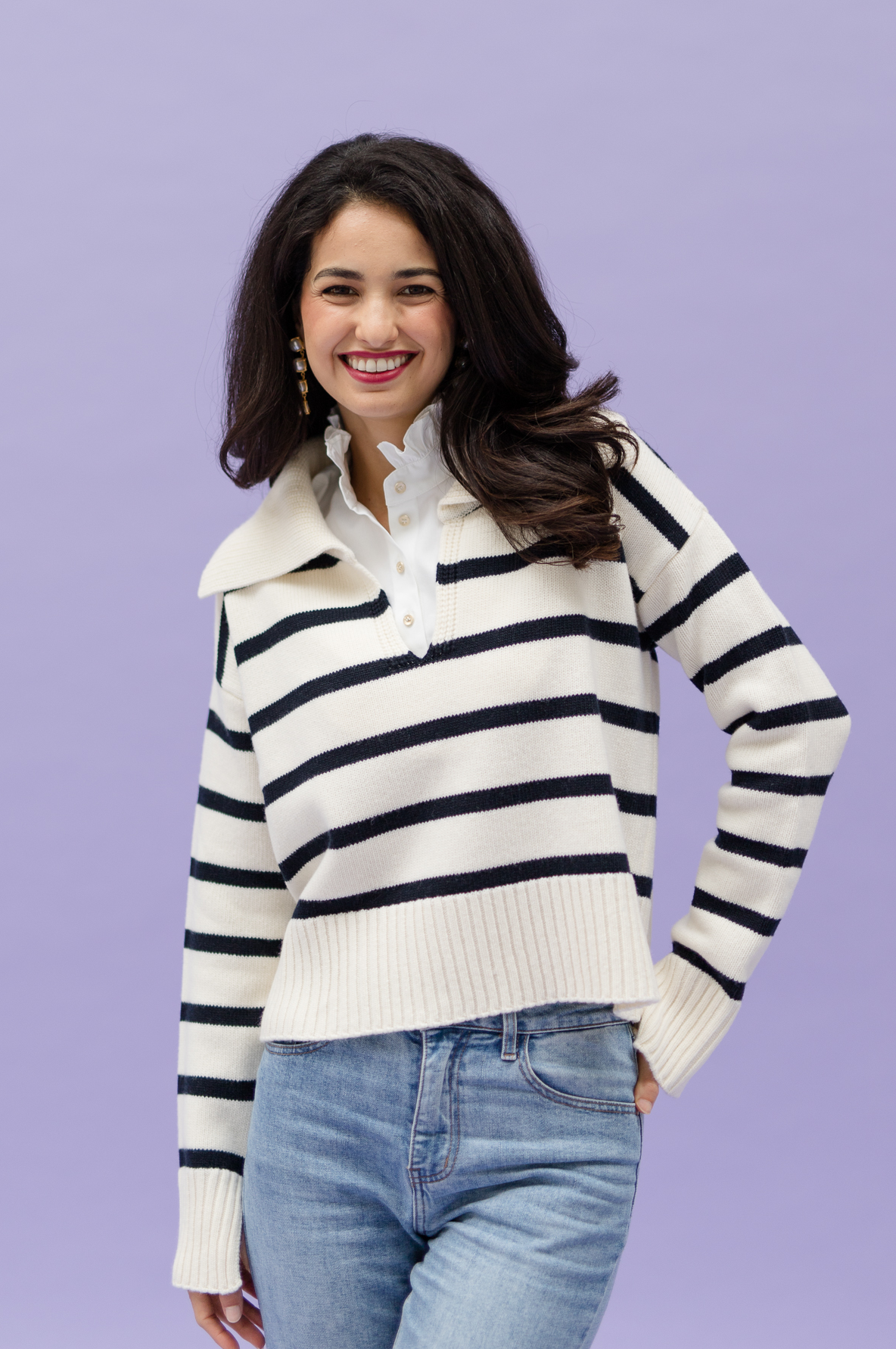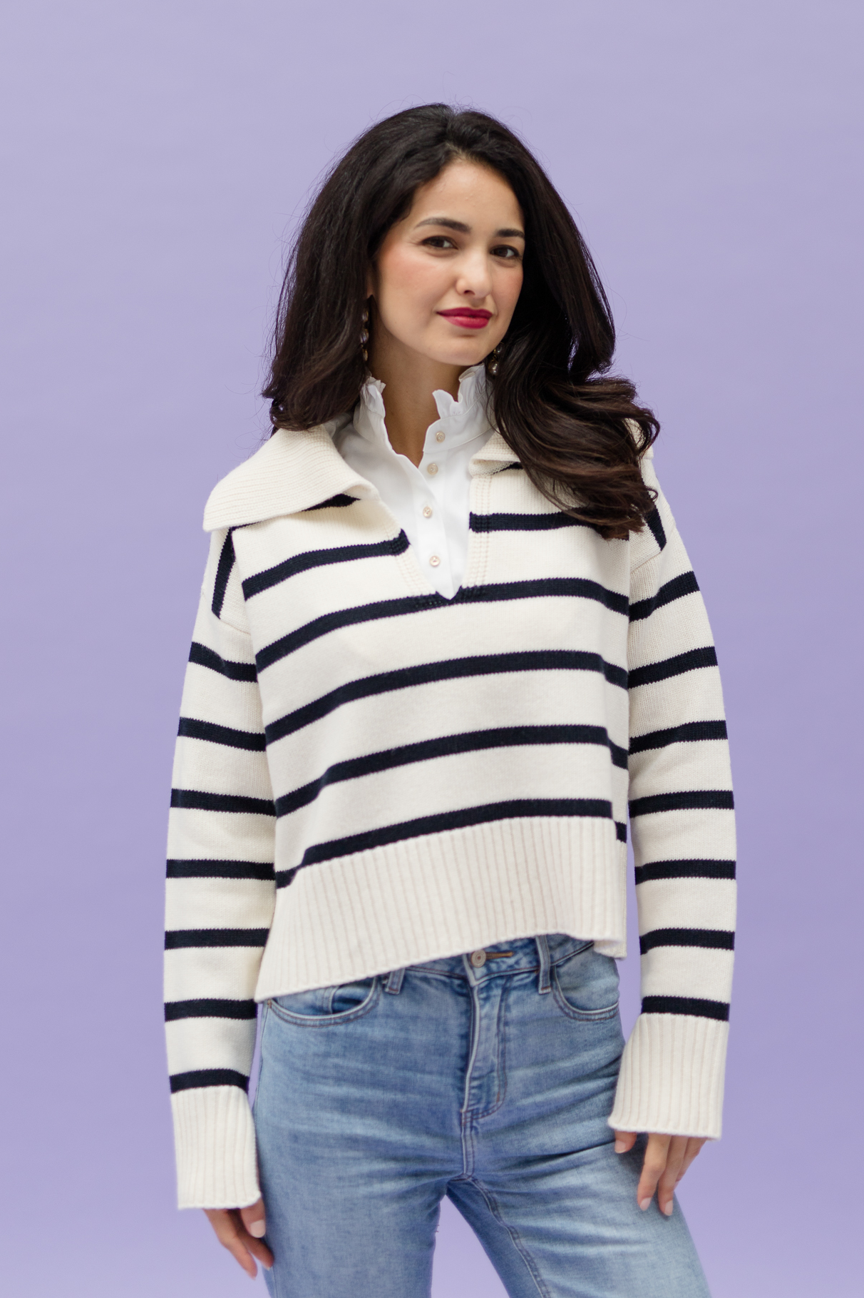 ALLEGRA strikes the perfect balance between casual chic and thoughtful details. The classic stripe pattern meets an open polo collar, adding a sporty yet elegant touch. Subtle slit details at the sleeves create a refined accent and give the piece that special something. Made from soft knit fabric, ALLEGRA offers exceptional comfort and effortless style. Whether paired with jeans for a relaxed look or dressed up with tailored trousers or skirts – this sweater is a true wardrobe favorite.