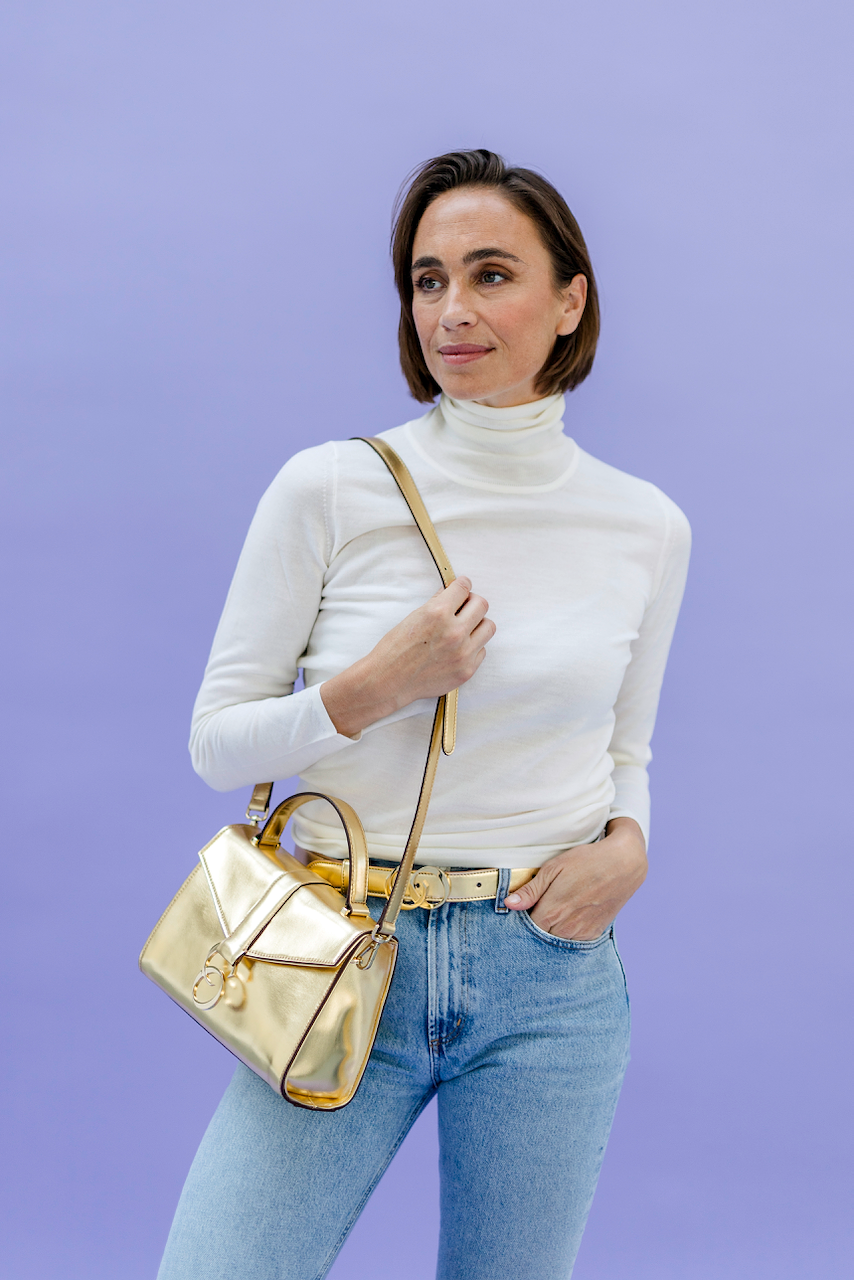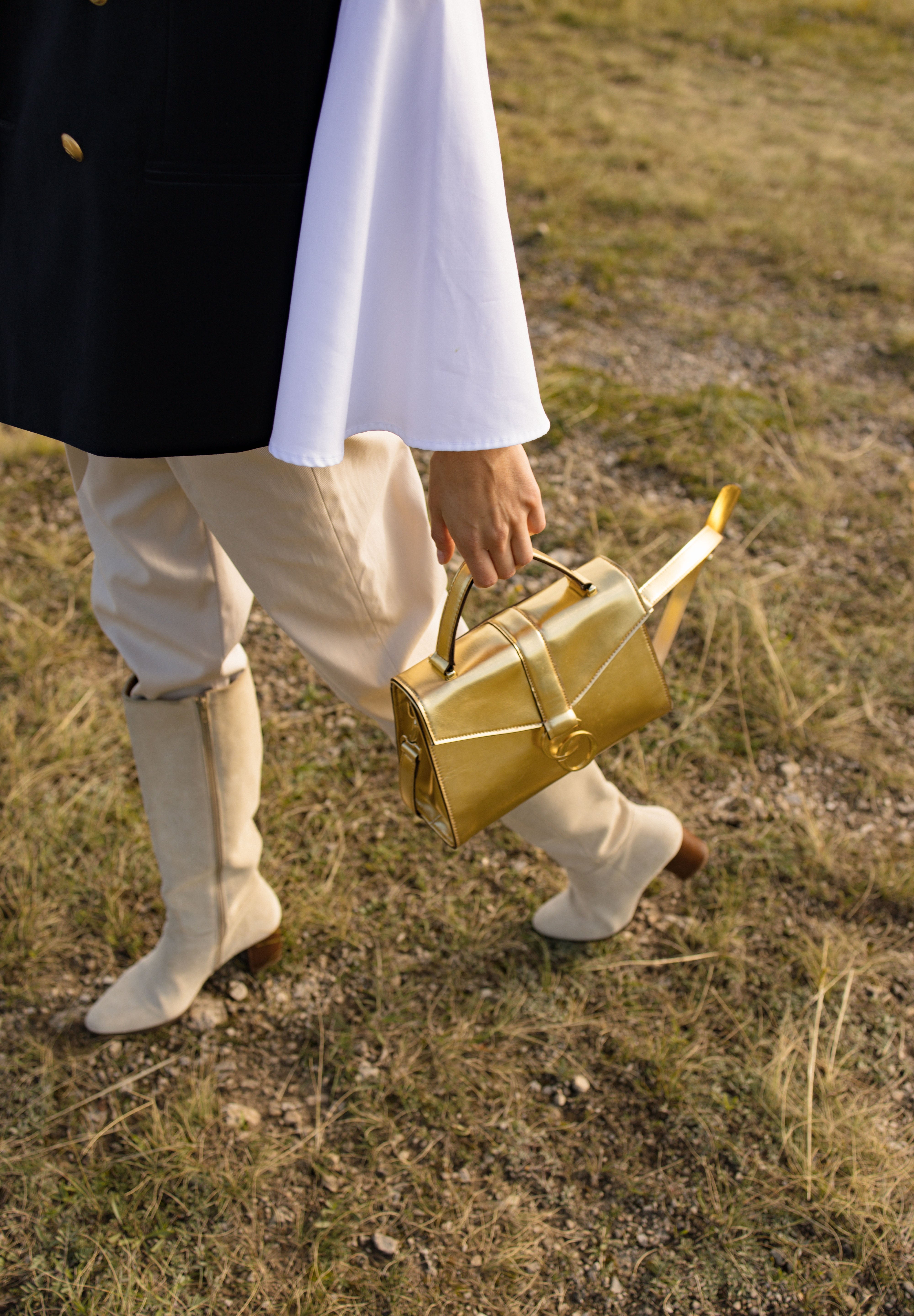 The CARRIE bag combines the elegance of a clutch with the functionality of a crossbody. It offers ample storage space with a hidden inner compartment and a convenient card slot to keep your essentials secure. The detachable strap allows for versatile styling—carry it as a clutch or wear it comfortably over your shoulder. The magnetic closure and signature CO buckle add the perfect finishing touch. Made from high-quality vegan leather and lovingly crafted in Italy, CARRIE is the ideal companion for chic and stylish outings.  25cm x 17cmx 10 cm diameter