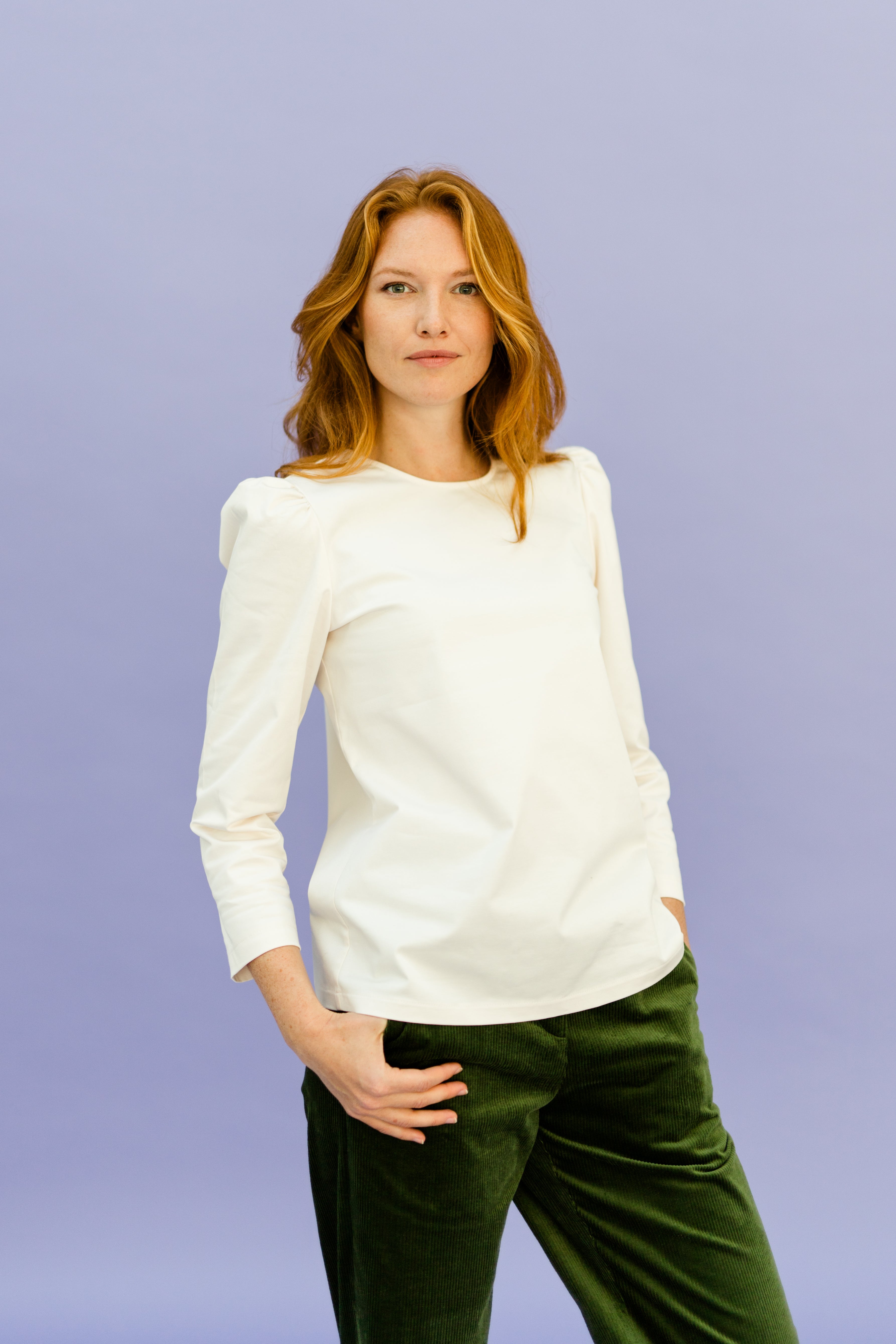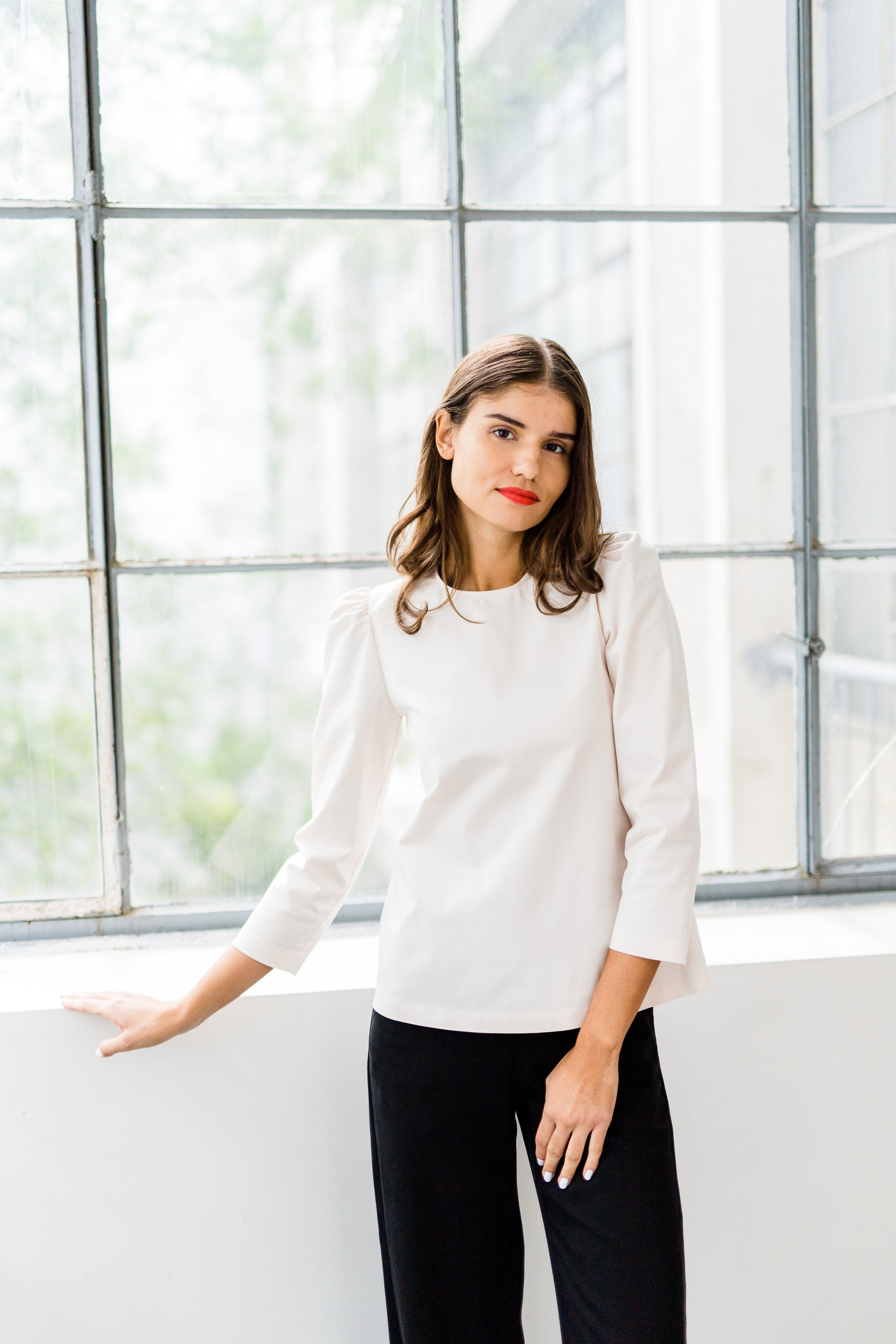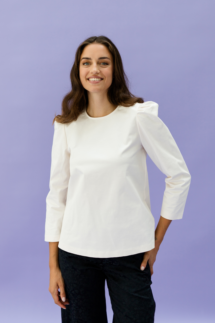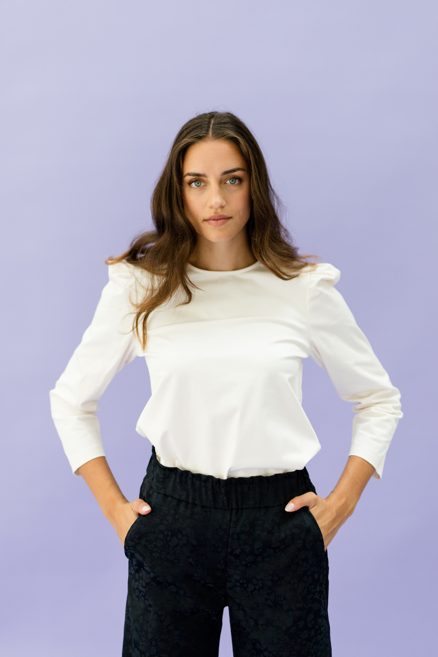 This top comes straight from heaven. DALIA comes with a puff arm and 7/8 sleeves. Due to the high-quality materials it is perfect for the fall season. This gives it a slightly tighter fit. You can easily combine it, wear it over trousers or skirts or tuck it in. A must have basic.