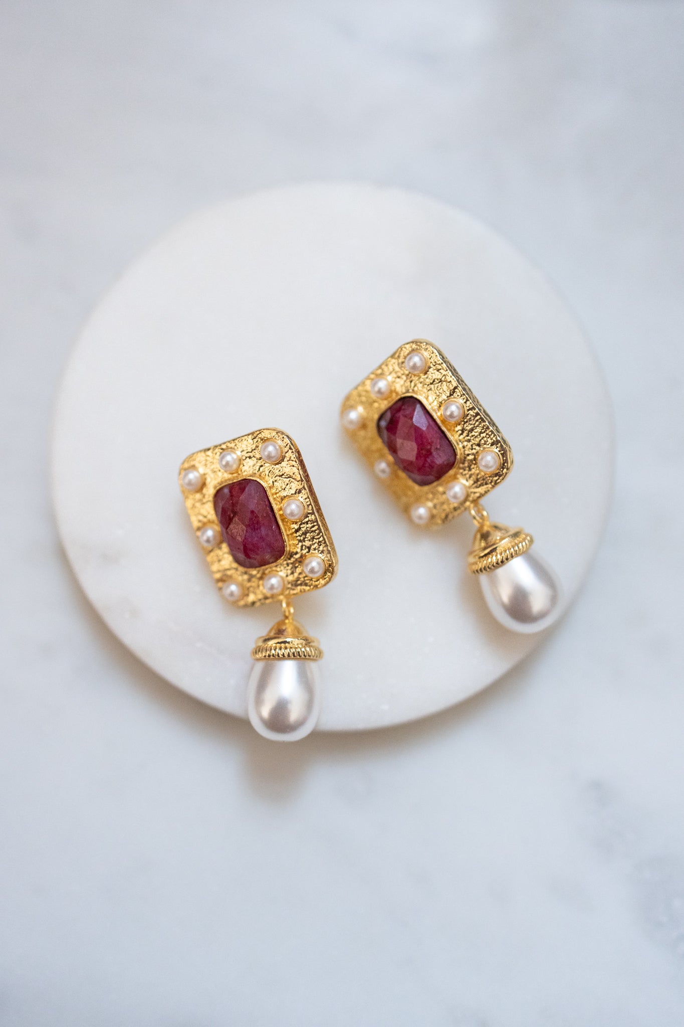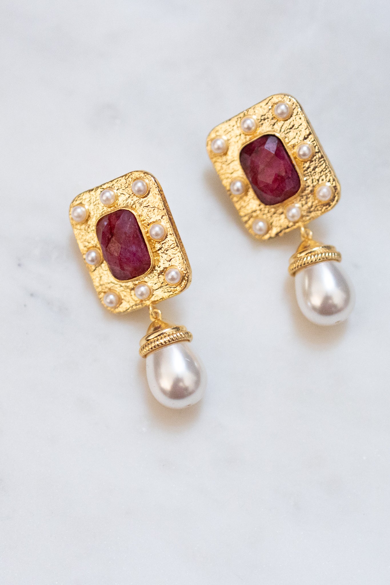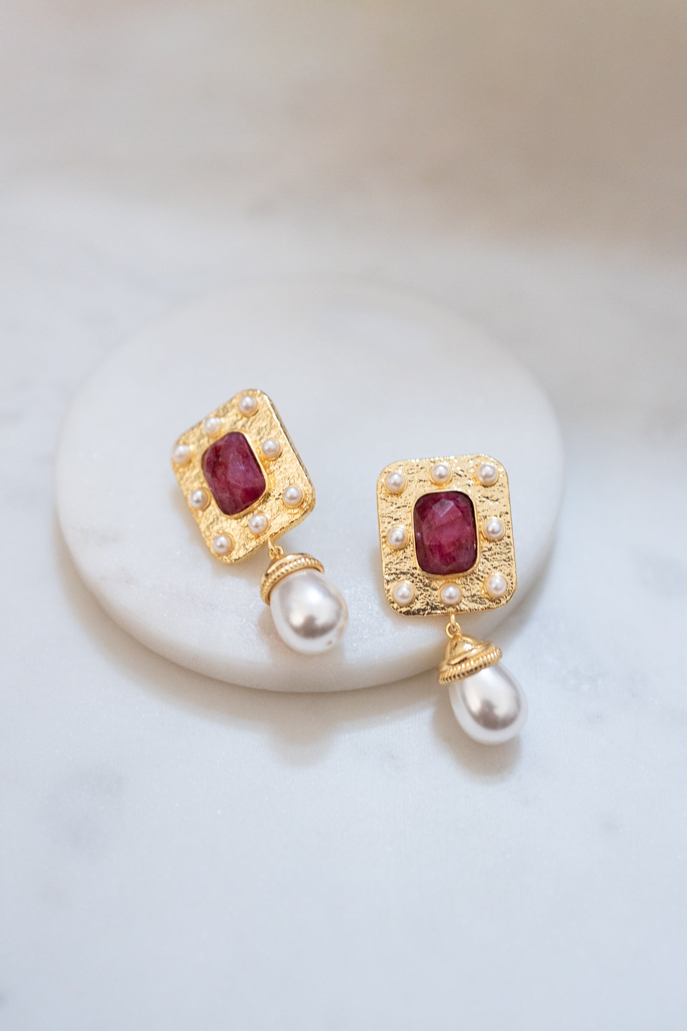 Elegant stud earrings crafted from high-quality bronze, 18 kt gold-plated, featuring radiant semi-precious stones and delicate cultured pearls. The rectangular setting showcases a textured surface, framed by tiny pearls, while a teardrop-shaped charm gracefully completes the design. Timeless and expressive, these earrings add a touch of luxurious elegance to any look. Diameter approx. 5 cm.