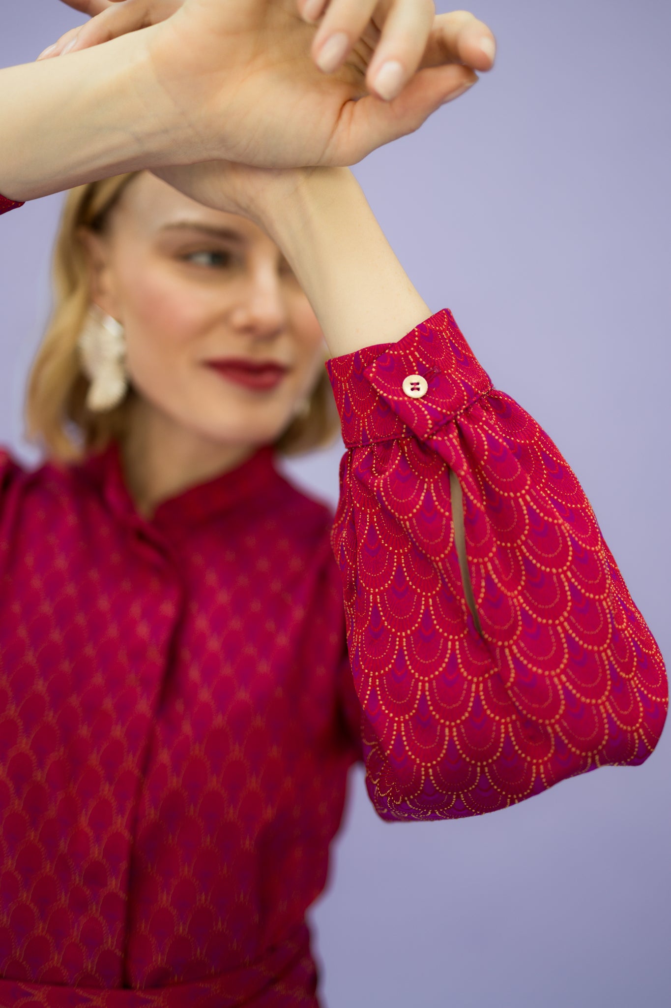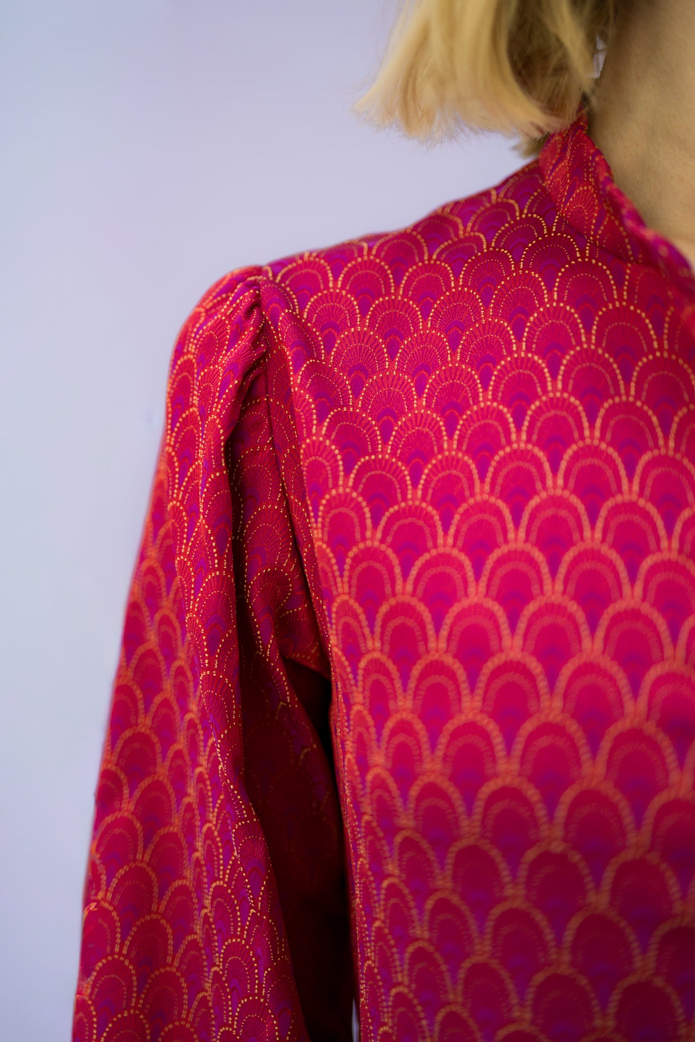 DORA pink gatsby is a lighter, flowing brocade fabric.