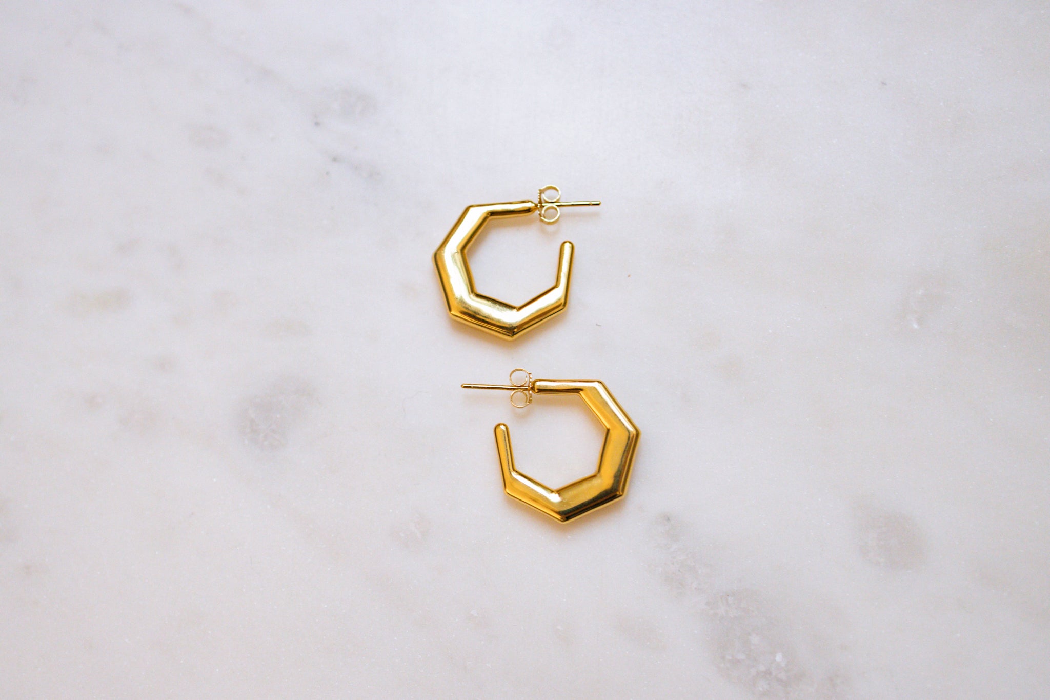 Elegant hexagon hoops crafted from gold-plated 925 sterling silver. Simple, versatile, and perfect for everyday wear, these hoops are a subtle yet striking addition to any jewelry collection. Approximately 2,5 cm long.