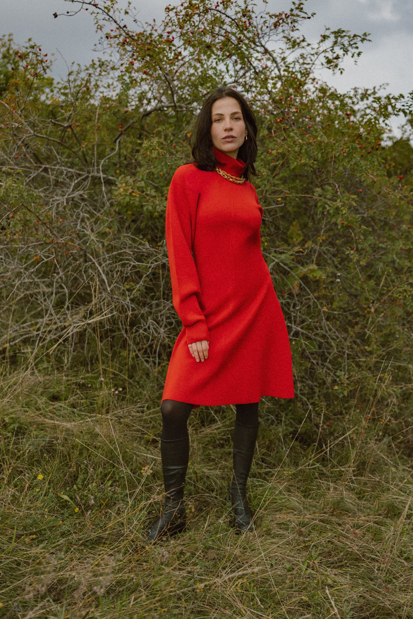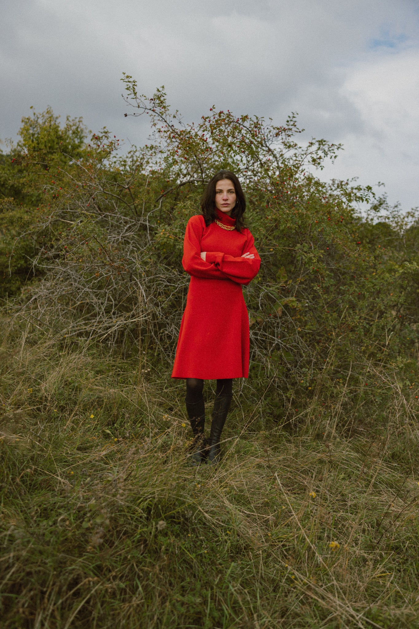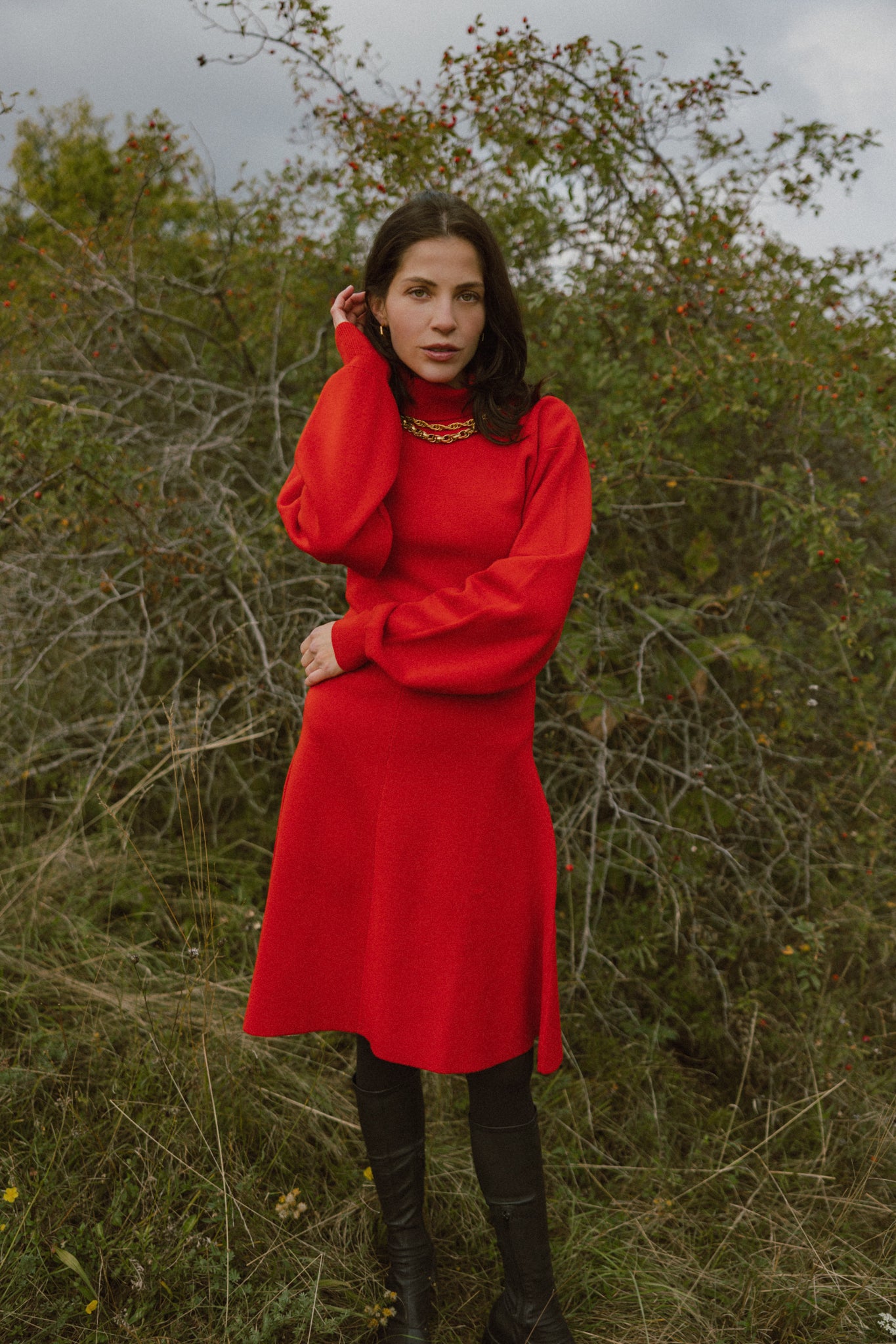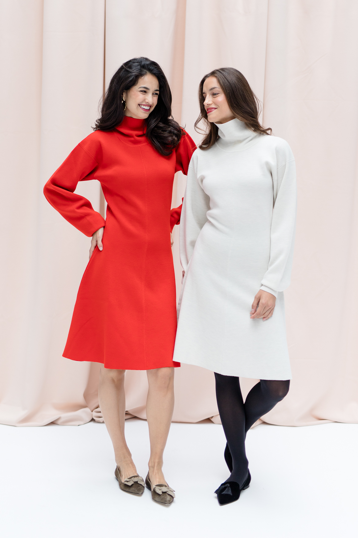 With KATE, we proudly present our very first knit dress – an elegant all-rounder that perfectly blends comfort and style. The stand-up collar adds a clean, modern touch, while the balloon sleeves bring a hint of drama. Its A-line silhouette gently skims the knees, offering a flattering and feminine fit. Made from soft, shape-retaining knit fabric, KATE not only feels incredibly comfortable but also opens up countless styling options.