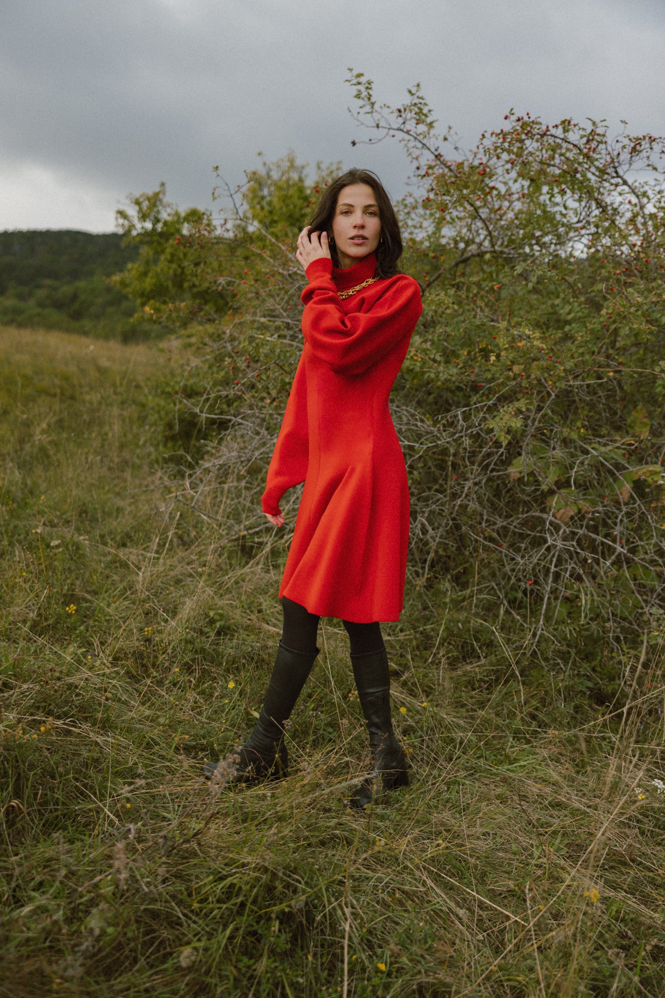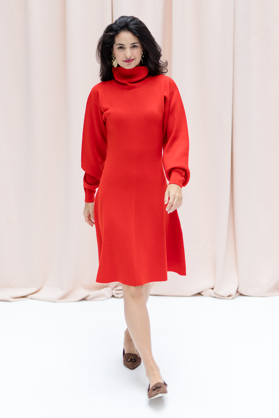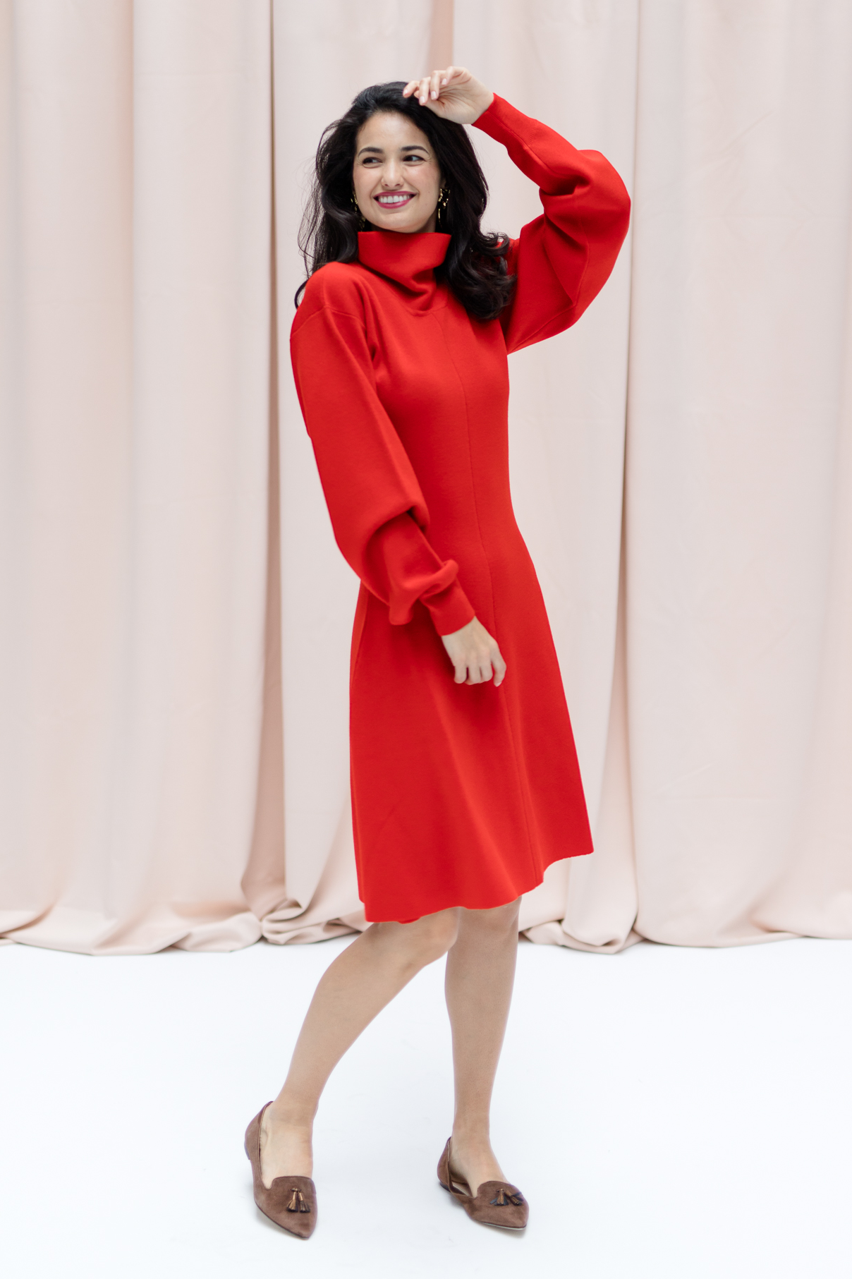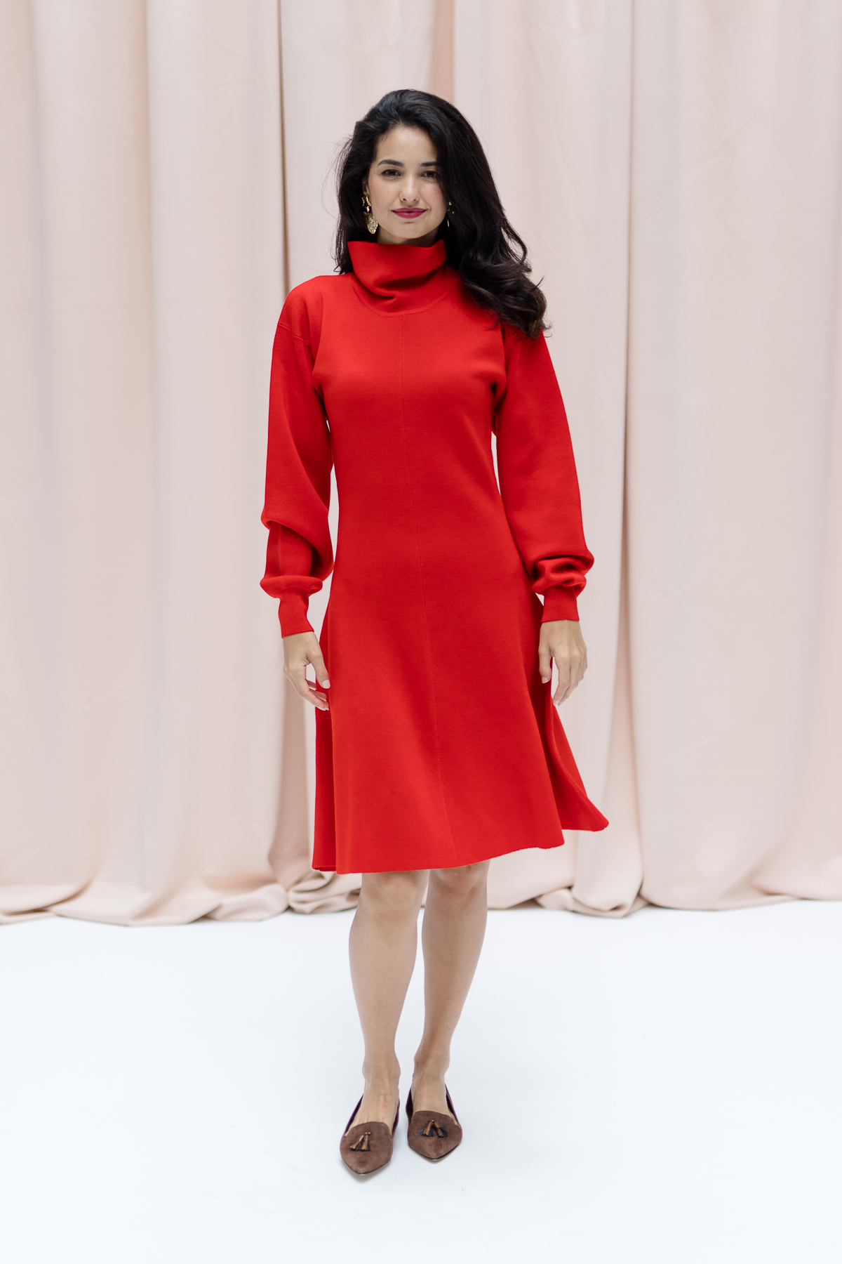 With KATE, we proudly present our very first knit dress – an elegant all-rounder that perfectly blends comfort and style. The stand-up collar adds a clean, modern touch, while the balloon sleeves bring a hint of drama. Its A-line silhouette gently skims the knees, offering a flattering and feminine fit. Made from soft, shape-retaining knit fabric, KATE not only feels incredibly comfortable but also opens up countless styling options.