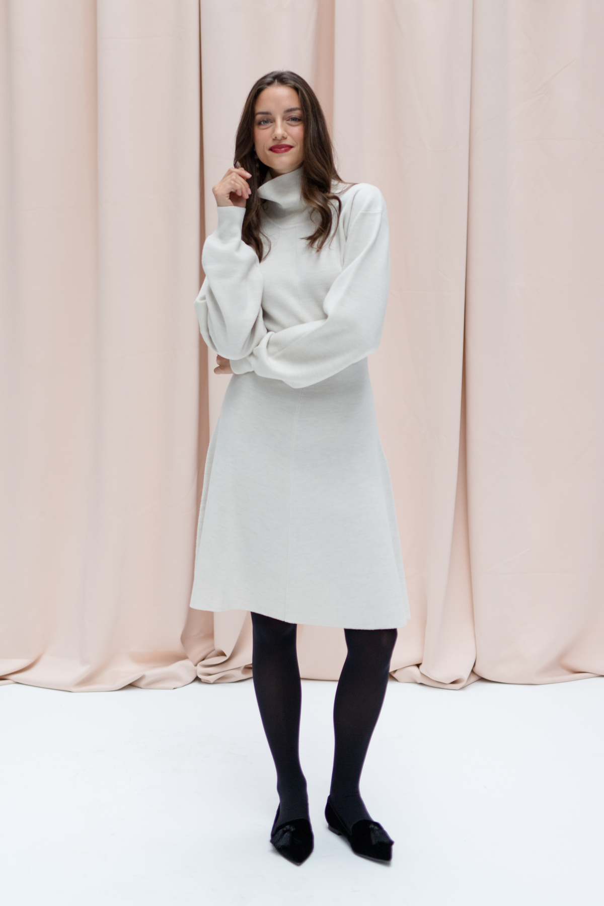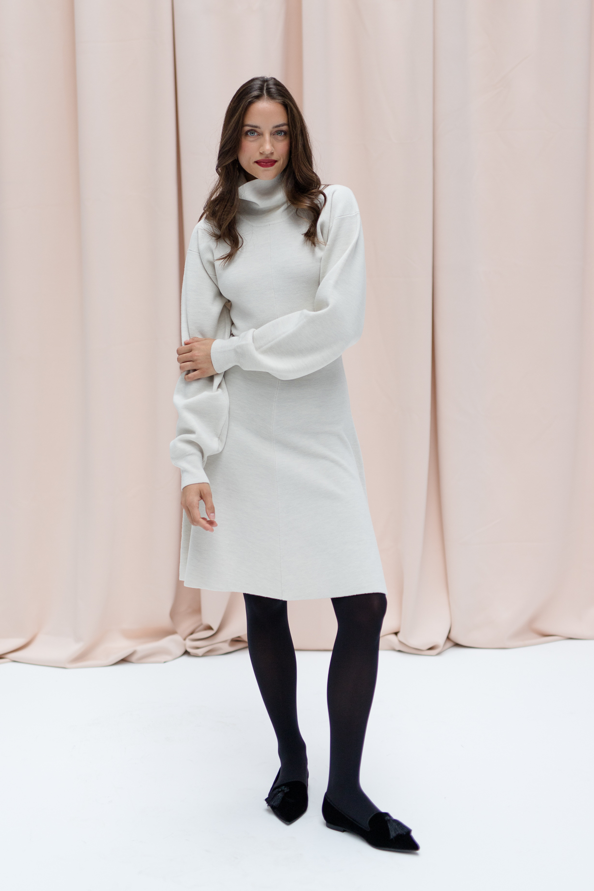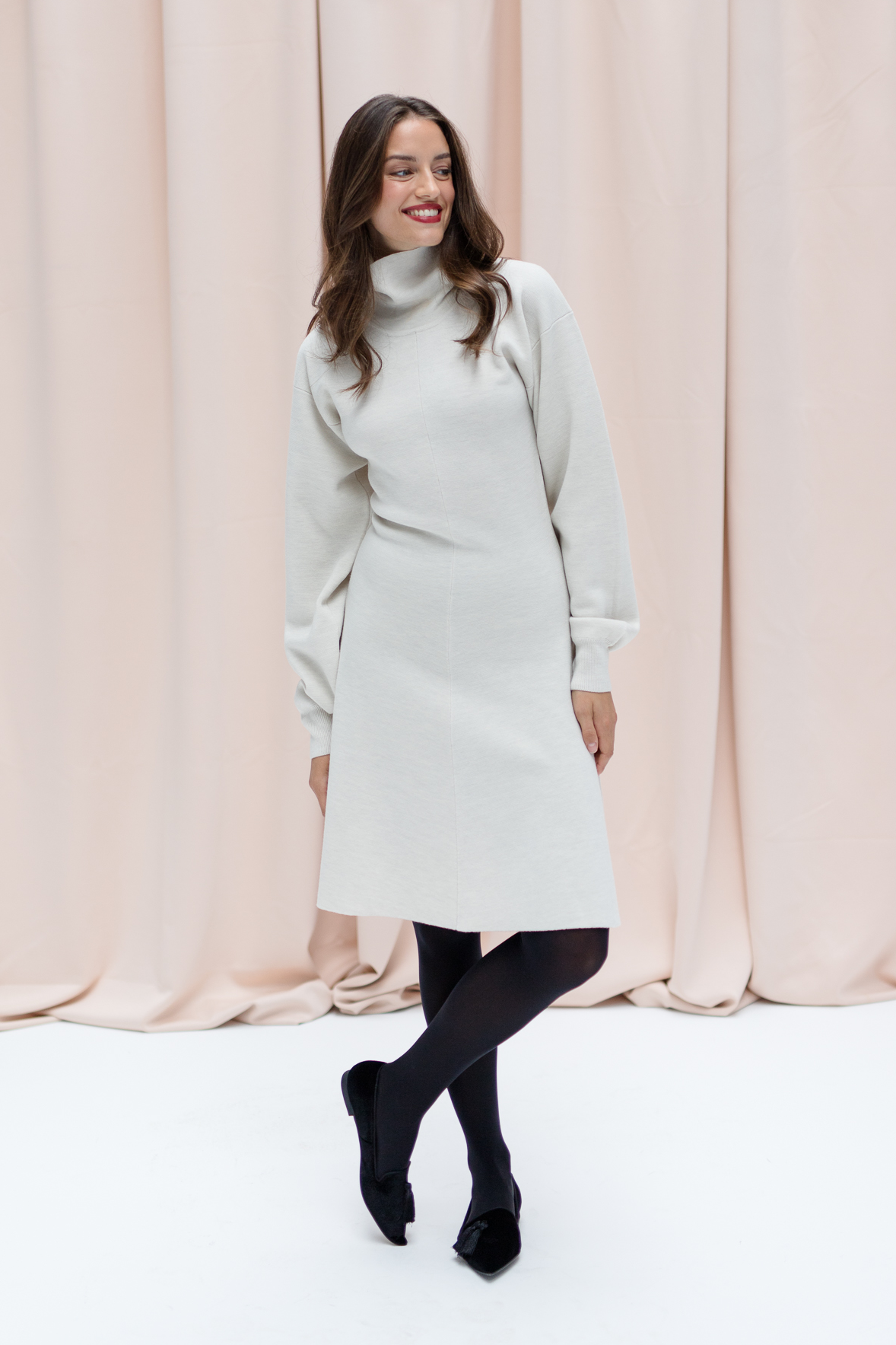 With KATE, we proudly present our very first knit dress – an elegant all-rounder that perfectly blends comfort and style. The stand-up collar adds a clean, modern touch, while the balloon sleeves bring a hint of drama. Its A-line silhouette gently skims the knees, offering a flattering and feminine fit. Made from soft, shape-retaining knit fabric, KATE not only feels incredibly comfortable but also opens up countless styling options.