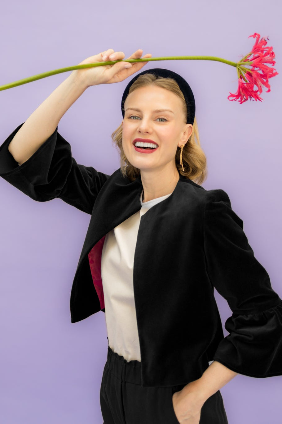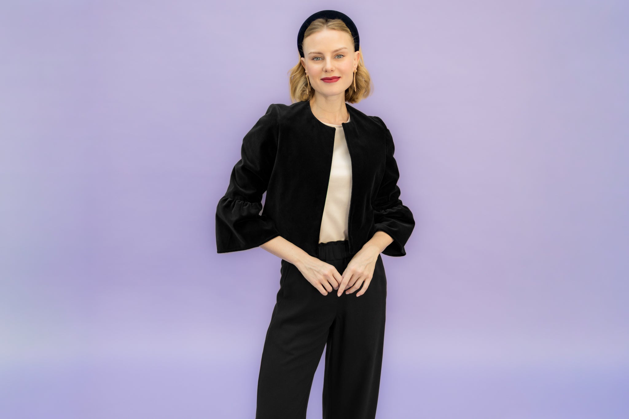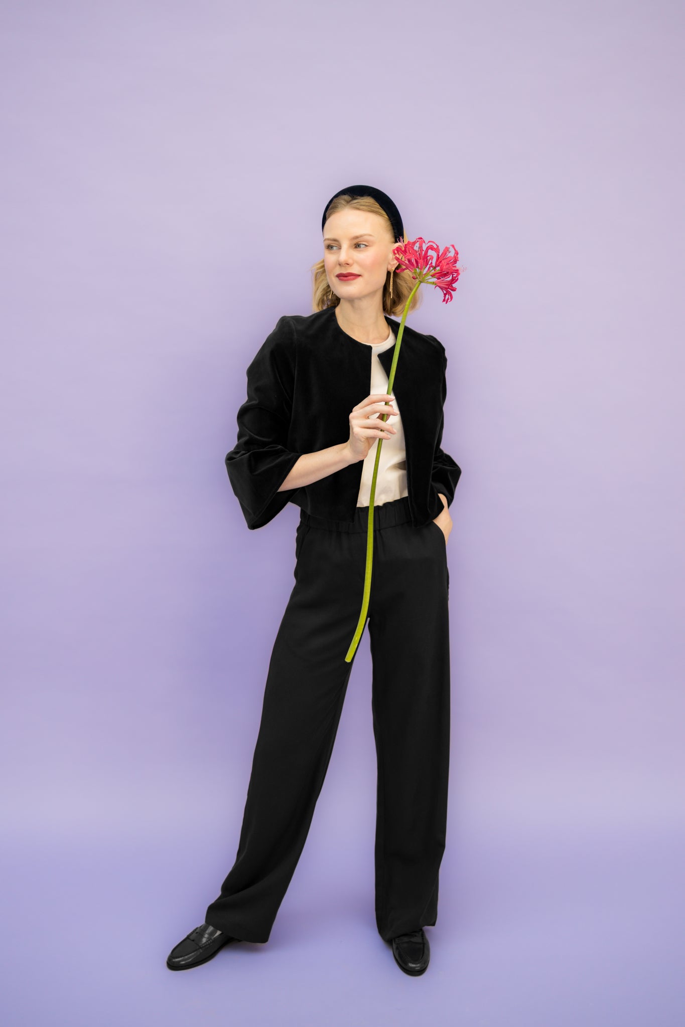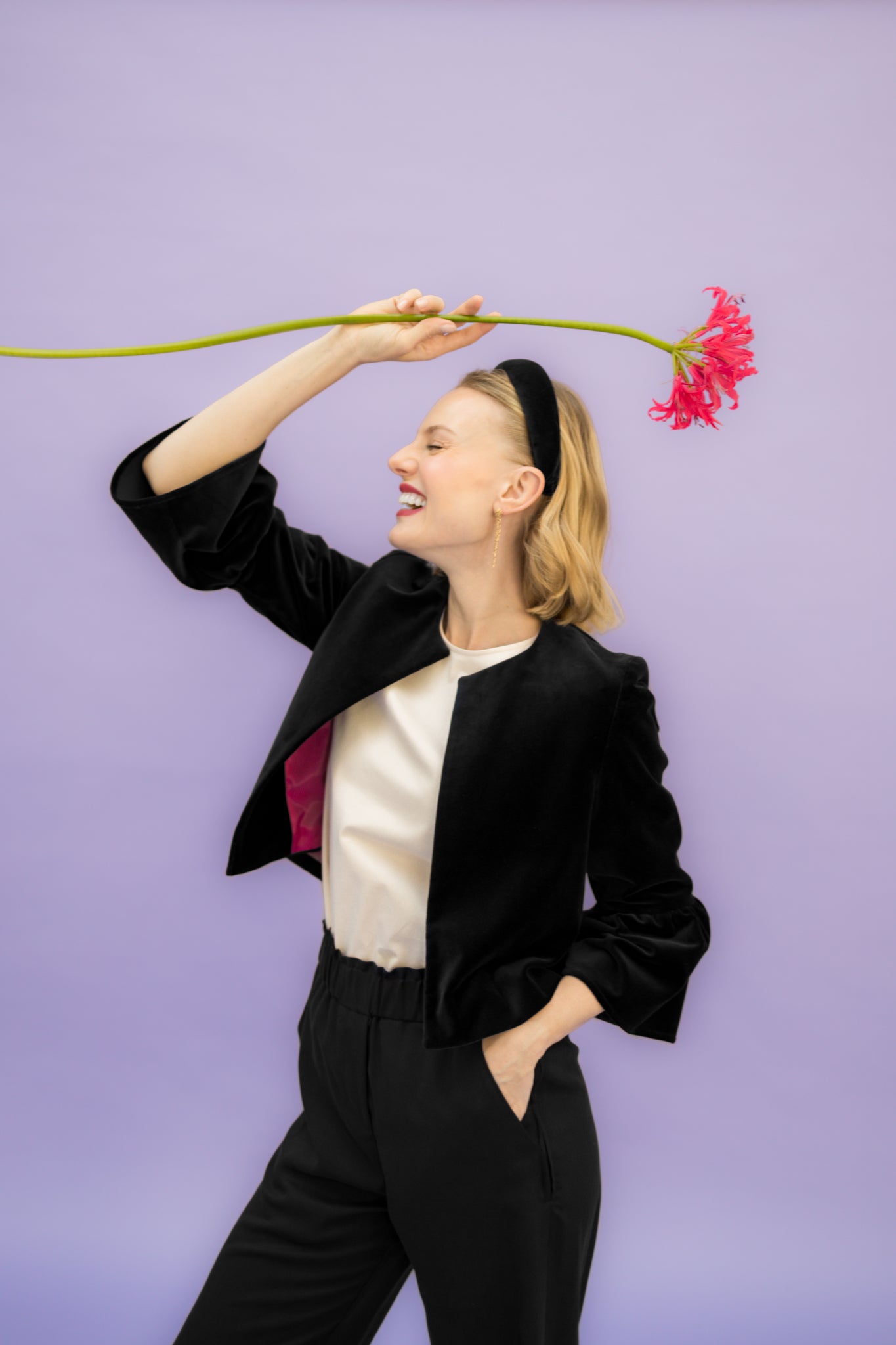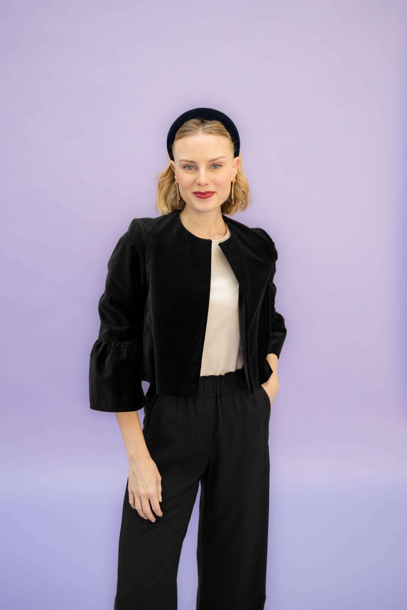 This open-front, short blazer is designed to add a touch of sophistication to any outfit. Featuring a playful pink lining and flounced sleeves, it combines elegance with a hint of fun. Perfect for both professional and casual settings, the KIM Blazer is your go-to piece for effortless style.