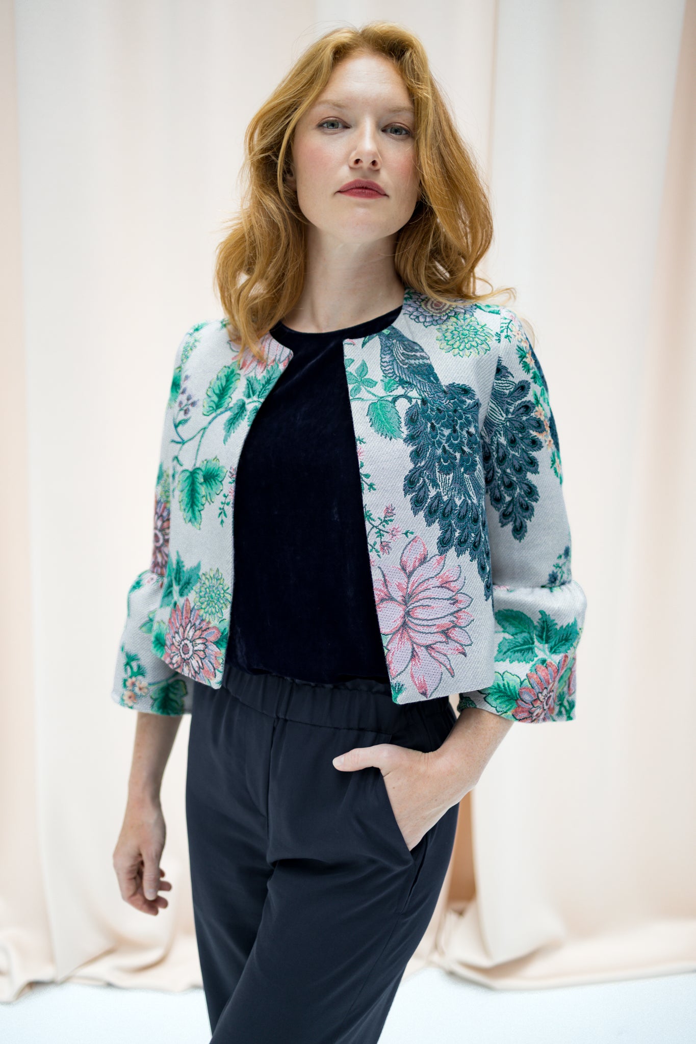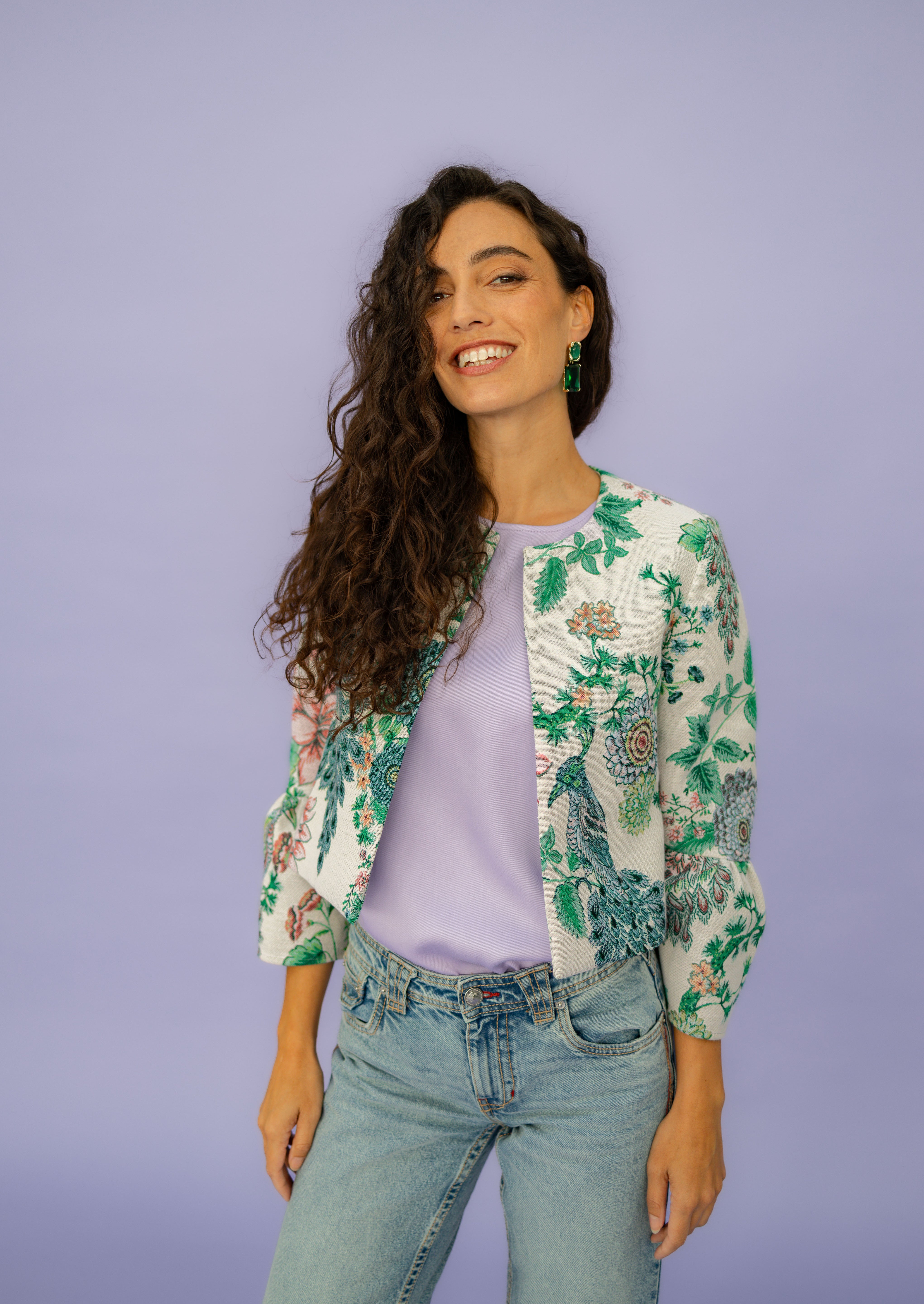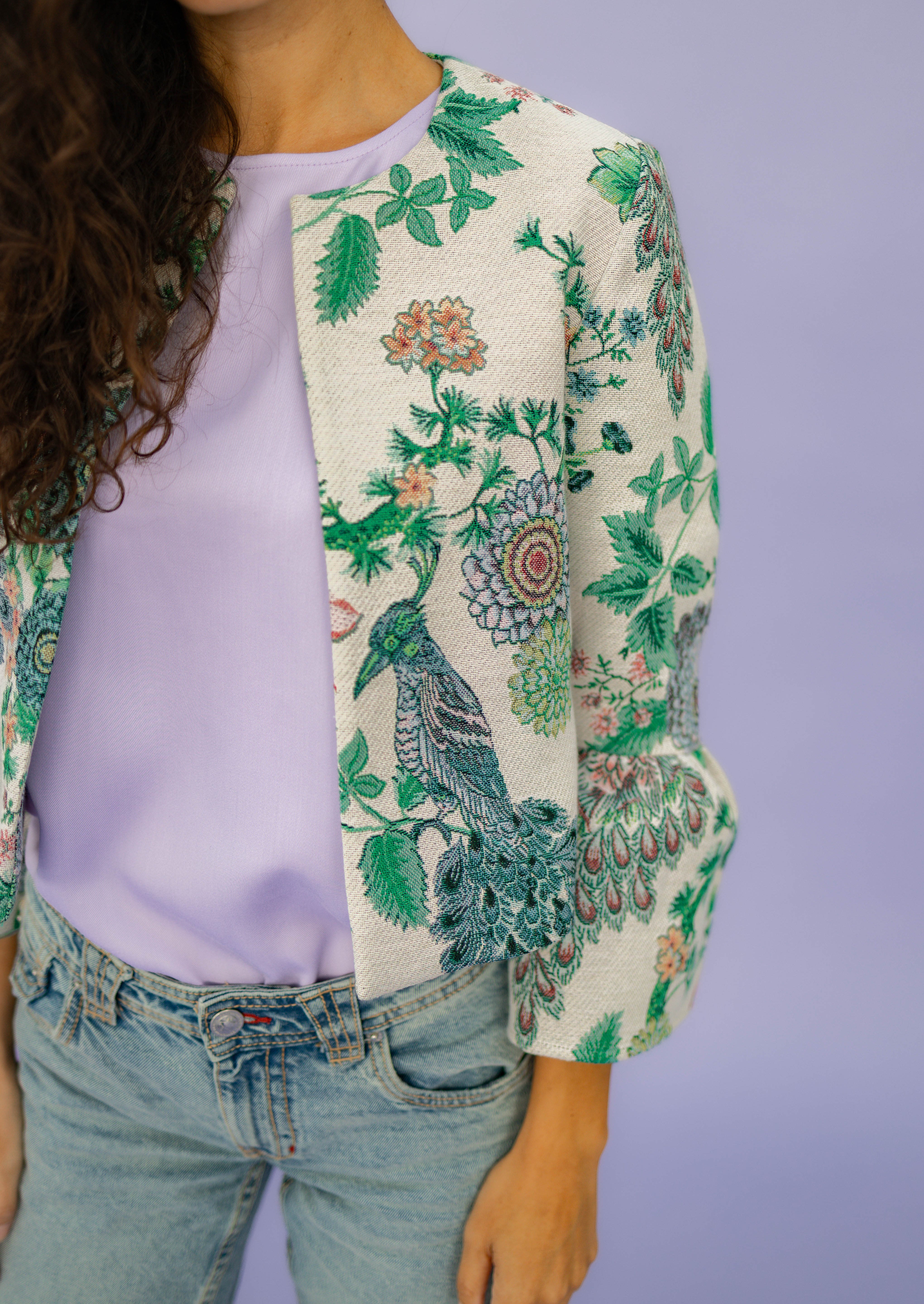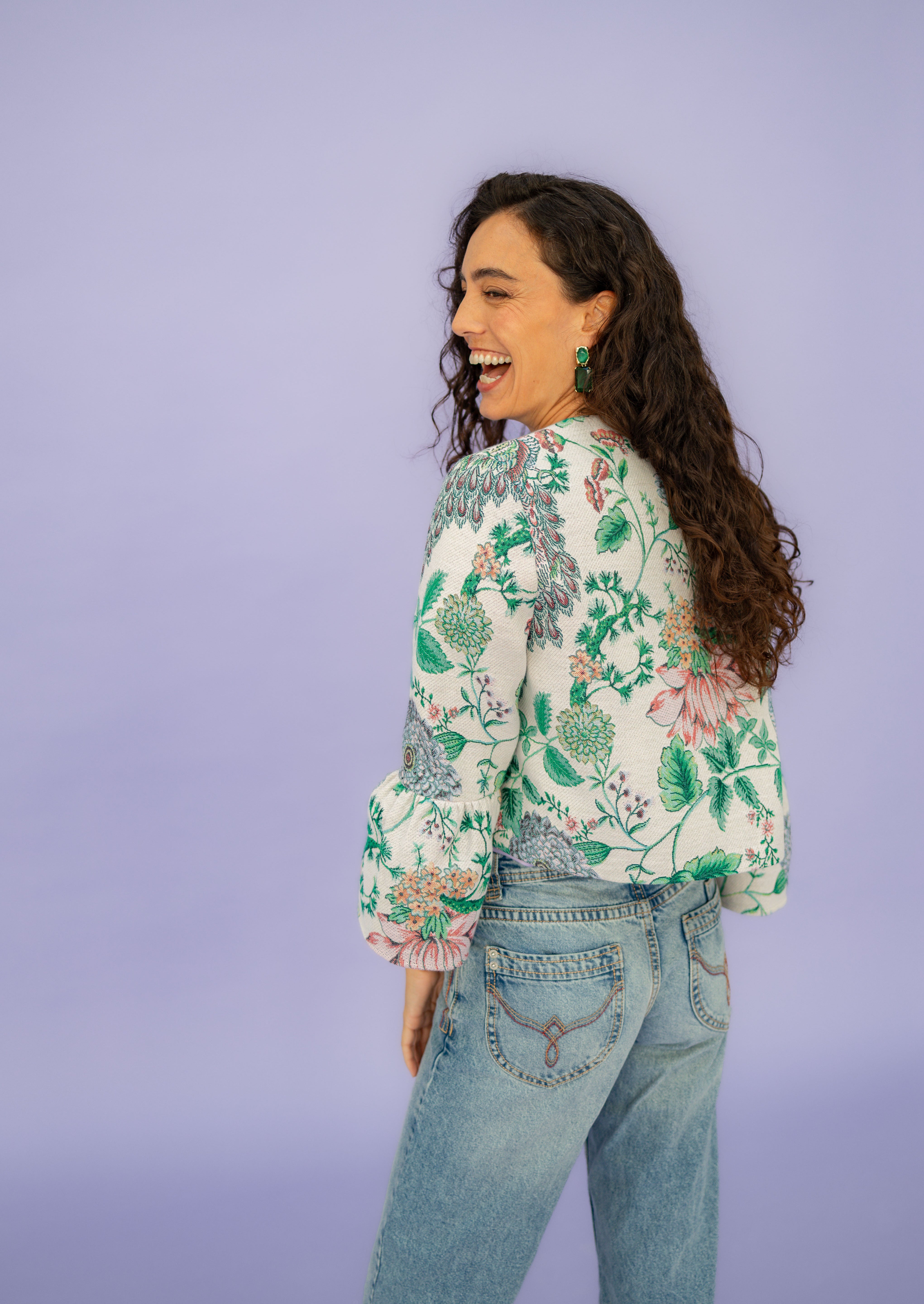 This open-front, short blazer is designed to add a touch of sophistication to any outfit. Featuring a playful pink lining and flounced sleeves, it combines elegance with a hint of fun. Perfect for both professional and casual settings, the KIM Blazer is your go-to piece for effortless style.
