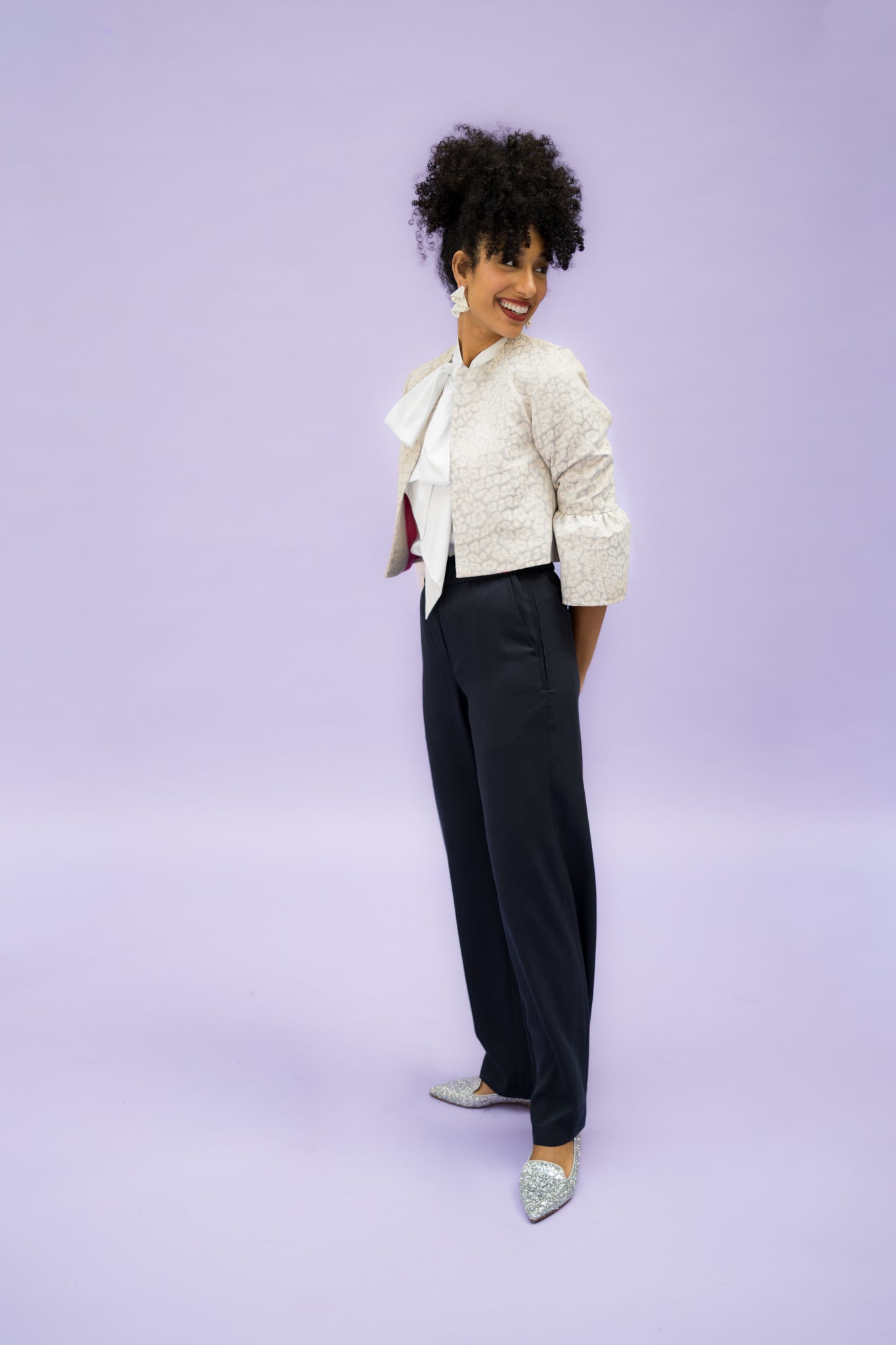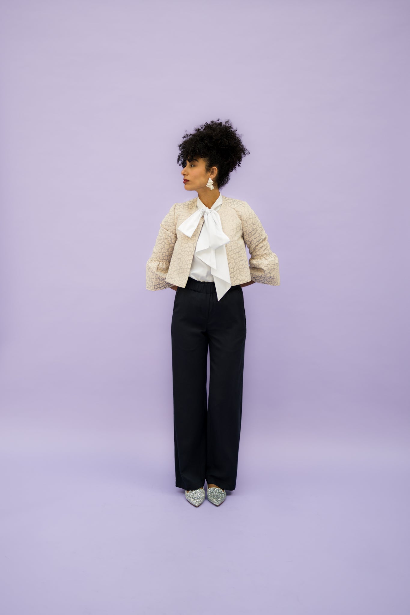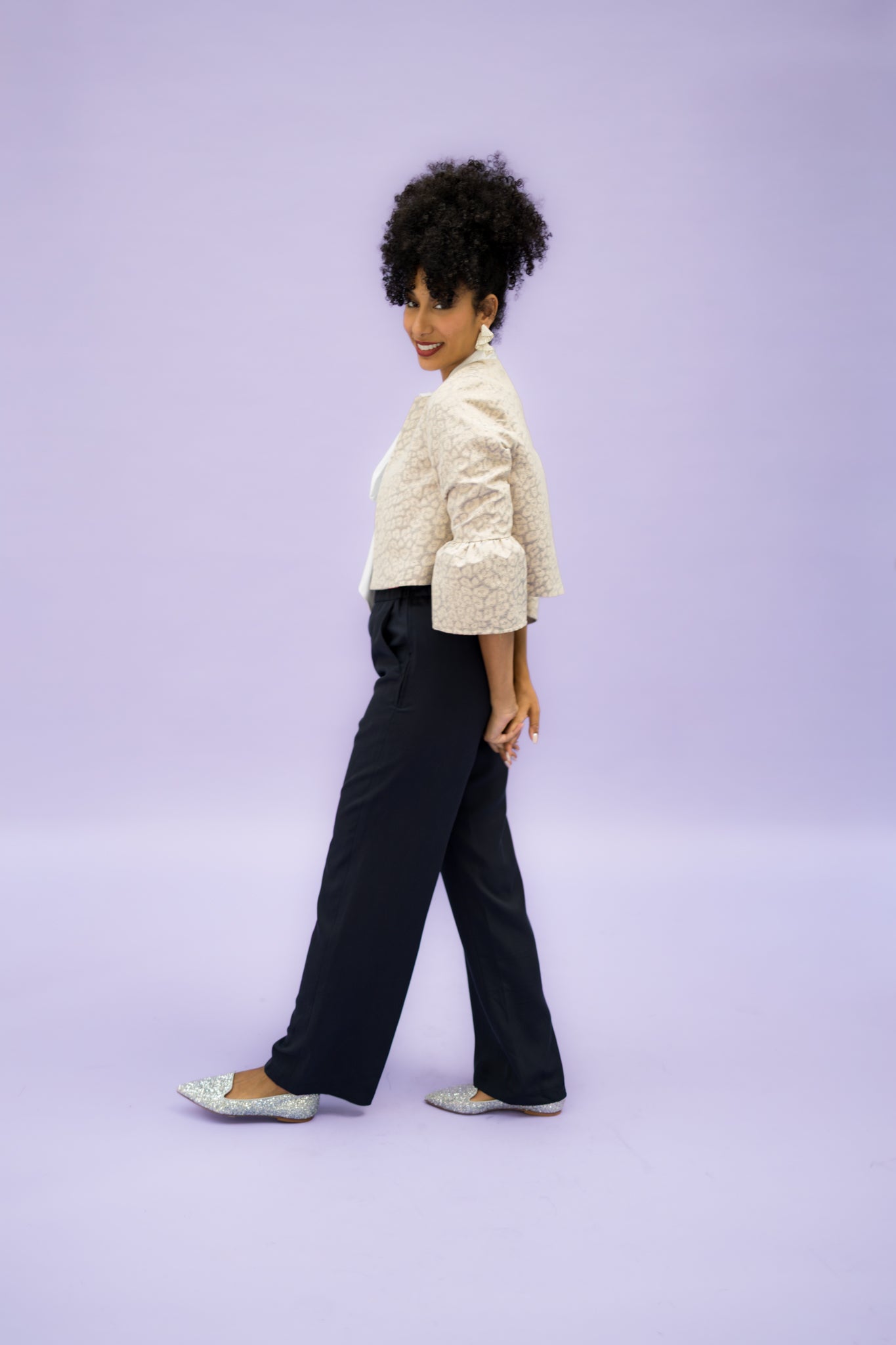 This open-front, short blazer is designed to add a touch of sophistication to any outfit. Featuring a playful pink lining and flounced sleeves, it combines elegance with a hint of fun. Perfect for both professional and casual settings, the KIM Blazer is your go-to piece for effortless style.
