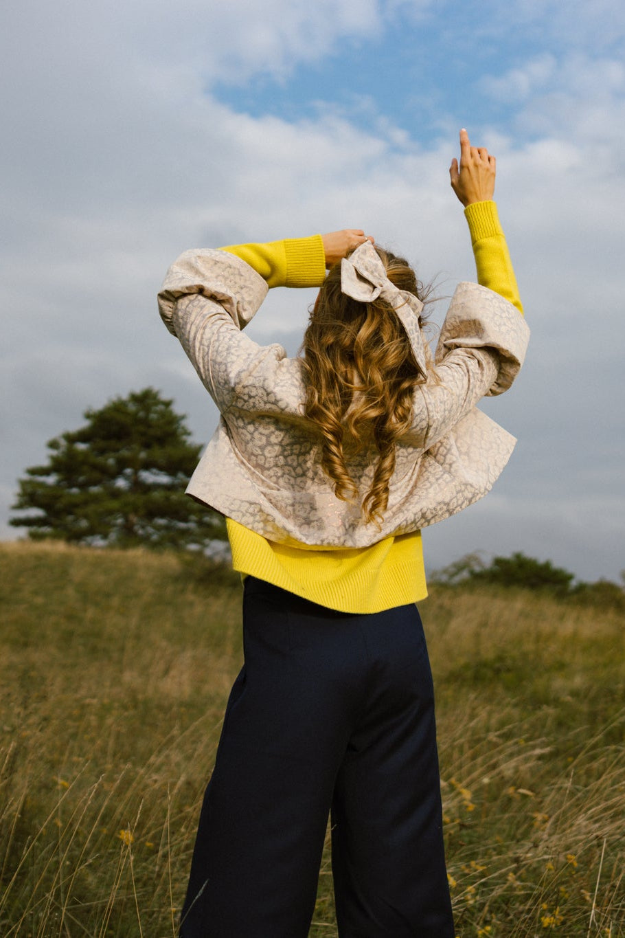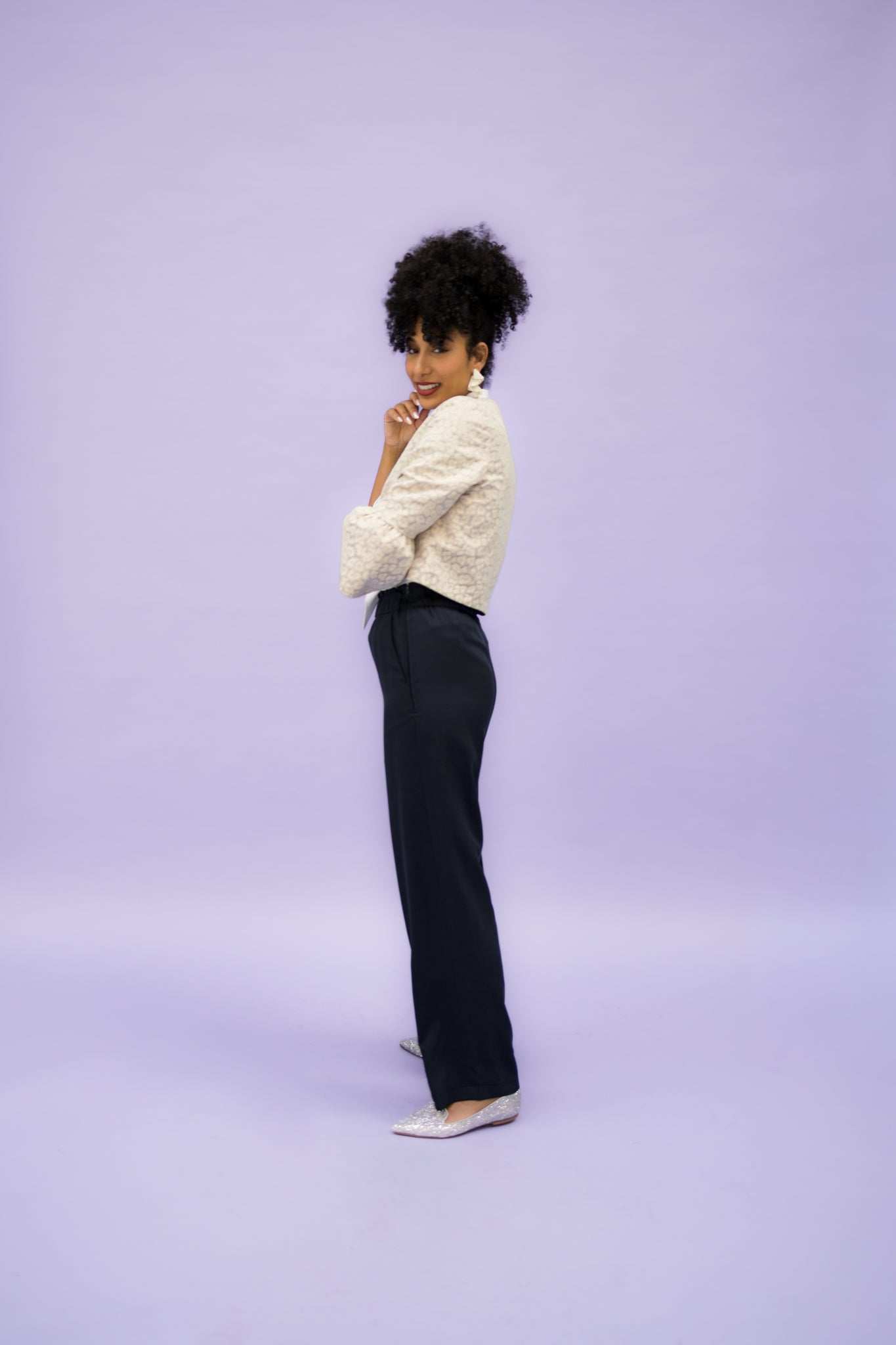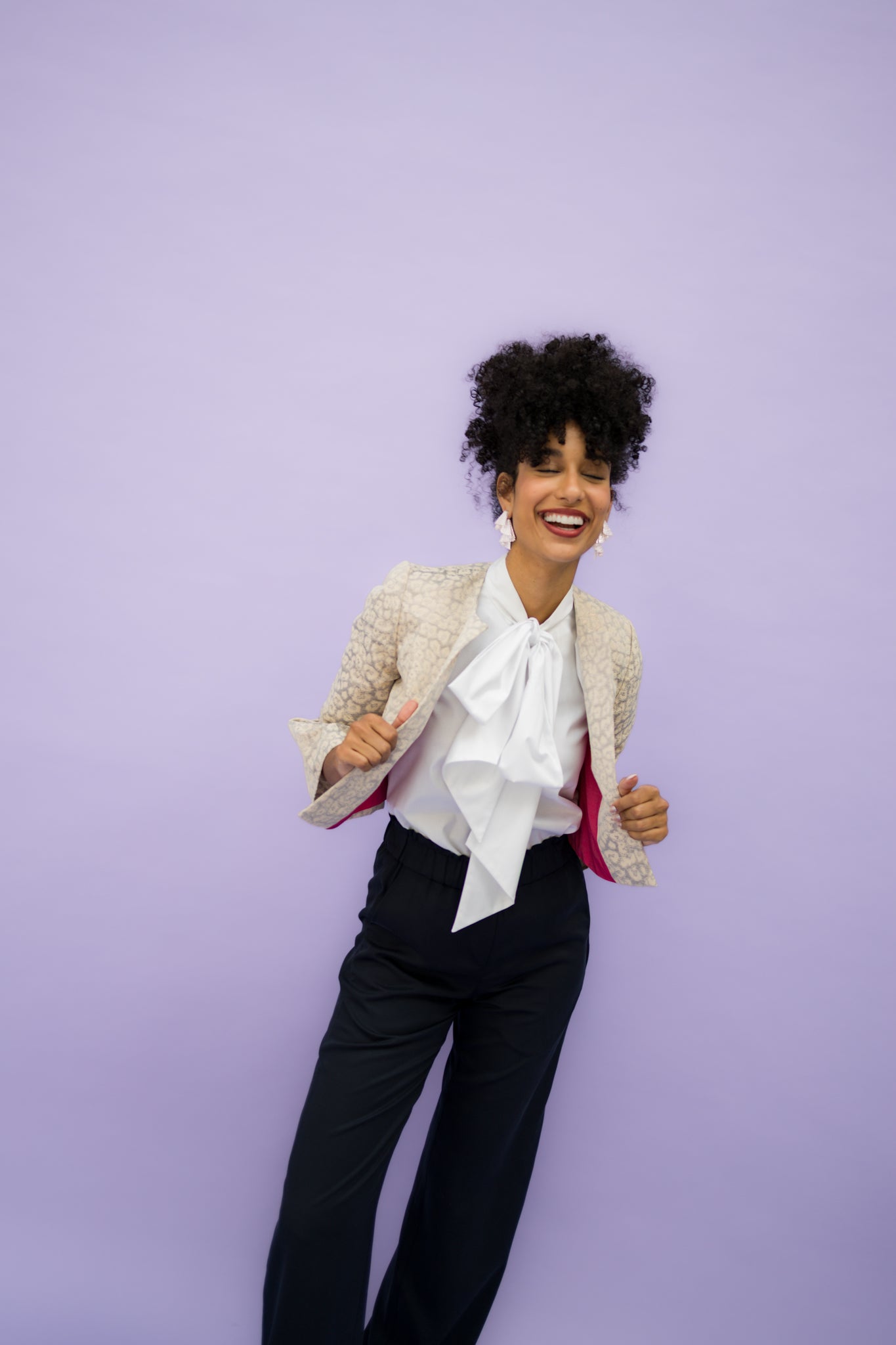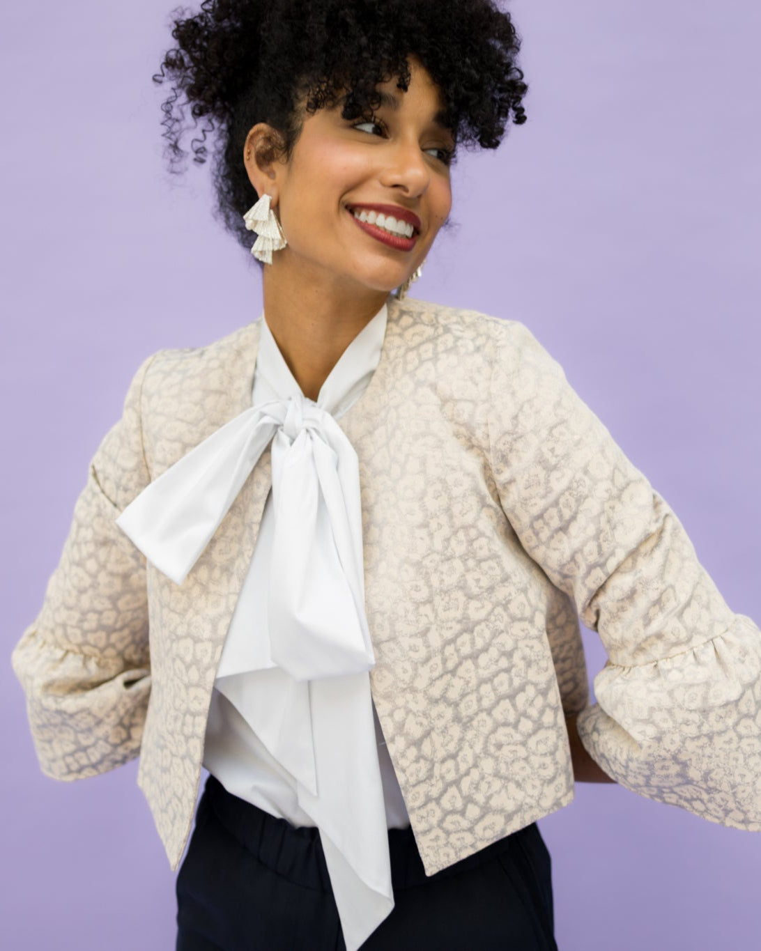 This open-front, short blazer is designed to add a touch of sophistication to any outfit. Featuring a playful pink lining and flounced sleeves, it combines elegance with a hint of fun. Perfect for both professional and casual settings, the KIM Blazer is your go-to piece for effortless style.