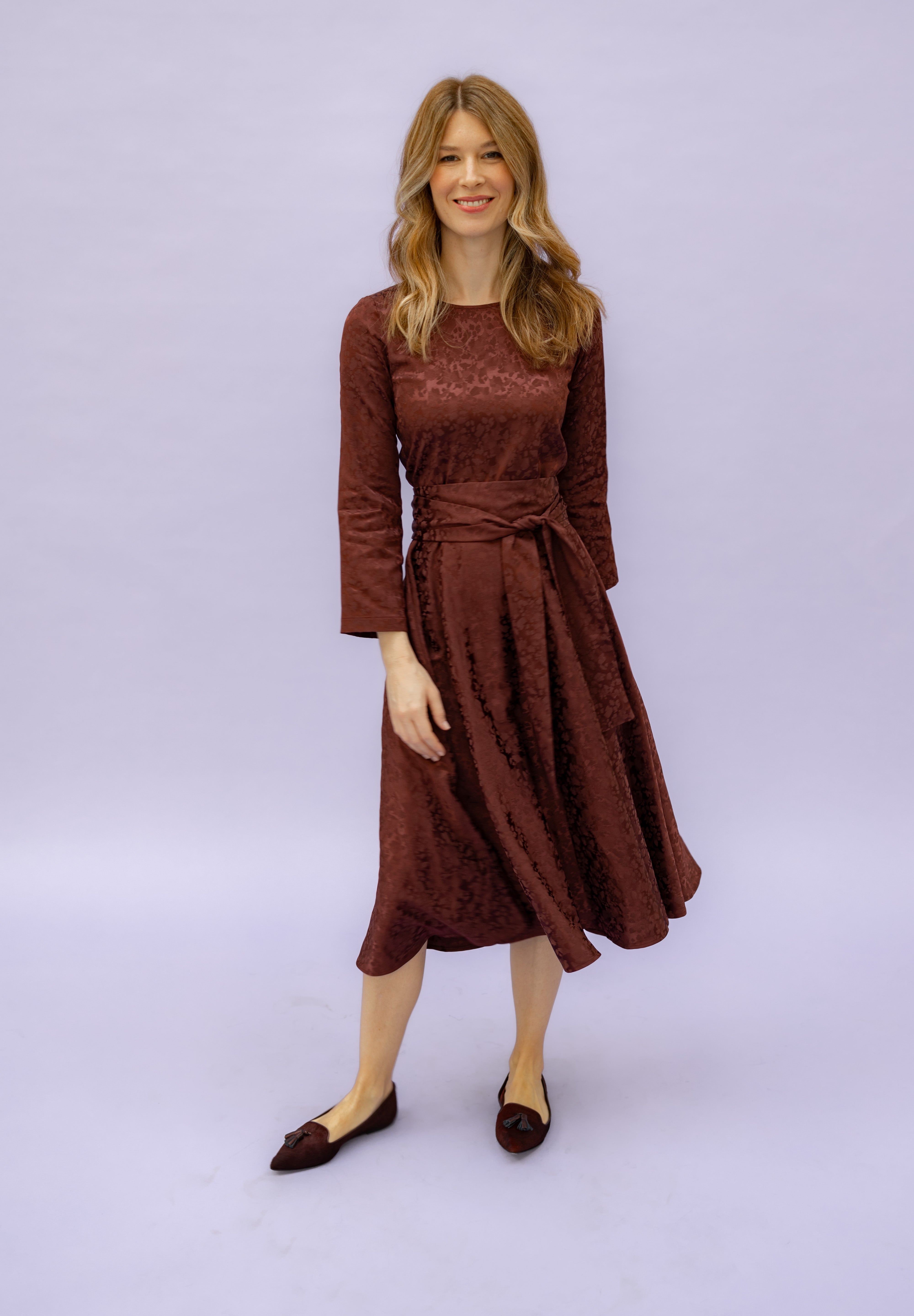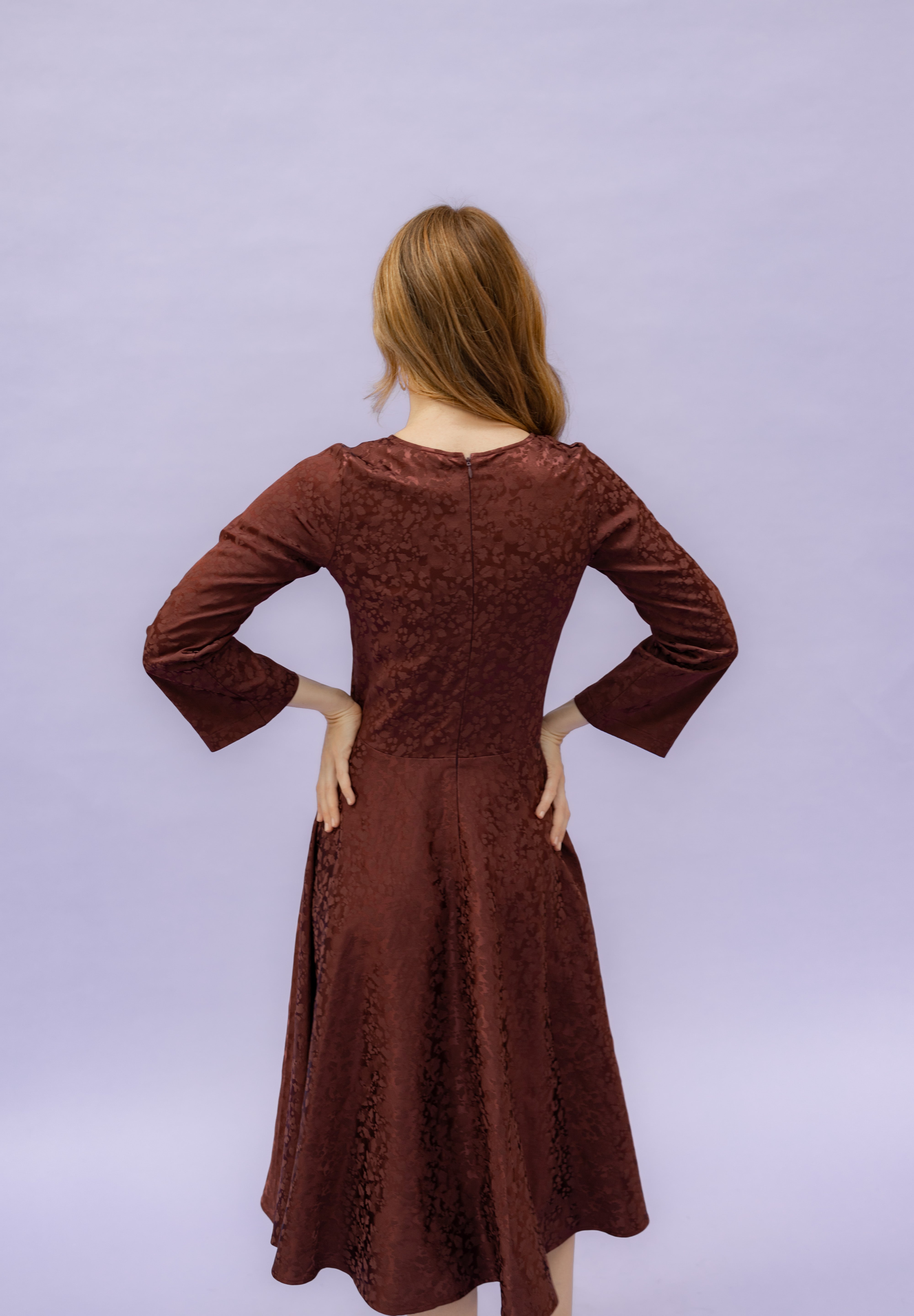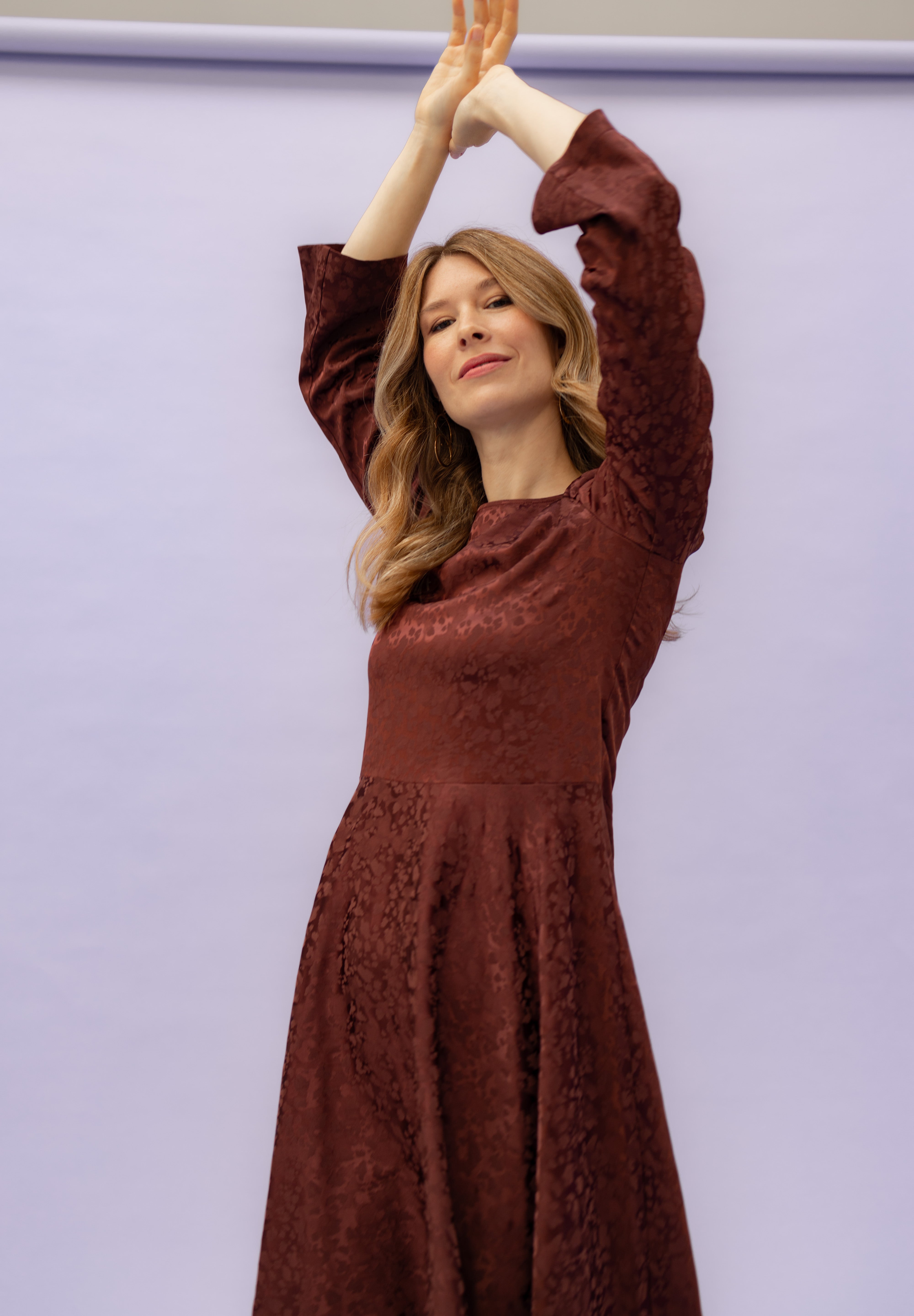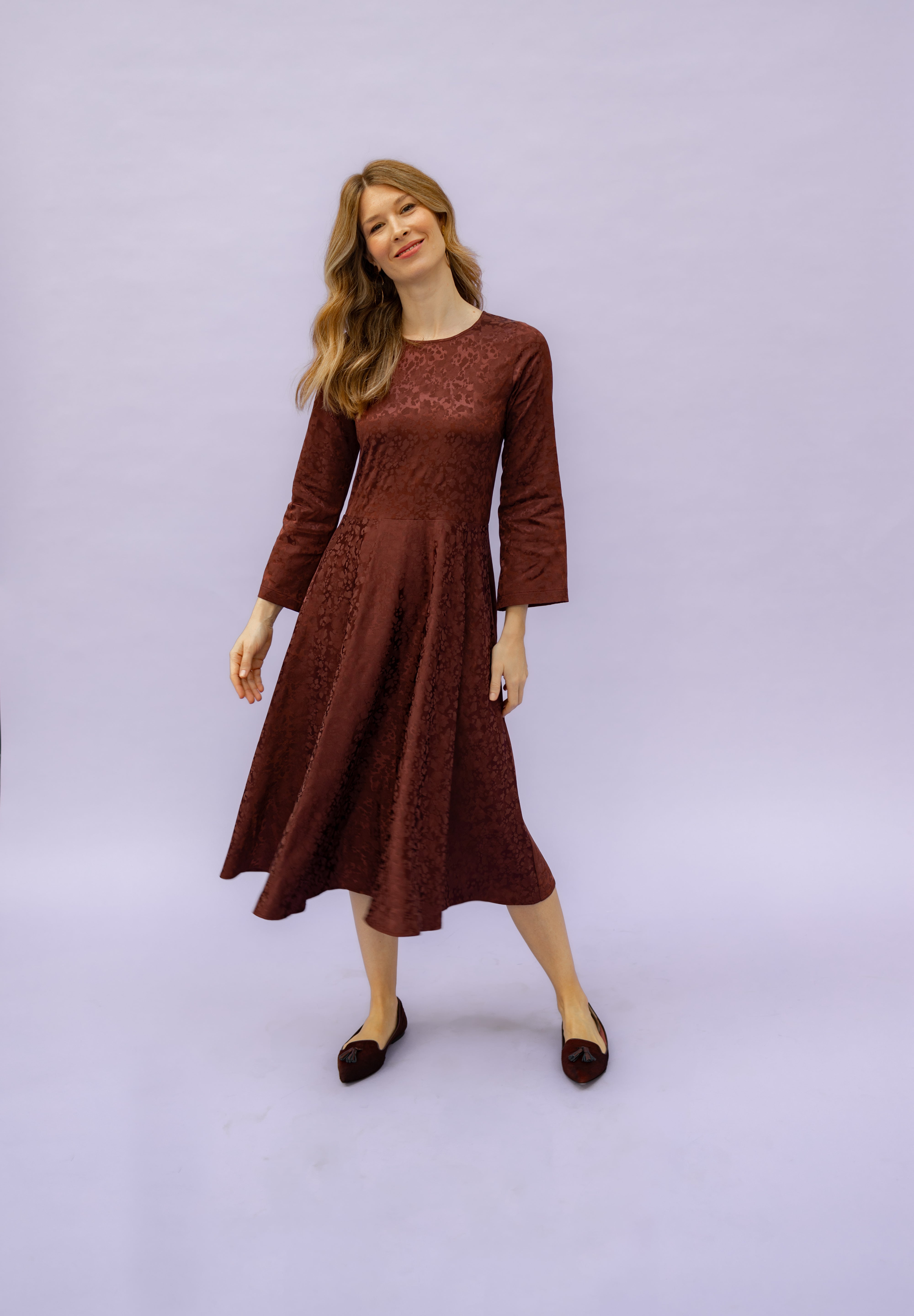 LAURA is a chic midi dress that flatters the figure with its elegant waist seam and flared swinging flounce skirt. The slightly flared trumpet sleeves add a special, feminine touch to the design. Perfect for any occasion, it combines timeless sophistication with a modern, playful accent.