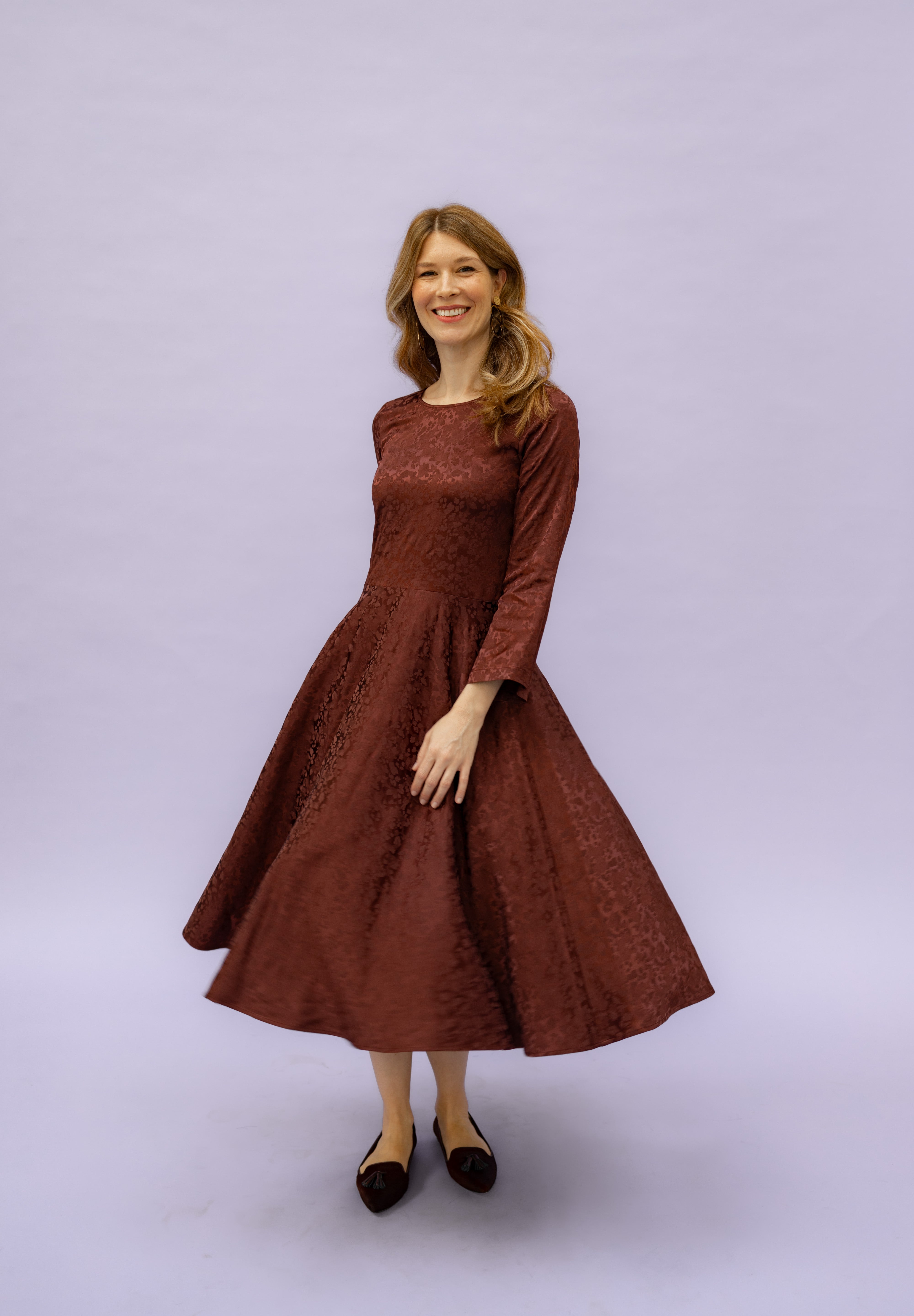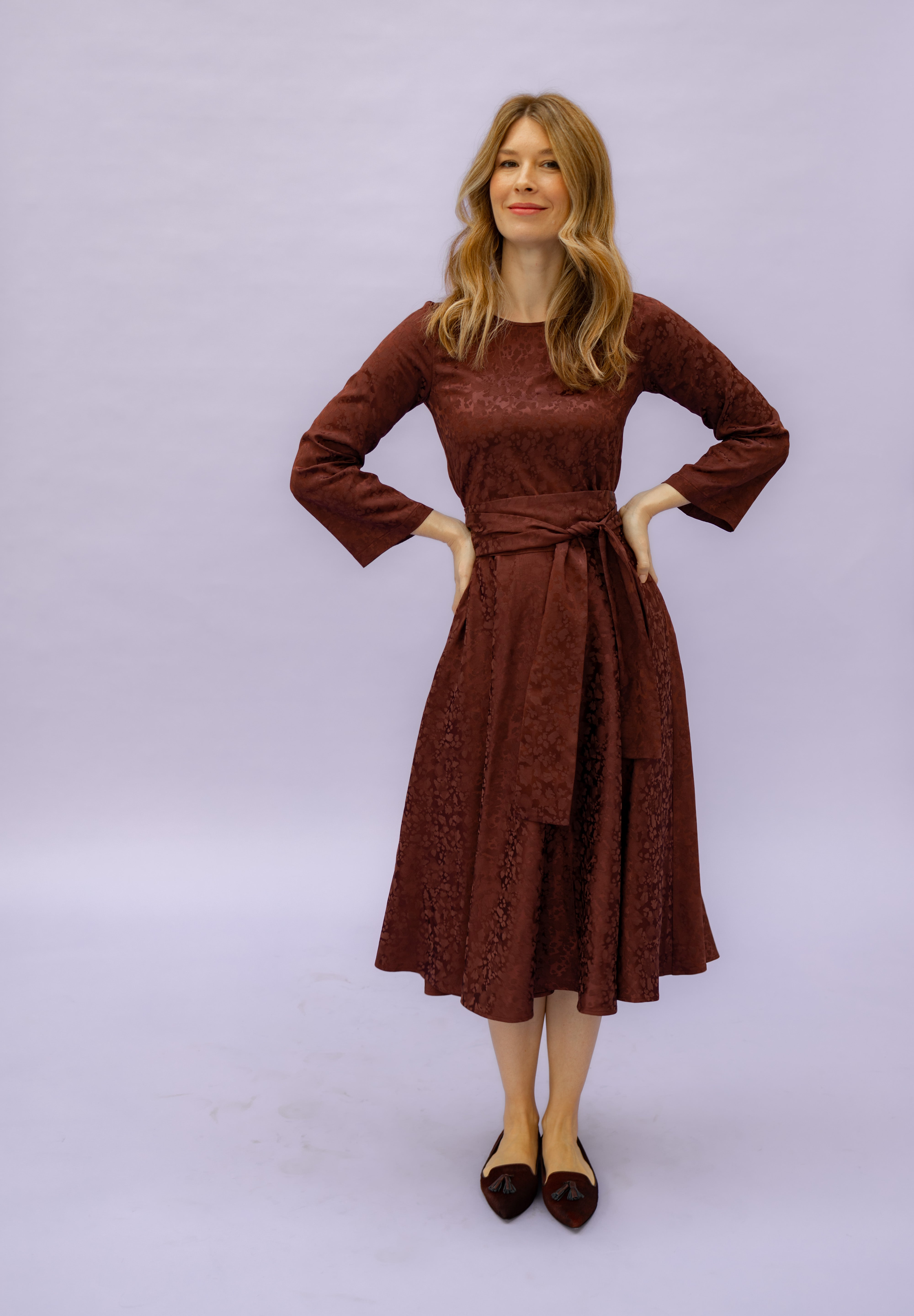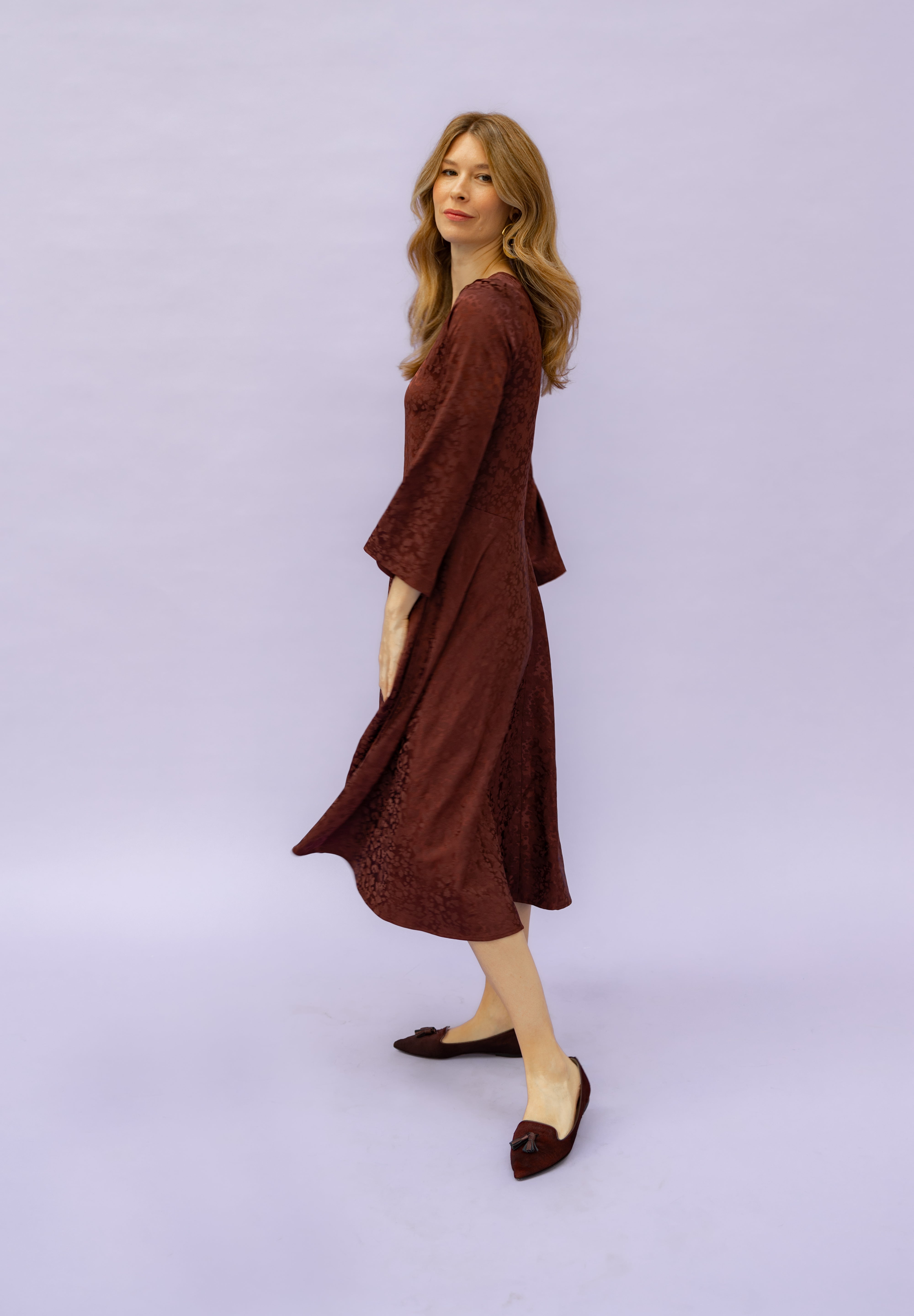 LAURA is a chic midi dress that flatters the figure with its elegant waist seam and flared swinging flounce skirt. The slightly flared trumpet sleeves add a special, feminine touch to the design. Perfect for any occasion, it combines timeless sophistication with a modern, playful accent.