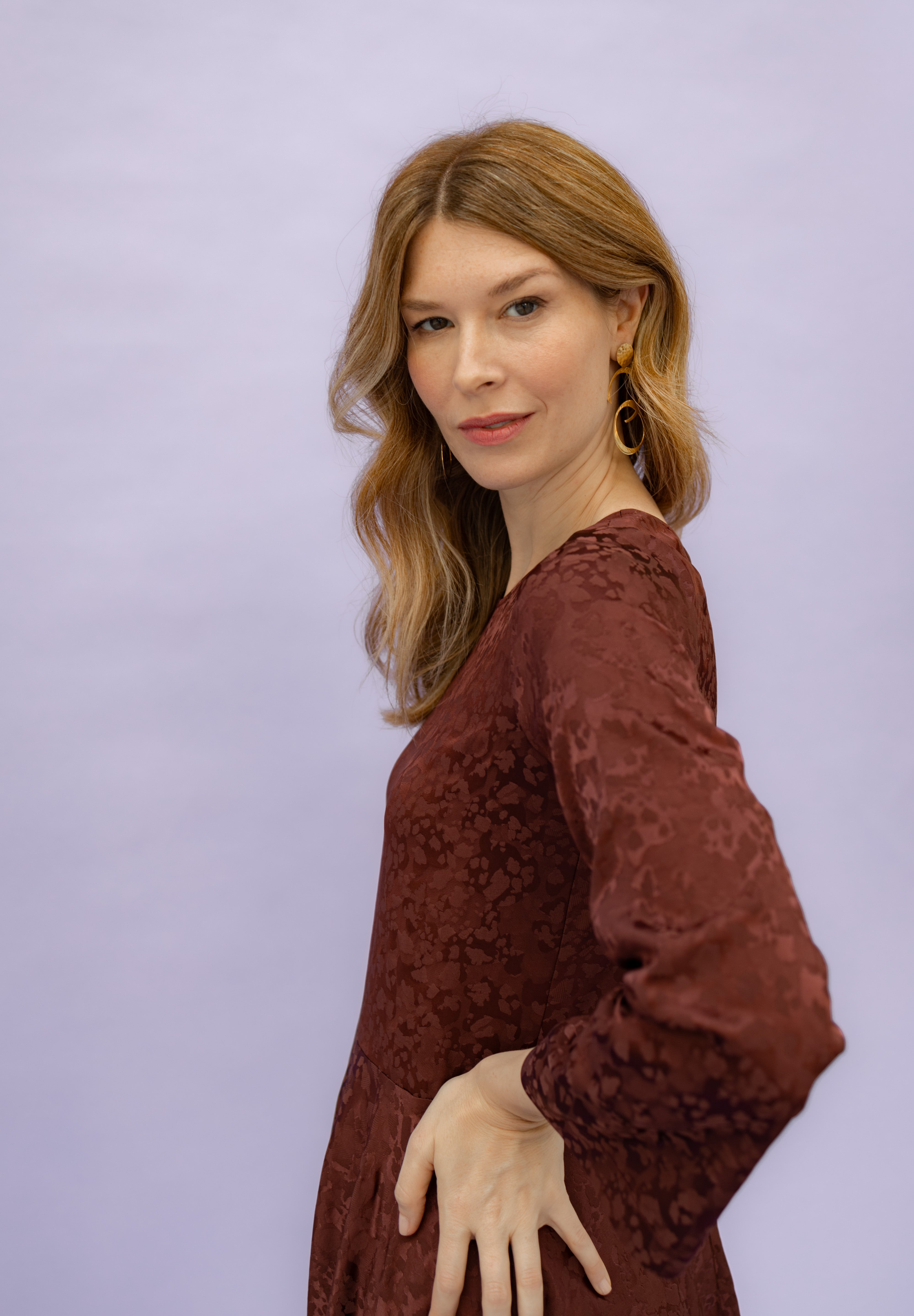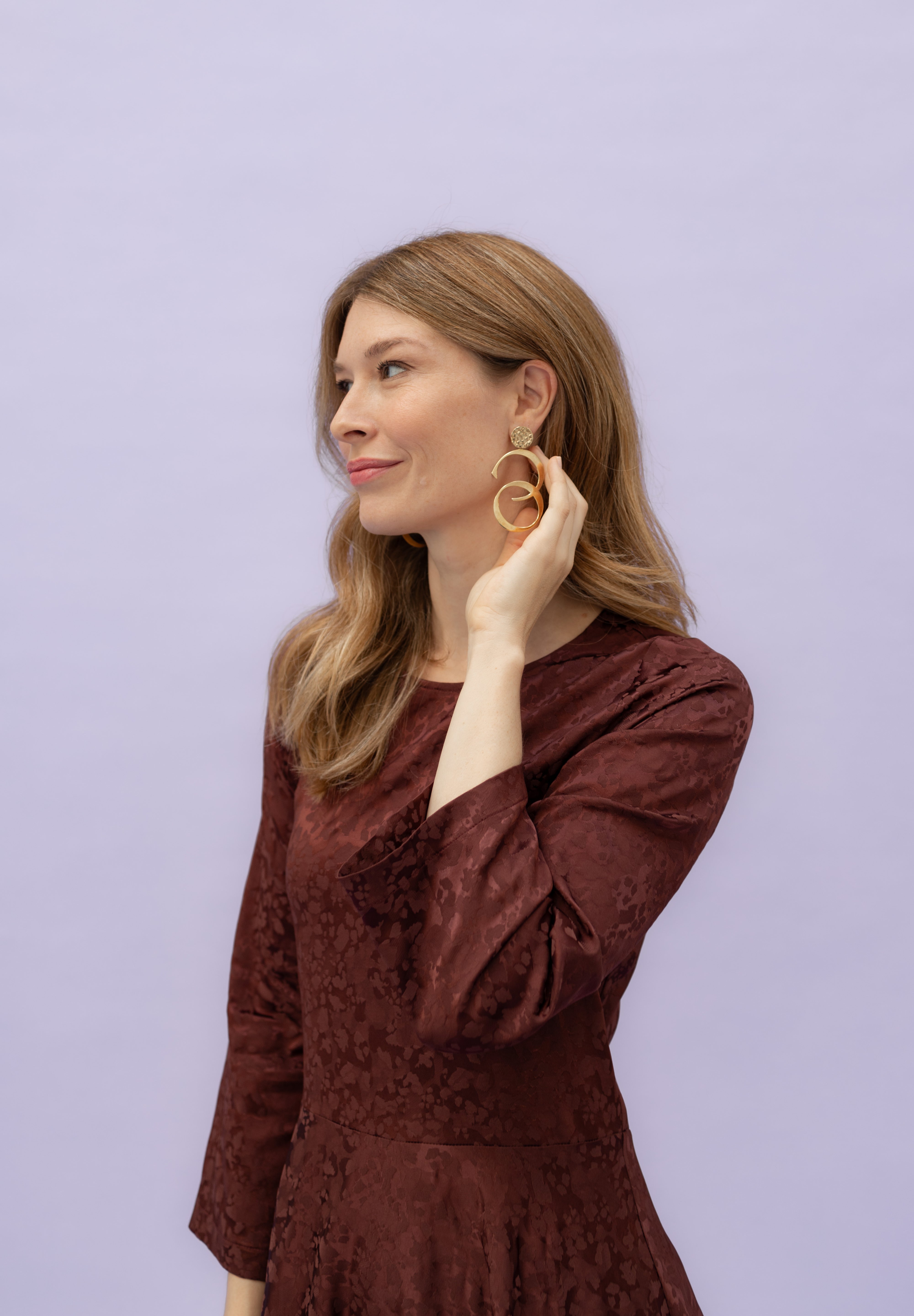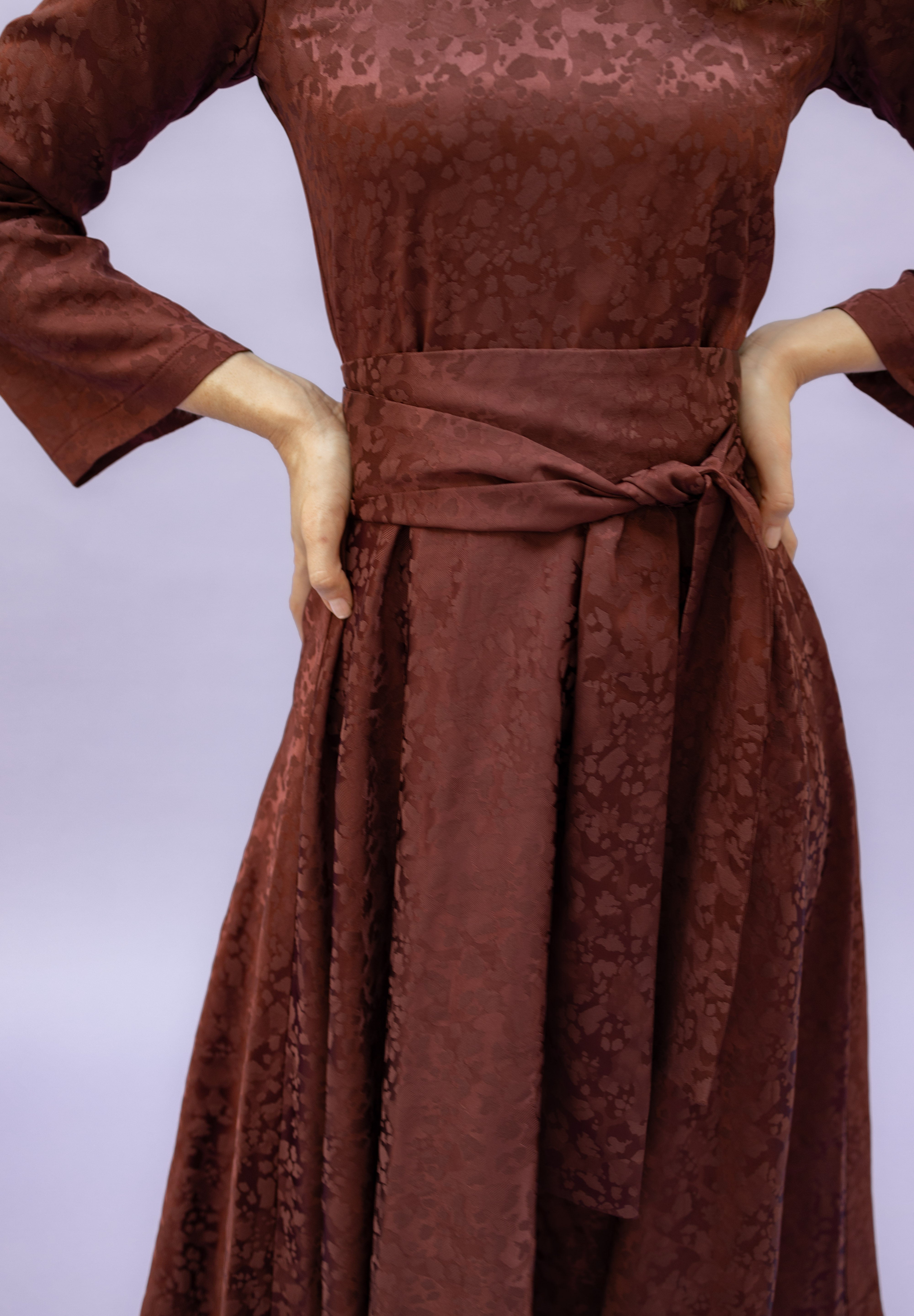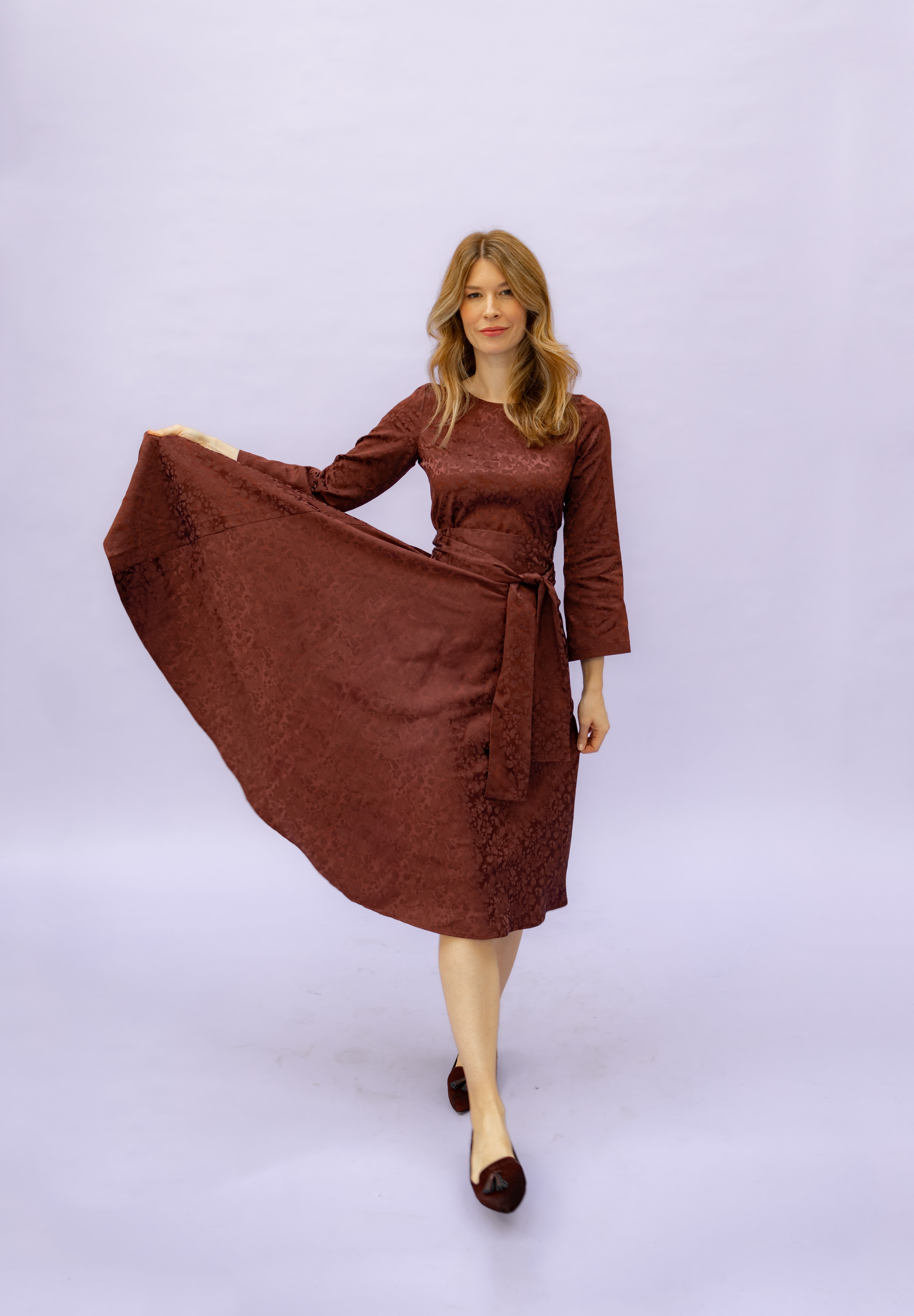LAURA is a chic midi dress that flatters the figure with its elegant waist seam and flared swinging flounce skirt. The slightly flared trumpet sleeves add a special, feminine touch to the design. Perfect for any occasion, it combines timeless sophistication with a modern, playful accent.
