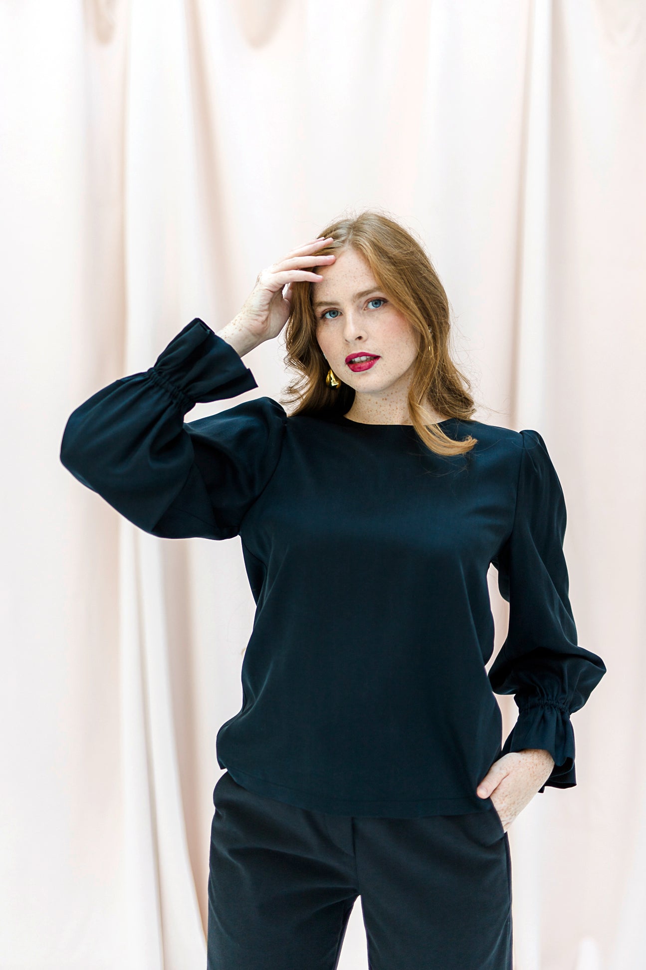 The LOLA blouse brings the ultimate WOW factor. With its long, ruffled sleeves and straight silhouette, LOLA combines a feminine touch with a modern edge. Perfectly styled with our skirts or pants for a standout ensemble.