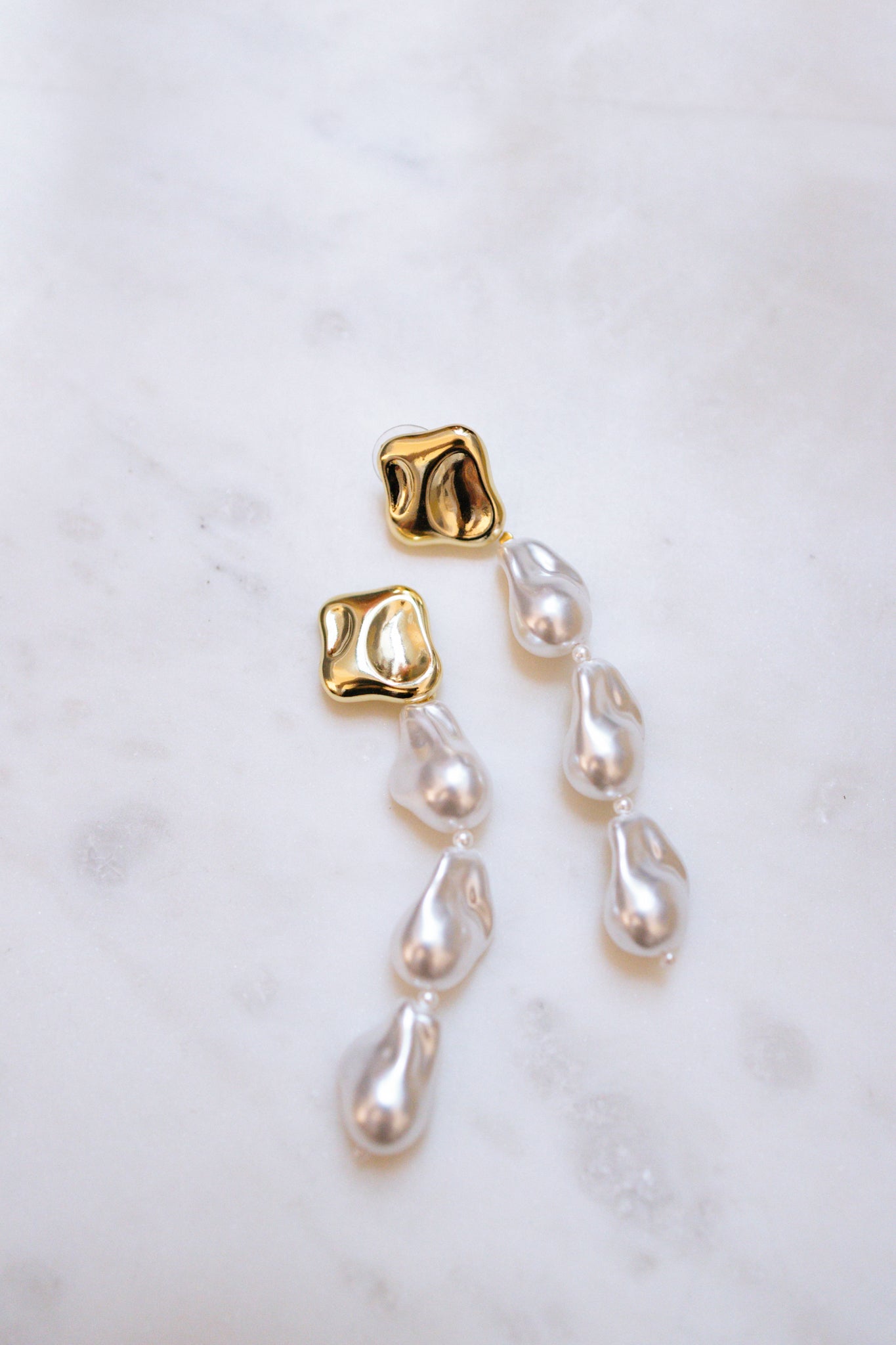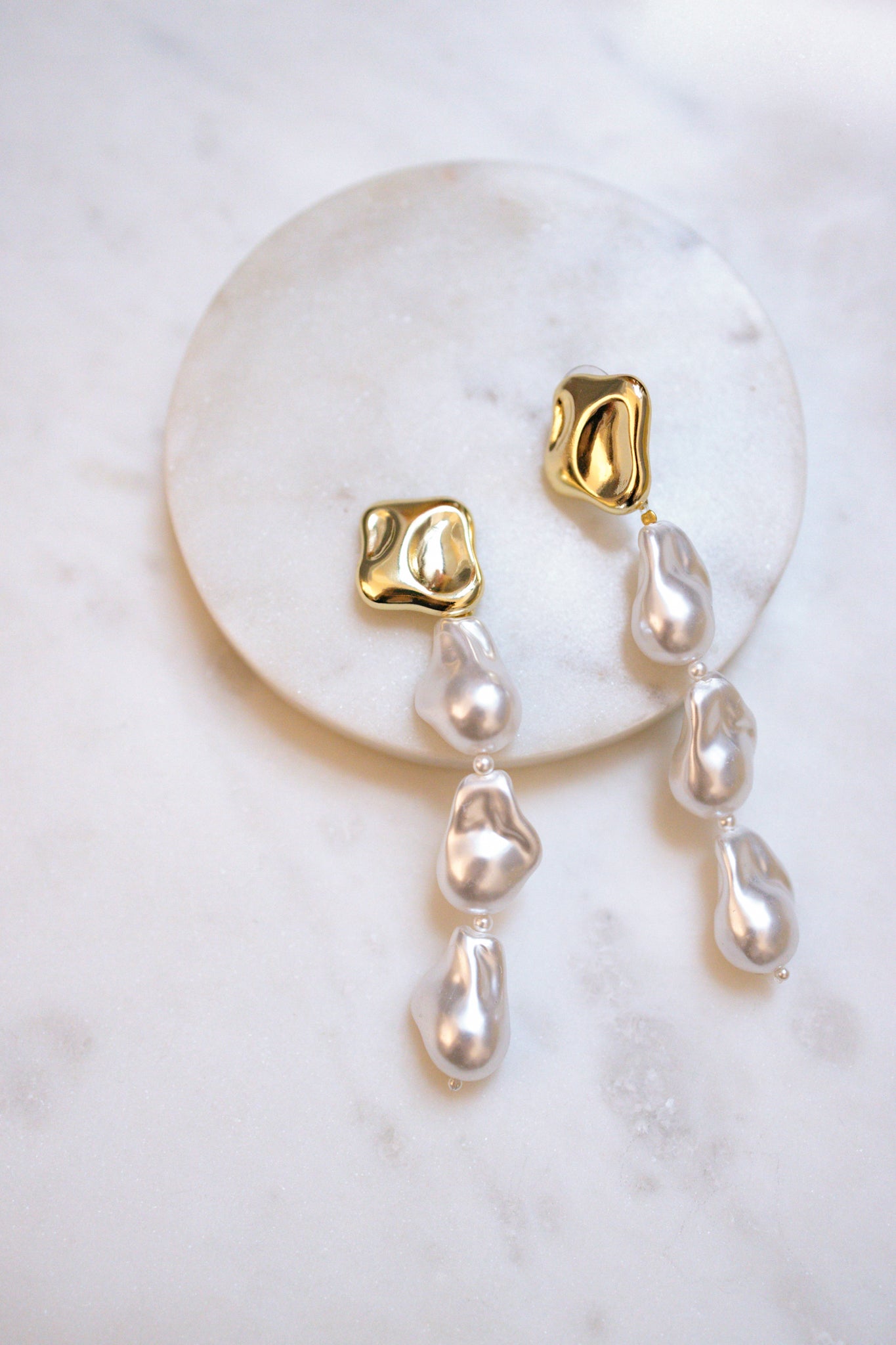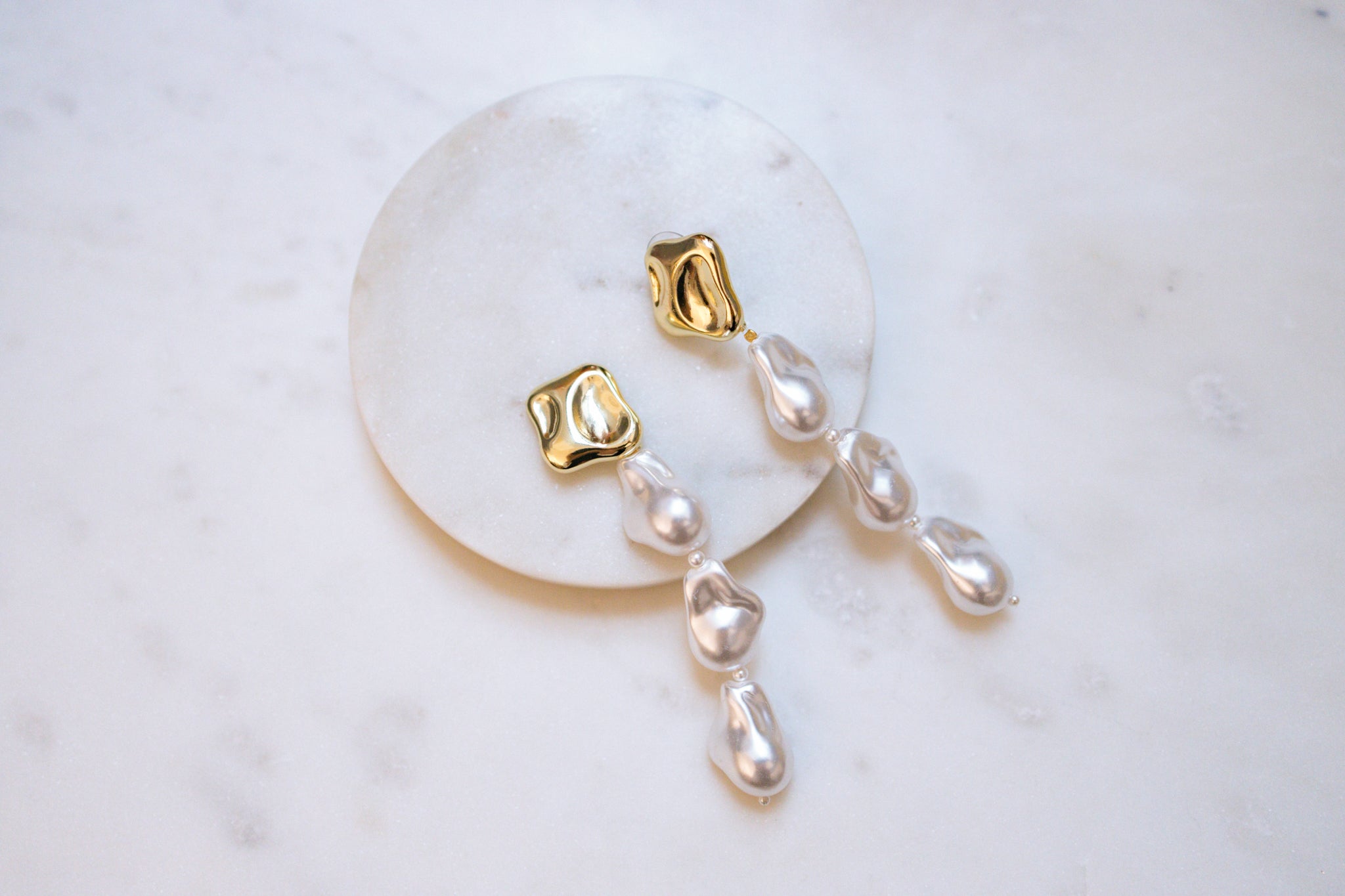 RINA Pearl earrings – simple, elegant, and timeless. Made from gold-plated bronze and adorned with delicate faux pearls, these studs add a touch of sophistication to any outfit. Approximately 9 cm long.