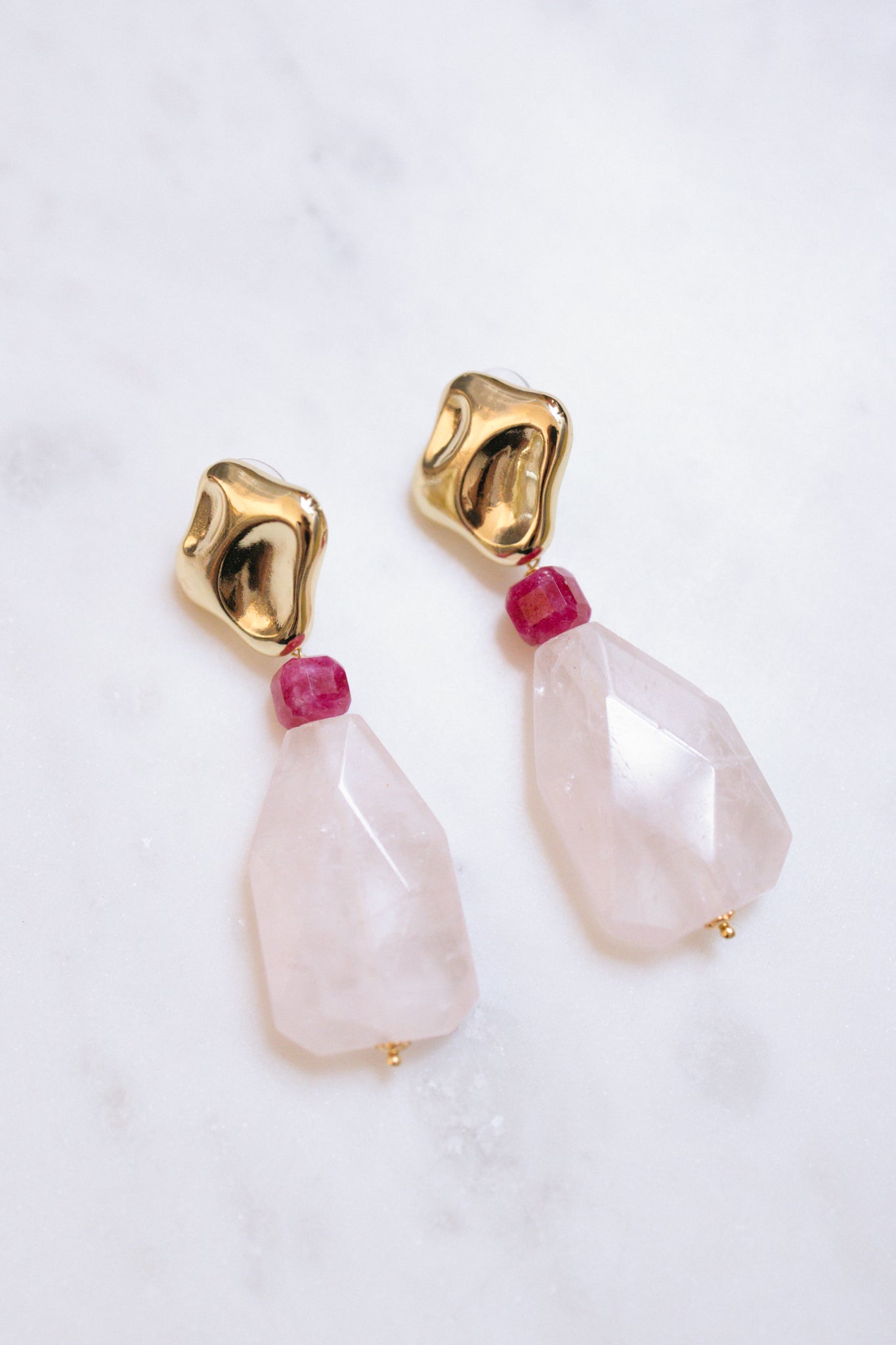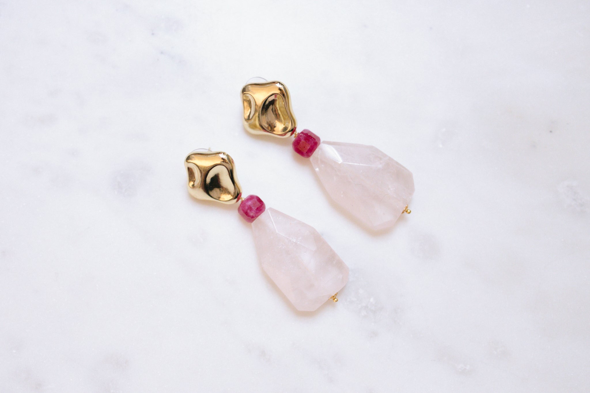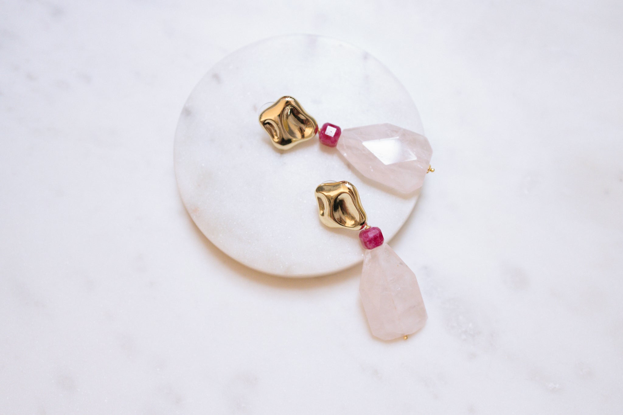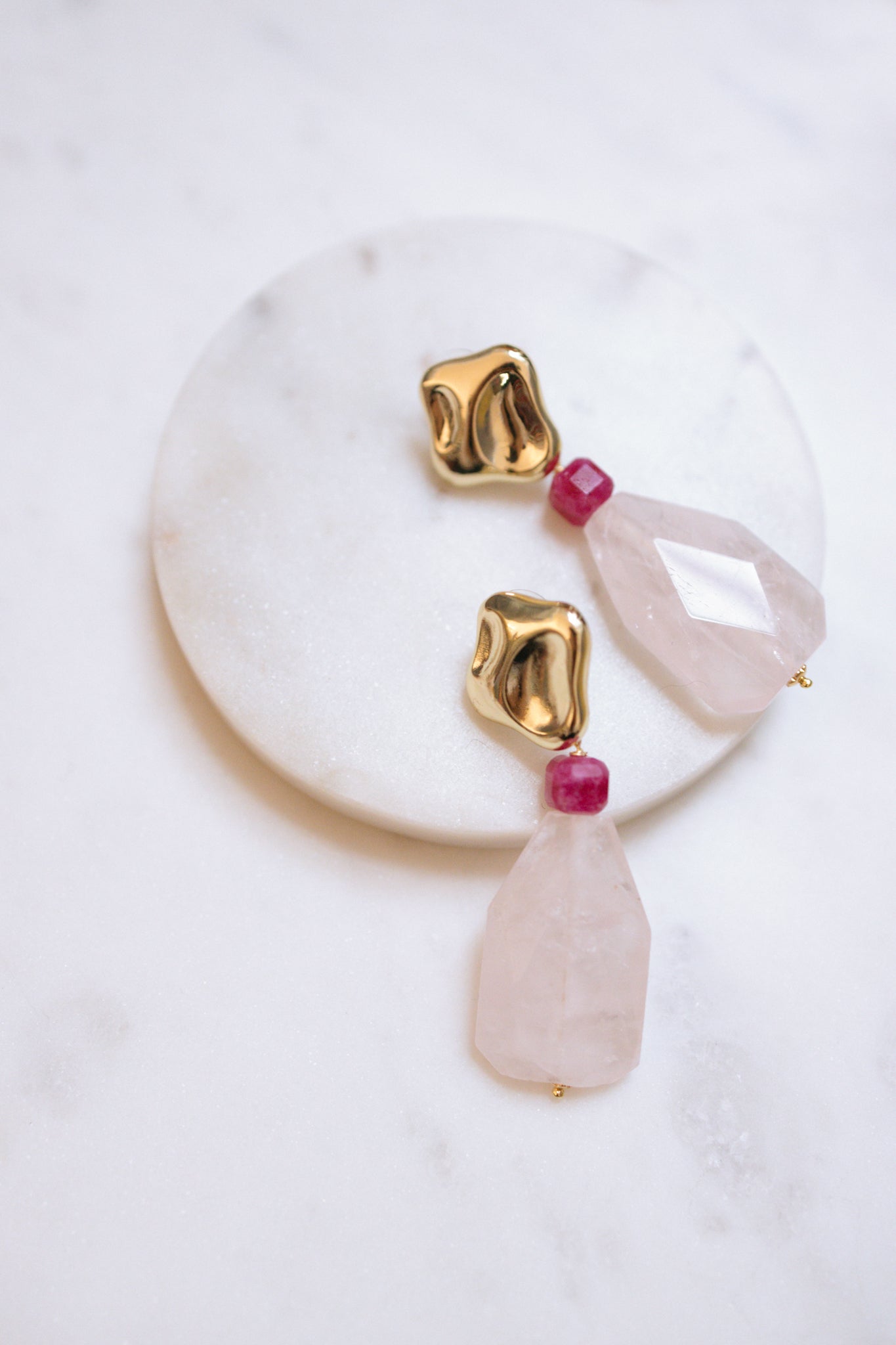 SIENNA Rose – delicate studs in gold-plated bronze, featuring a soft pink combination of rose quartz and dyed quartz. Elegant, feminine, and effortlessly charming, perfect for adding a subtle touch of color to any look. Approximately 7 cm long