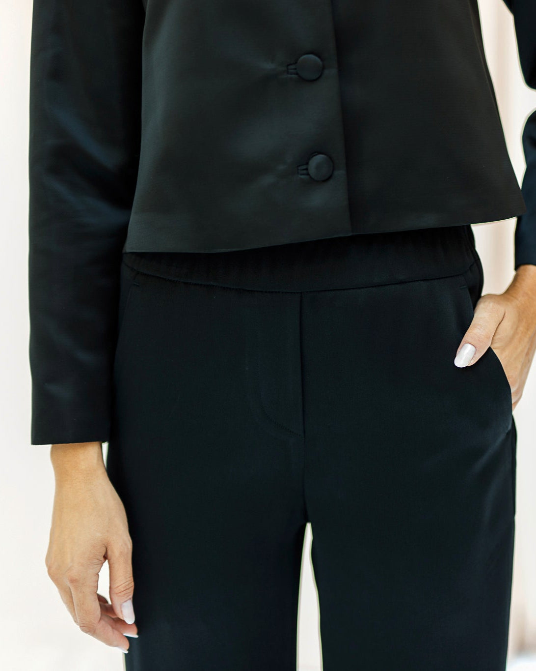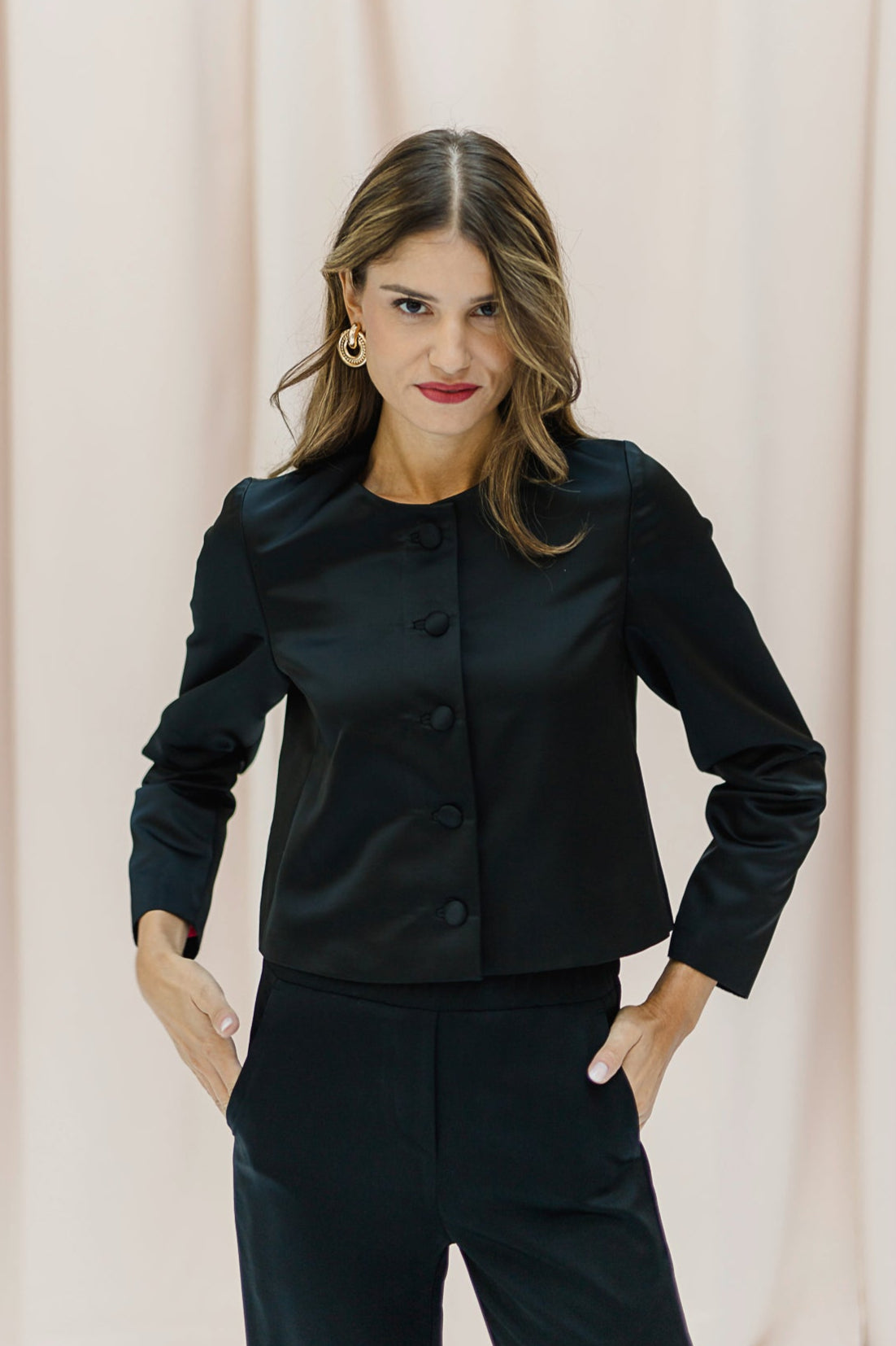 MARIE is our stunning new jacket, which can also be worn beautifully as a top. The padded buttonholes give it a uniquely elegant touch, while the covered buttons add a refined, minimalist finish. Its cropped cut and slim sleeves create a modern silhouette that flatters the figure. Whether styled with trousers or a skirt, this jacket brings timeless sophistication to any look.