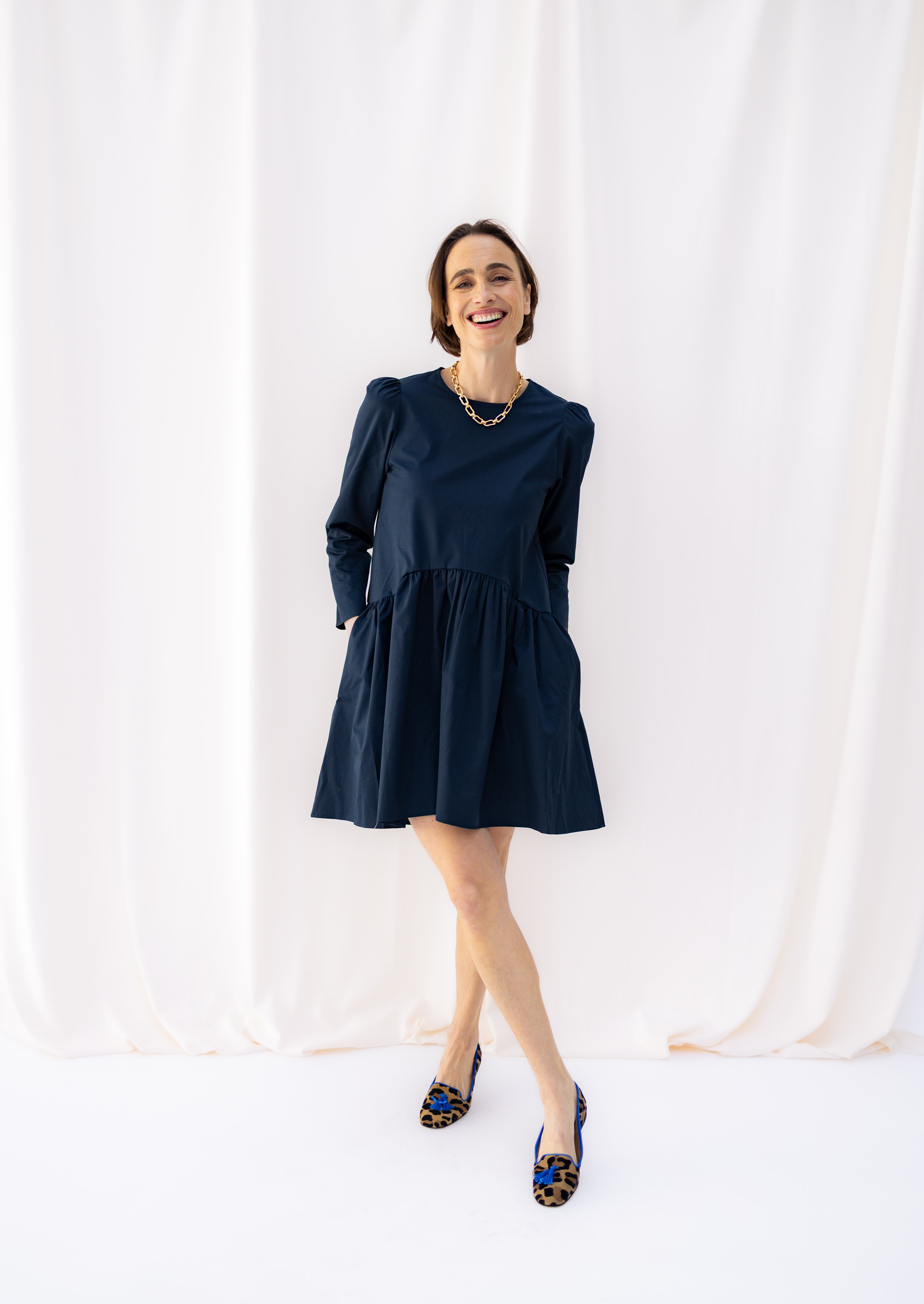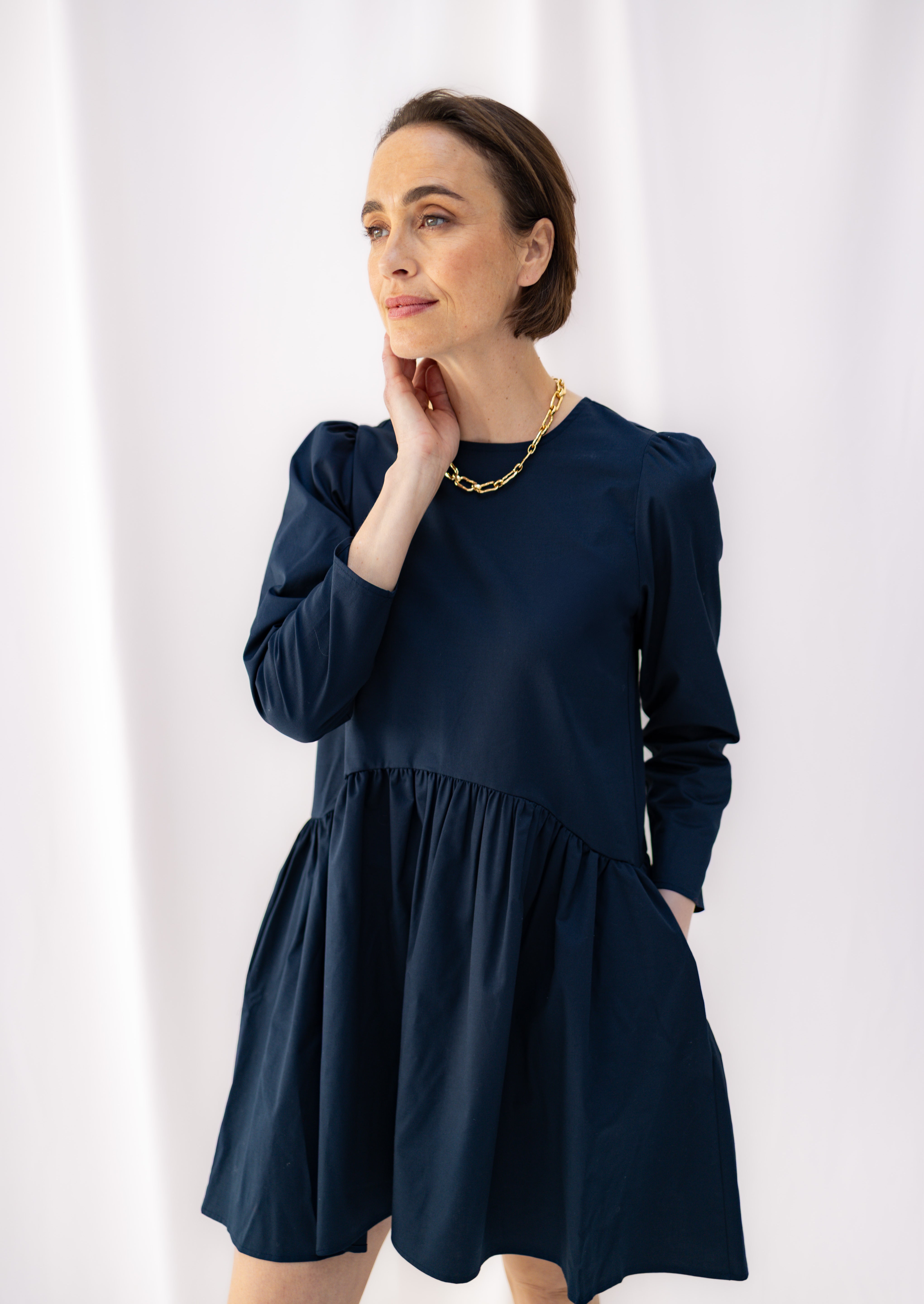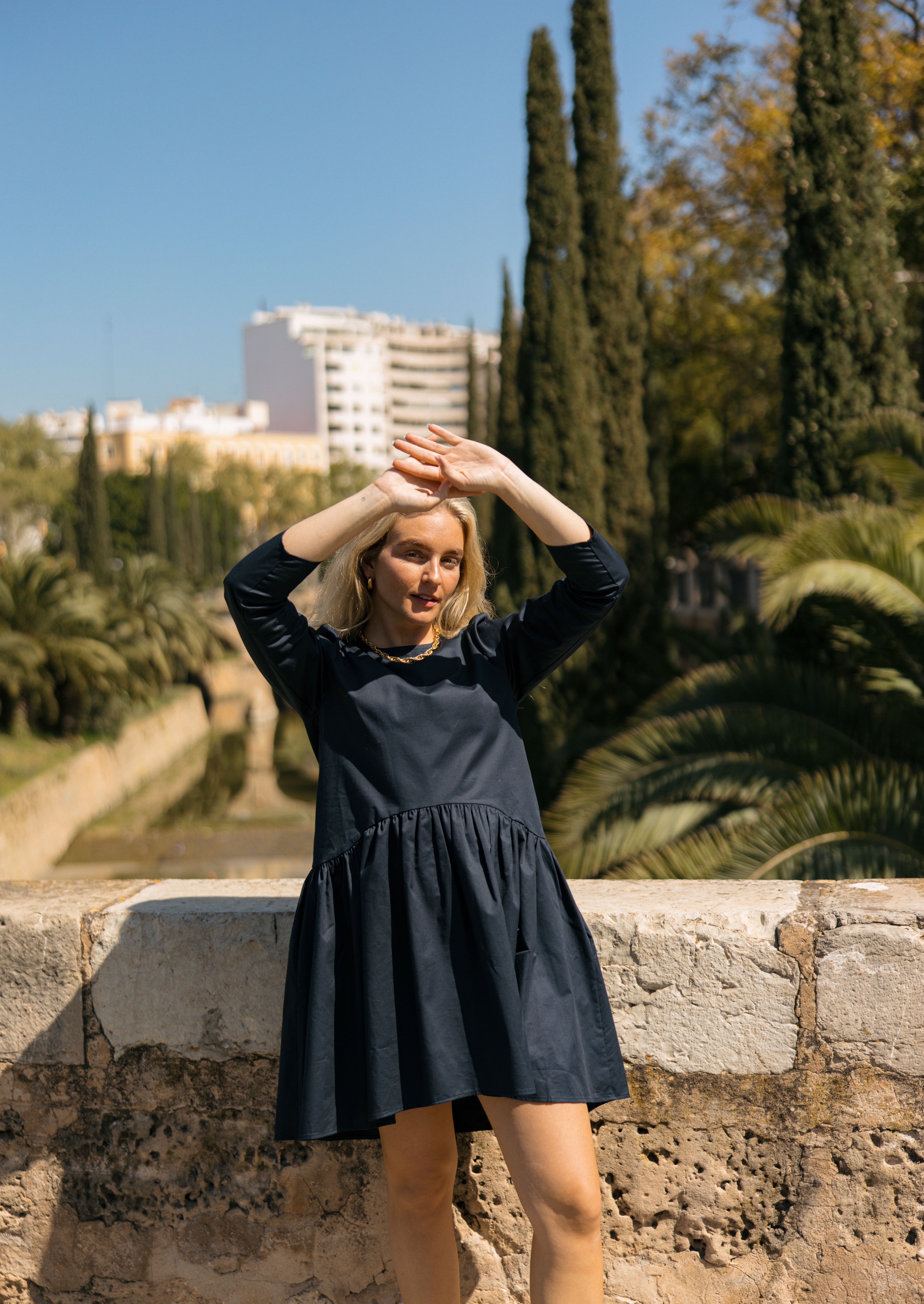 Be cheerful with a little NORA! Live in the moment and let life be fun. NORA, a dress to make you feel good. A playful dress with a 7/8 sleeve and shorter in the front than in the back, ruffled skirt, 100% cotton. The perfect everyday dress and best of all, it has pockets.