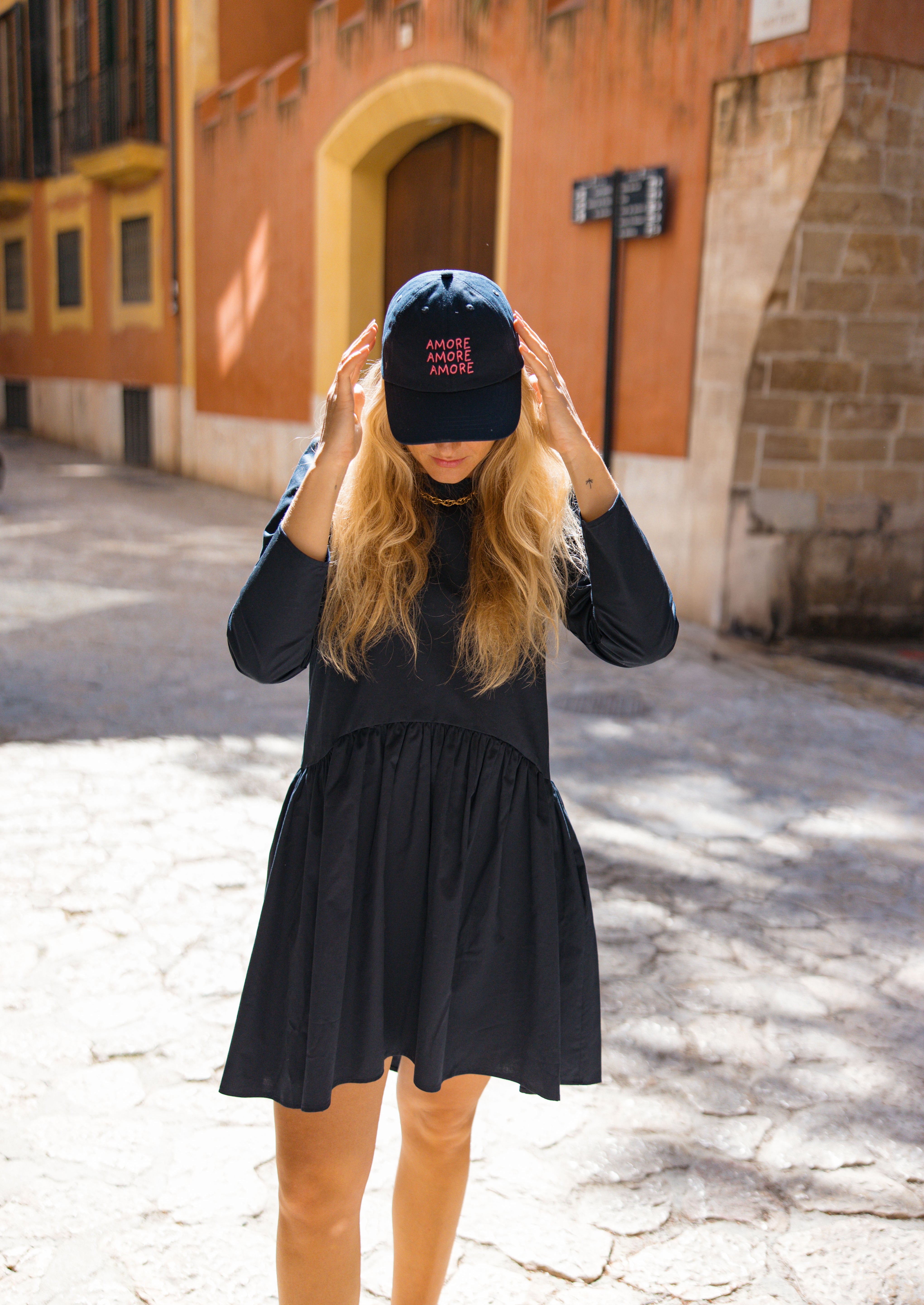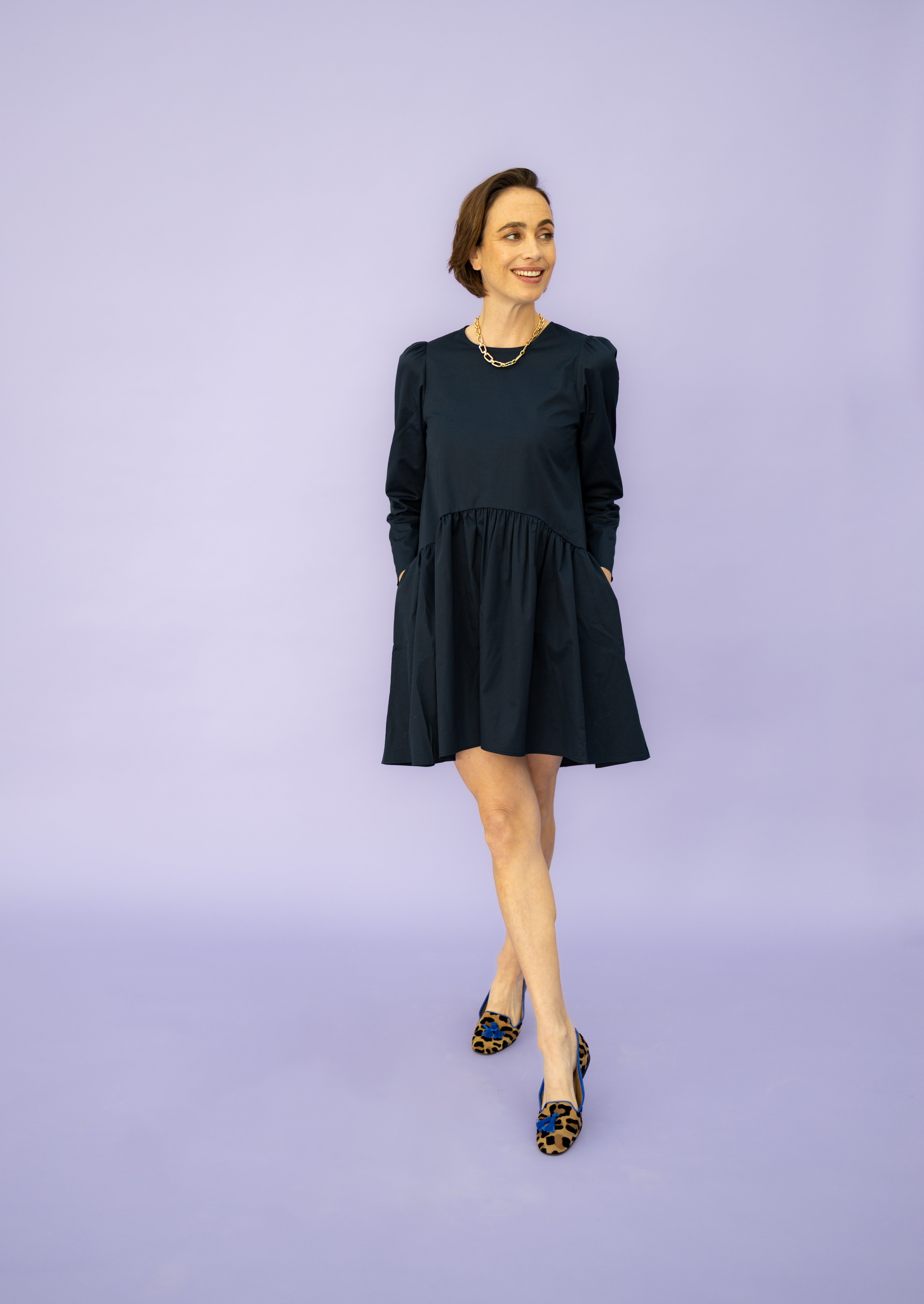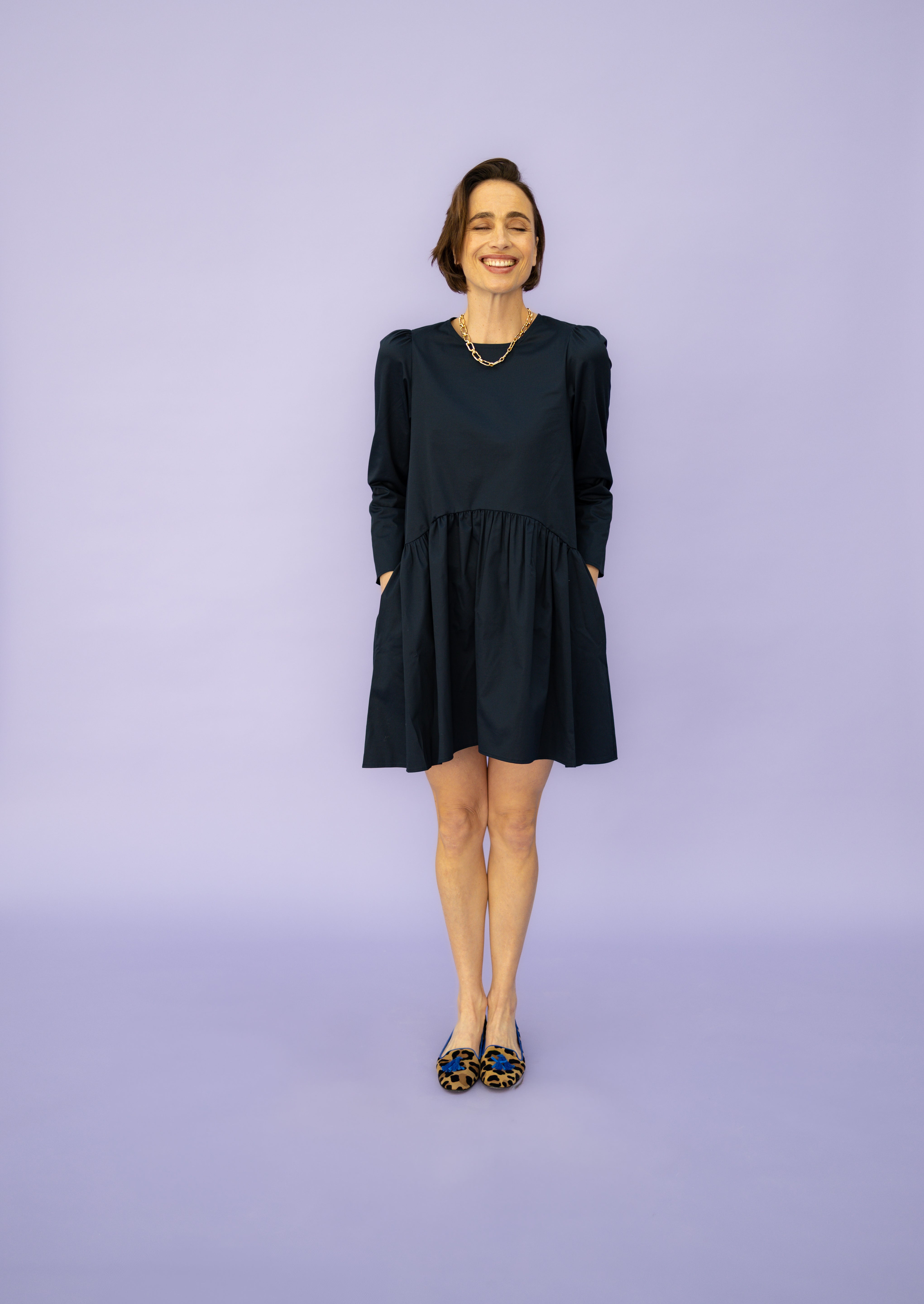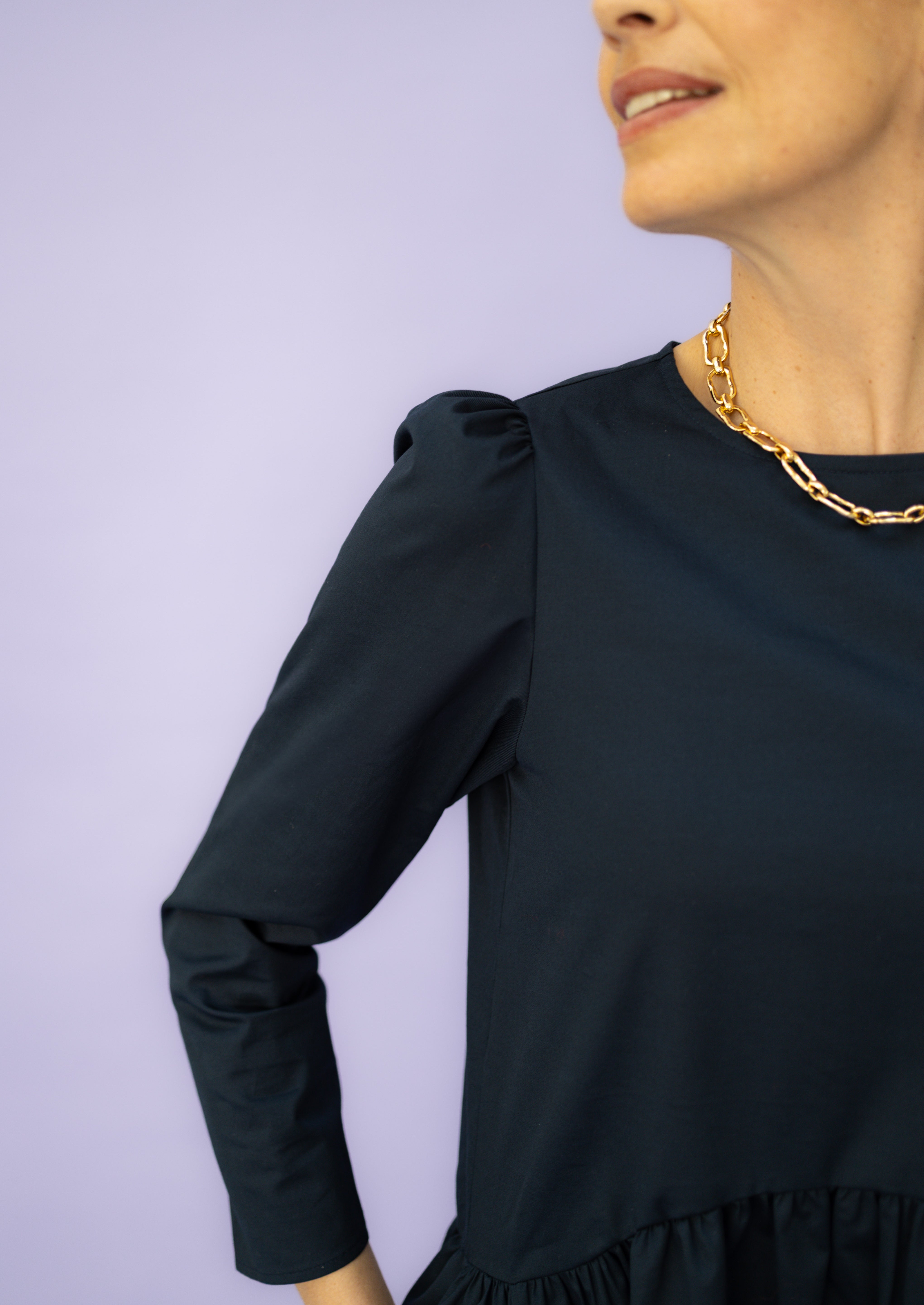 Be cheerful with a little NORA! Live in the moment and let life be fun. NORA, a dress to make you feel good. A playful dress with a 7/8 sleeve and shorter in the front than in the back, ruffled skirt, 100% cotton. The perfect everyday dress and best of all, it has pockets.
