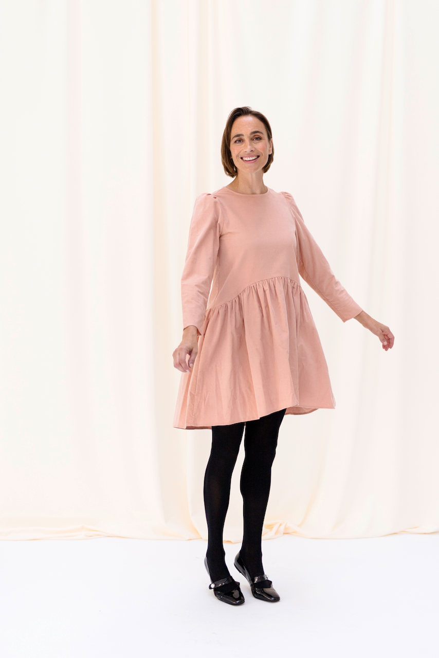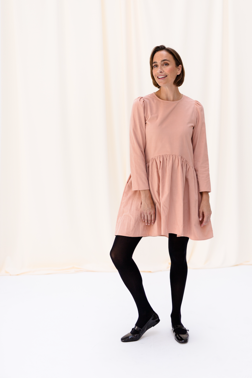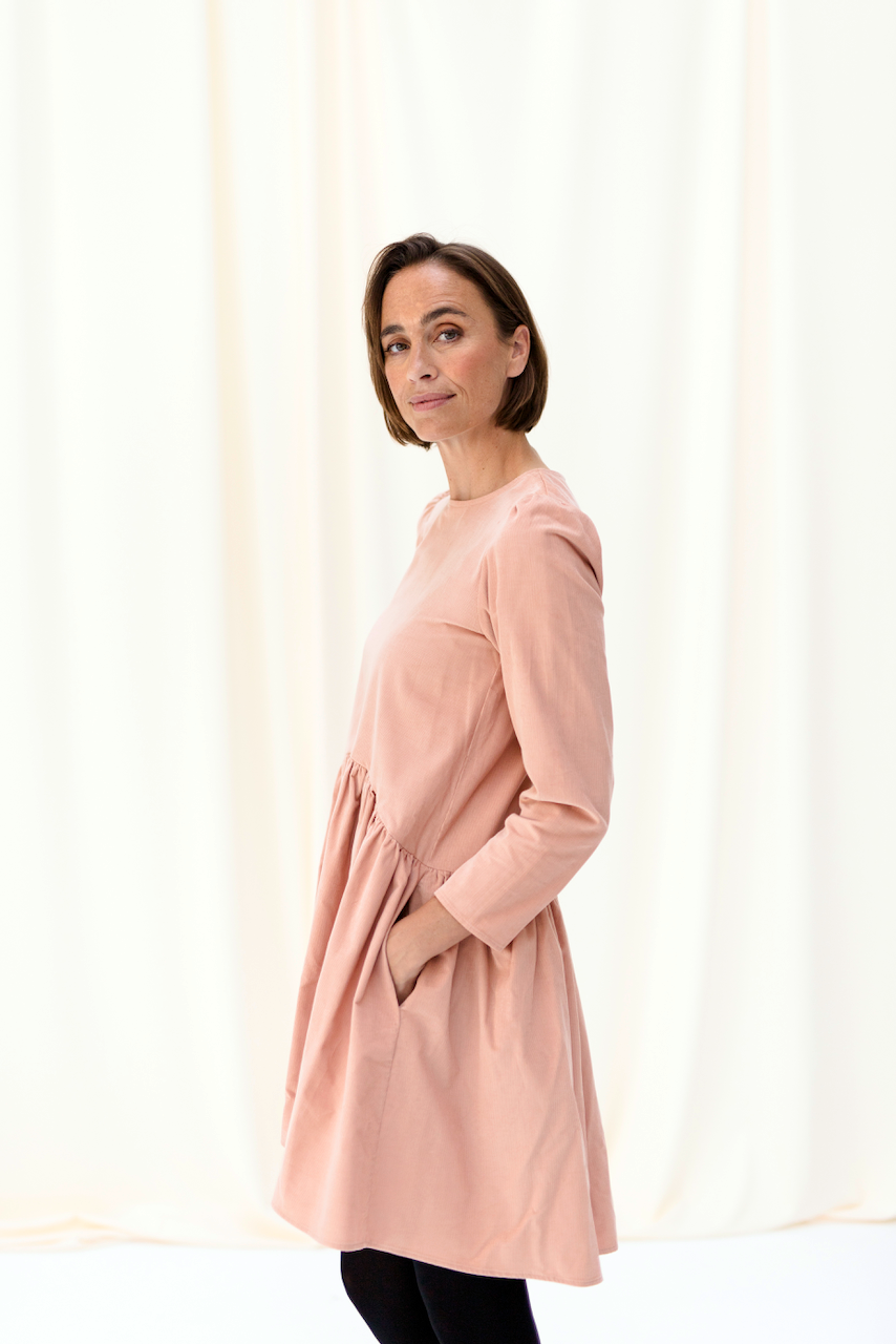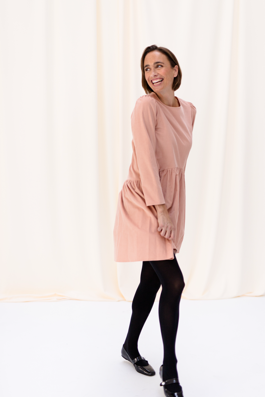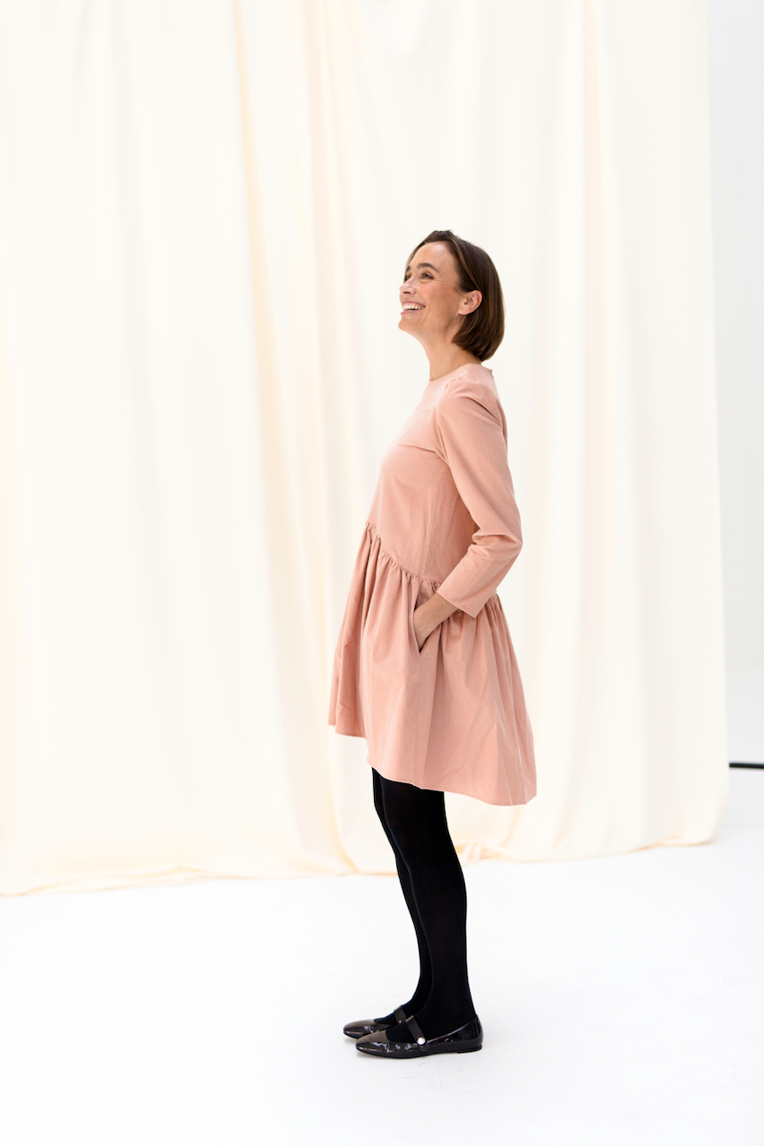 Be cheerful with a little NORA! Live in the moment and let life be fun. NORA, a dress to make you feel good. A playful dress with a 7/8 sleeve and shorter in the front than in the back, ruffled skirt, 100% cotton. The perfect everyday dress and best of all, it has pockets.