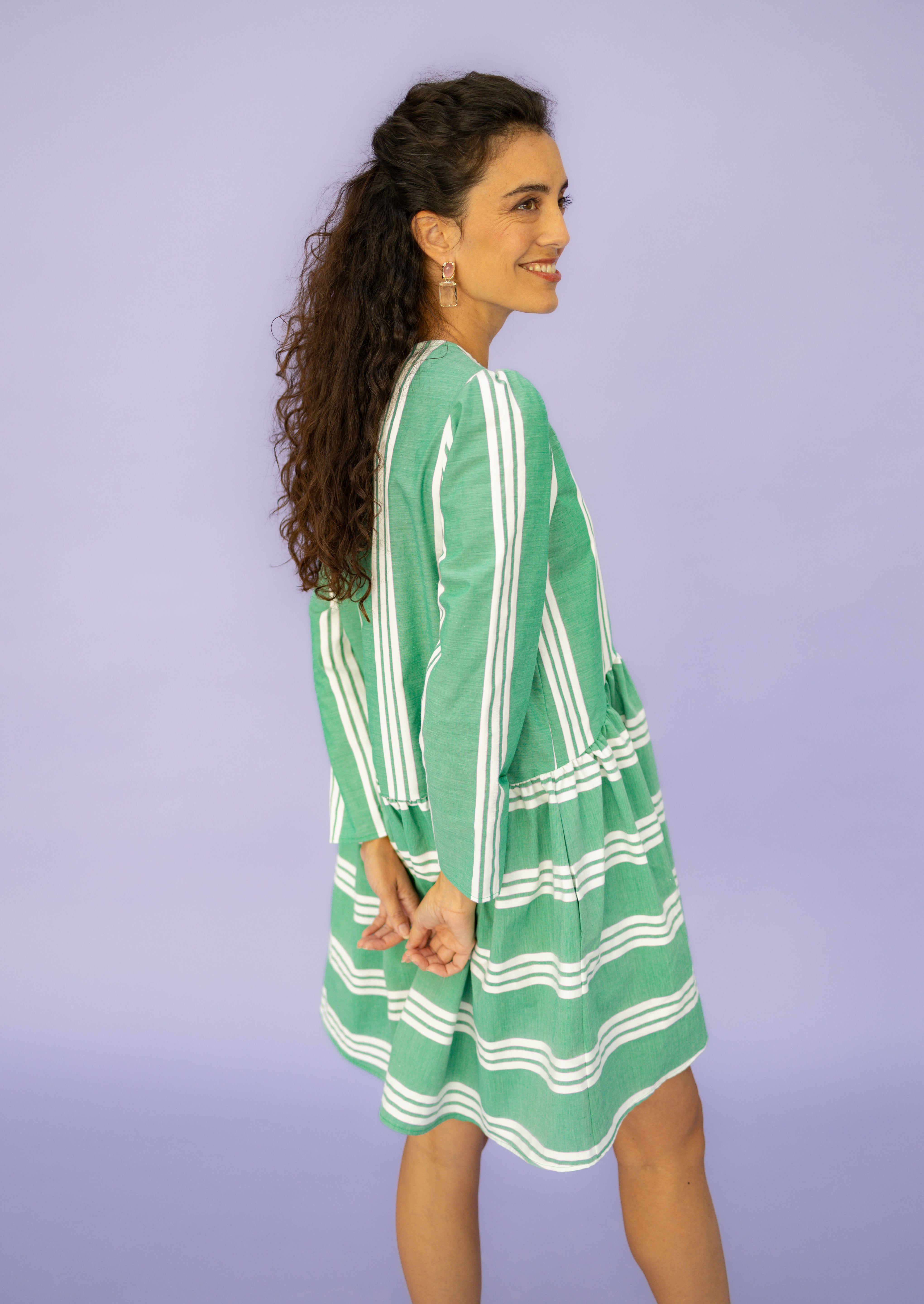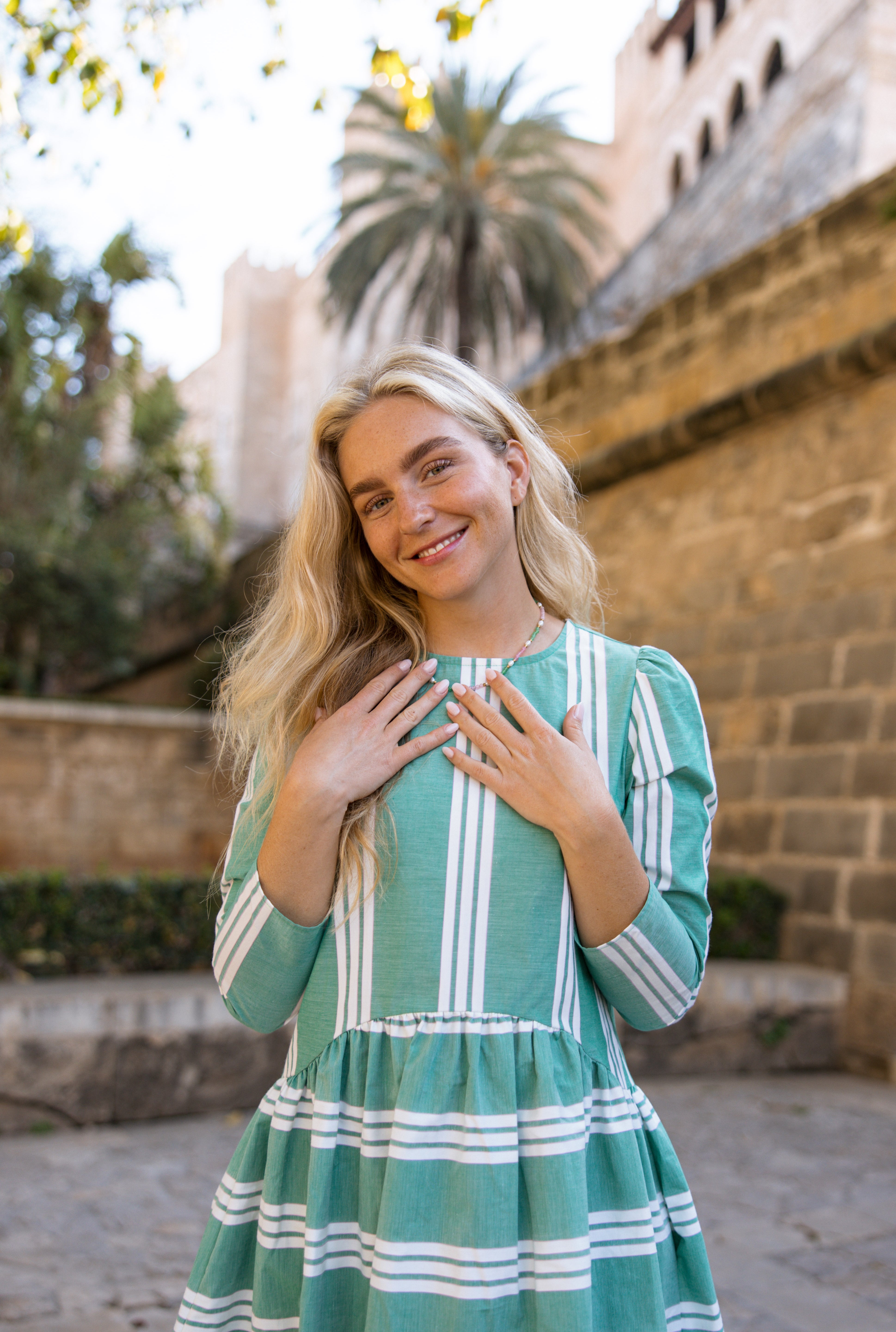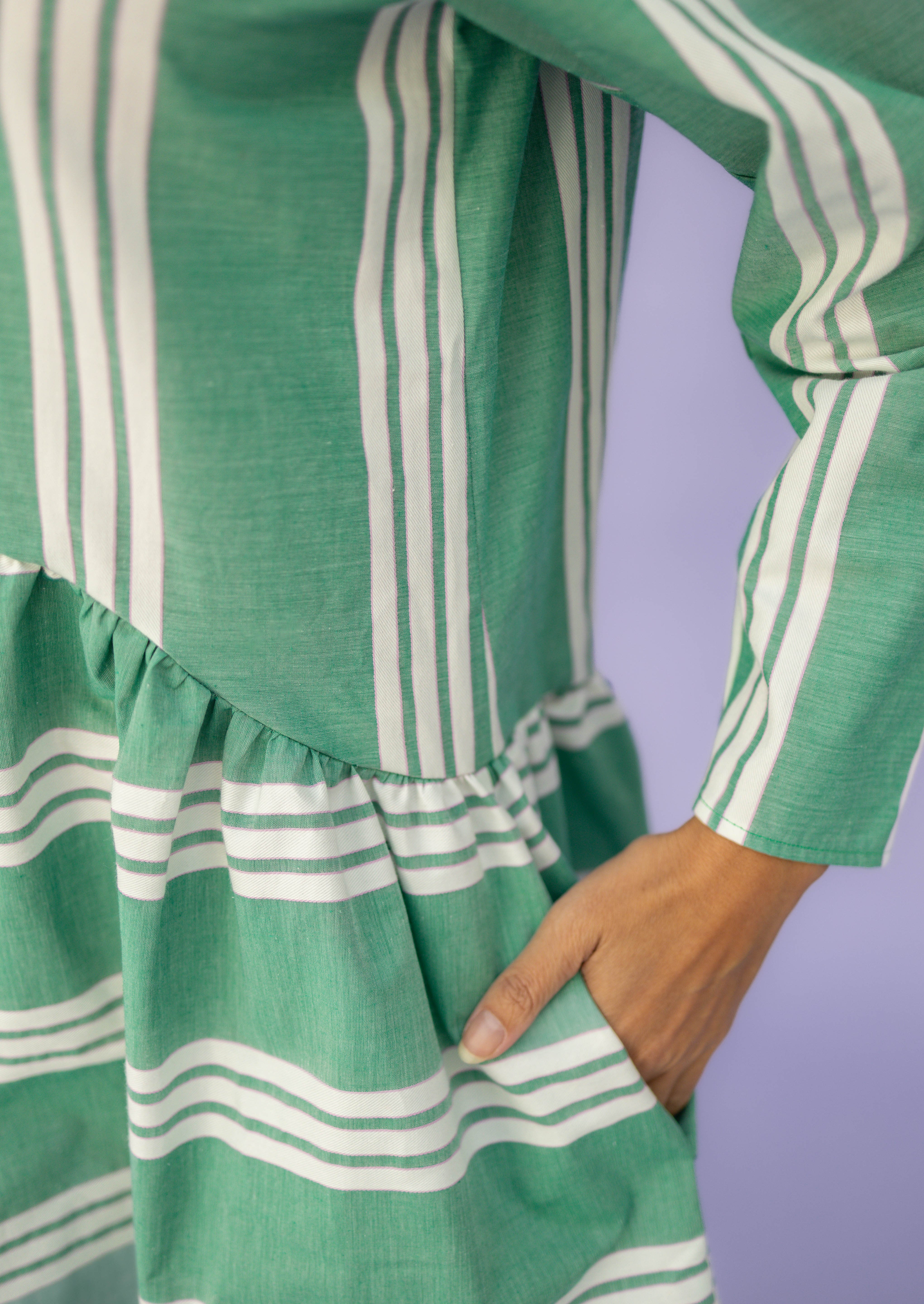 Be cheerful with a little NORA! Live in the moment and let life be fun. NORA, a dress to make you feel good. A playful dress with a 7/8 sleeve and shorter in the front than in the back, ruffled skirt, 100% cotton. The perfect everyday dress and best of all, it has pockets.