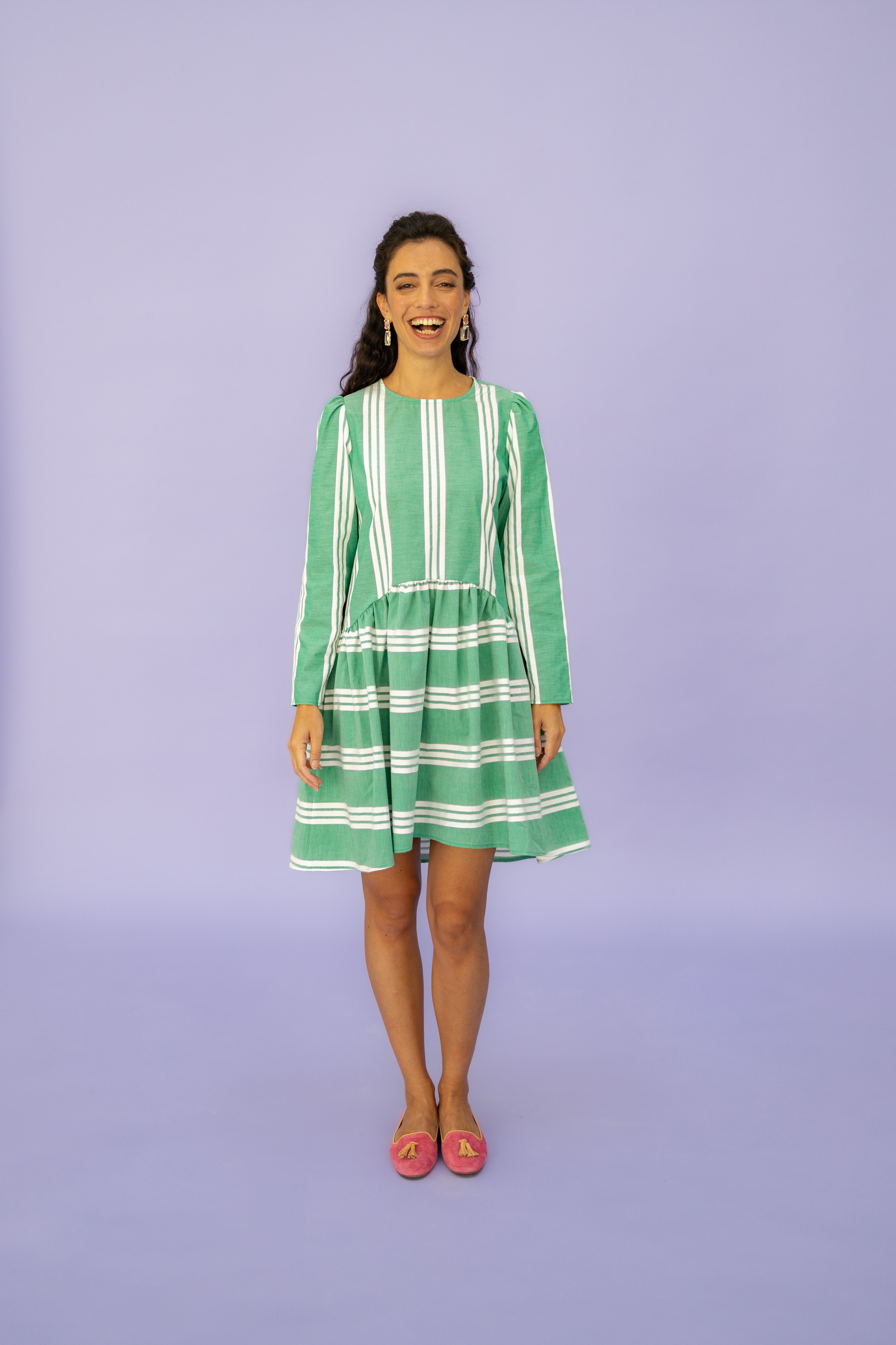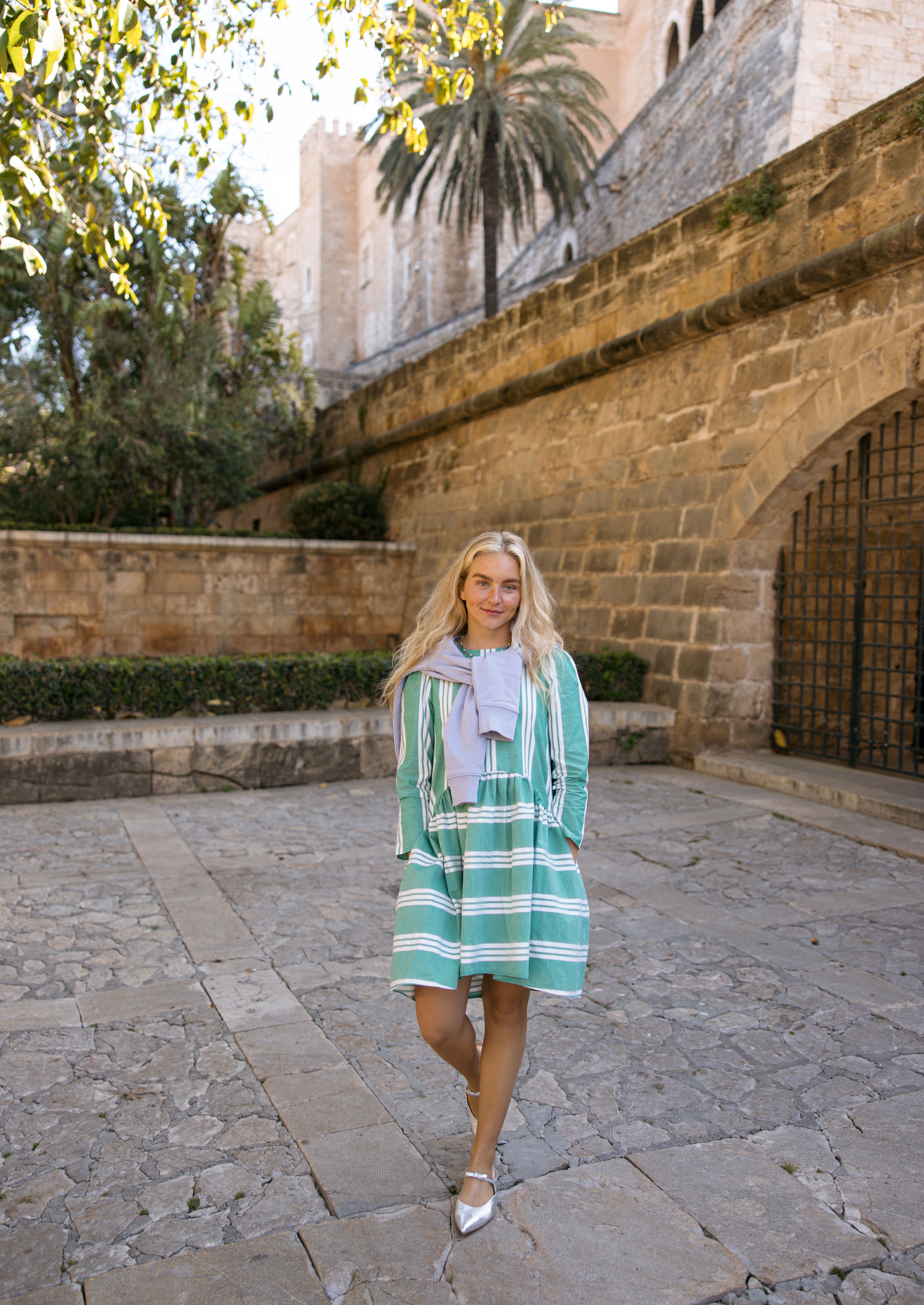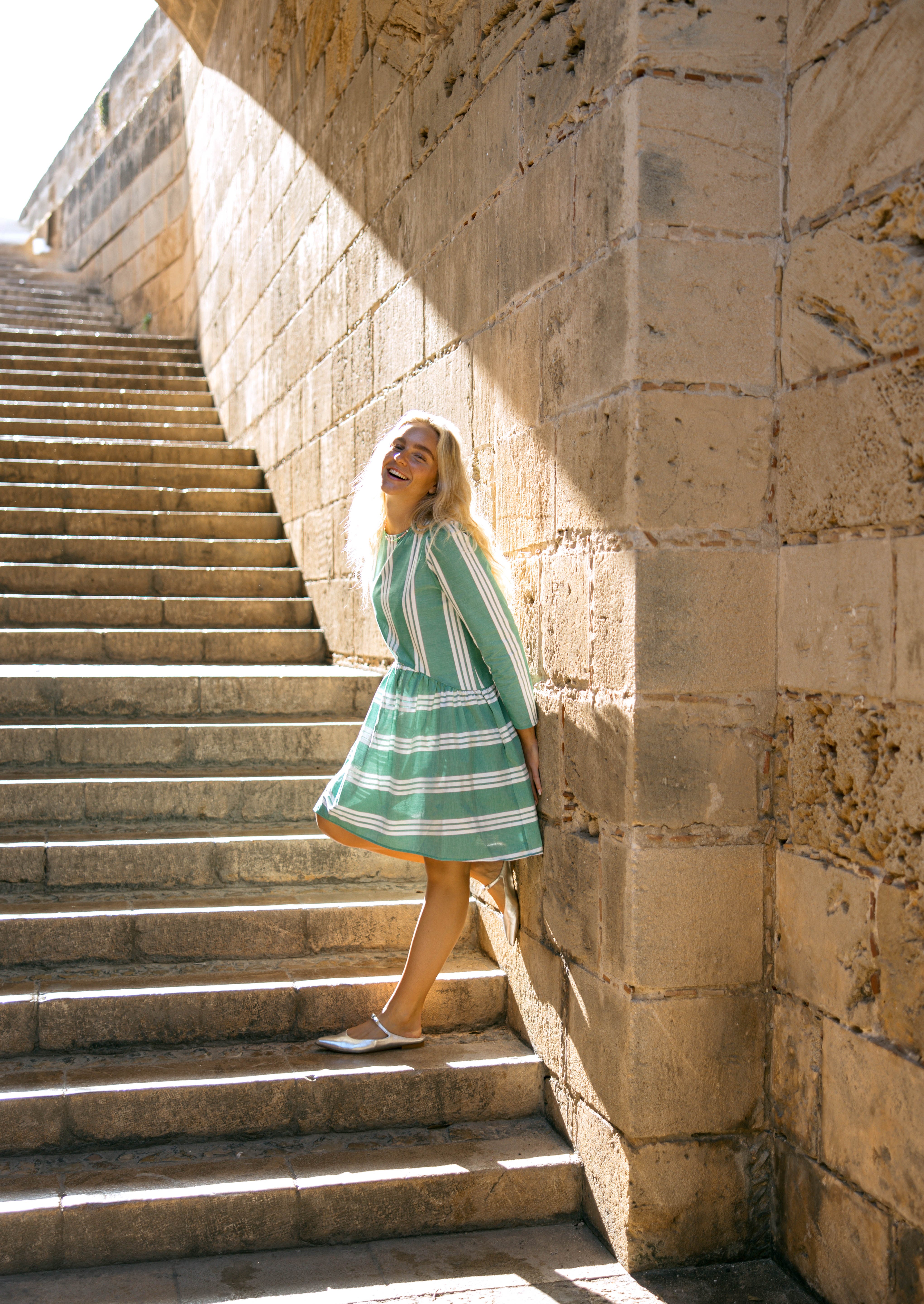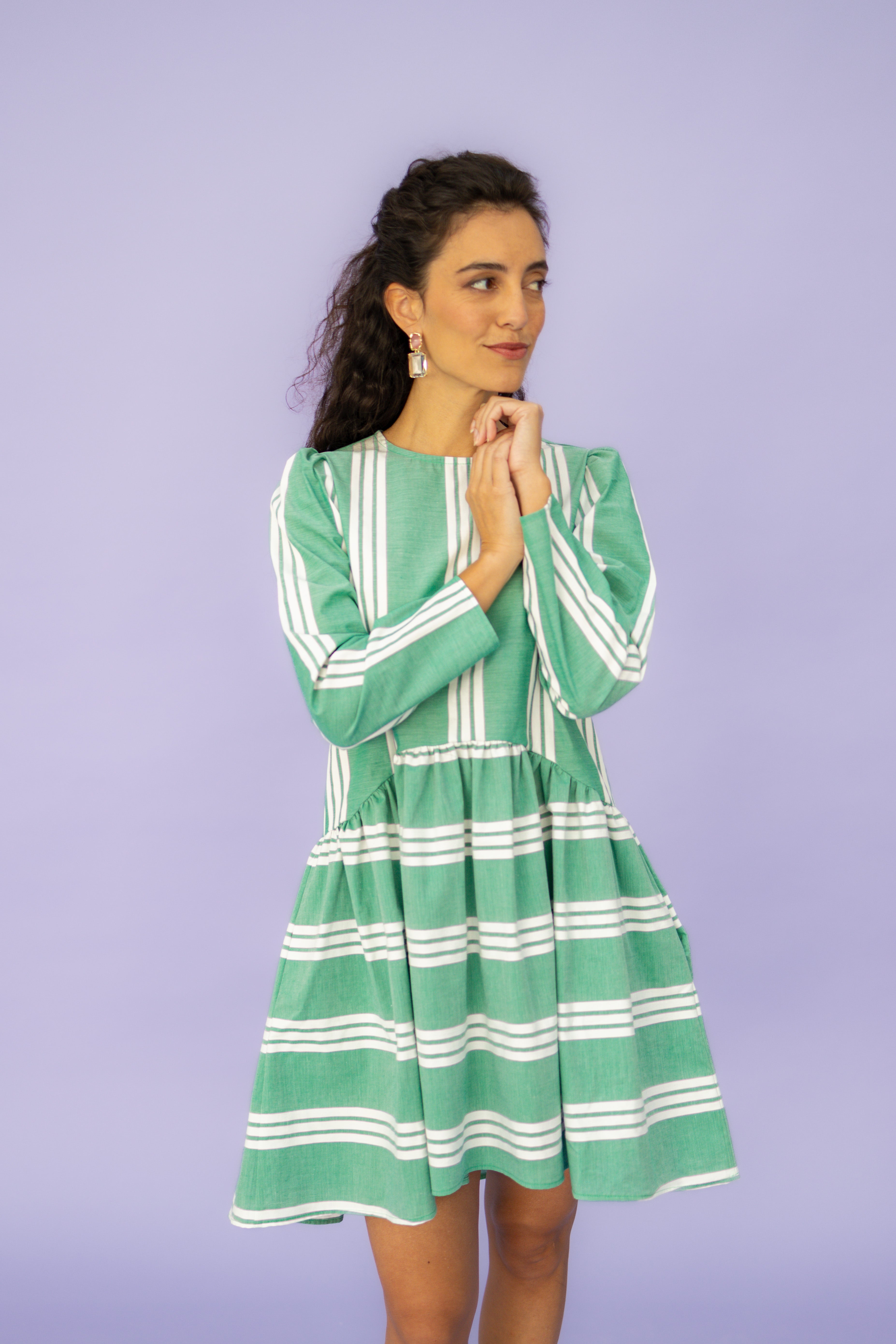 Be cheerful with a little NORA! Live in the moment and let life be fun. NORA, a dress to make you feel good. A playful dress with a 7/8 sleeve and shorter in the front than in the back, ruffled skirt, 100% cotton. The perfect everyday dress and best of all, it has pockets.