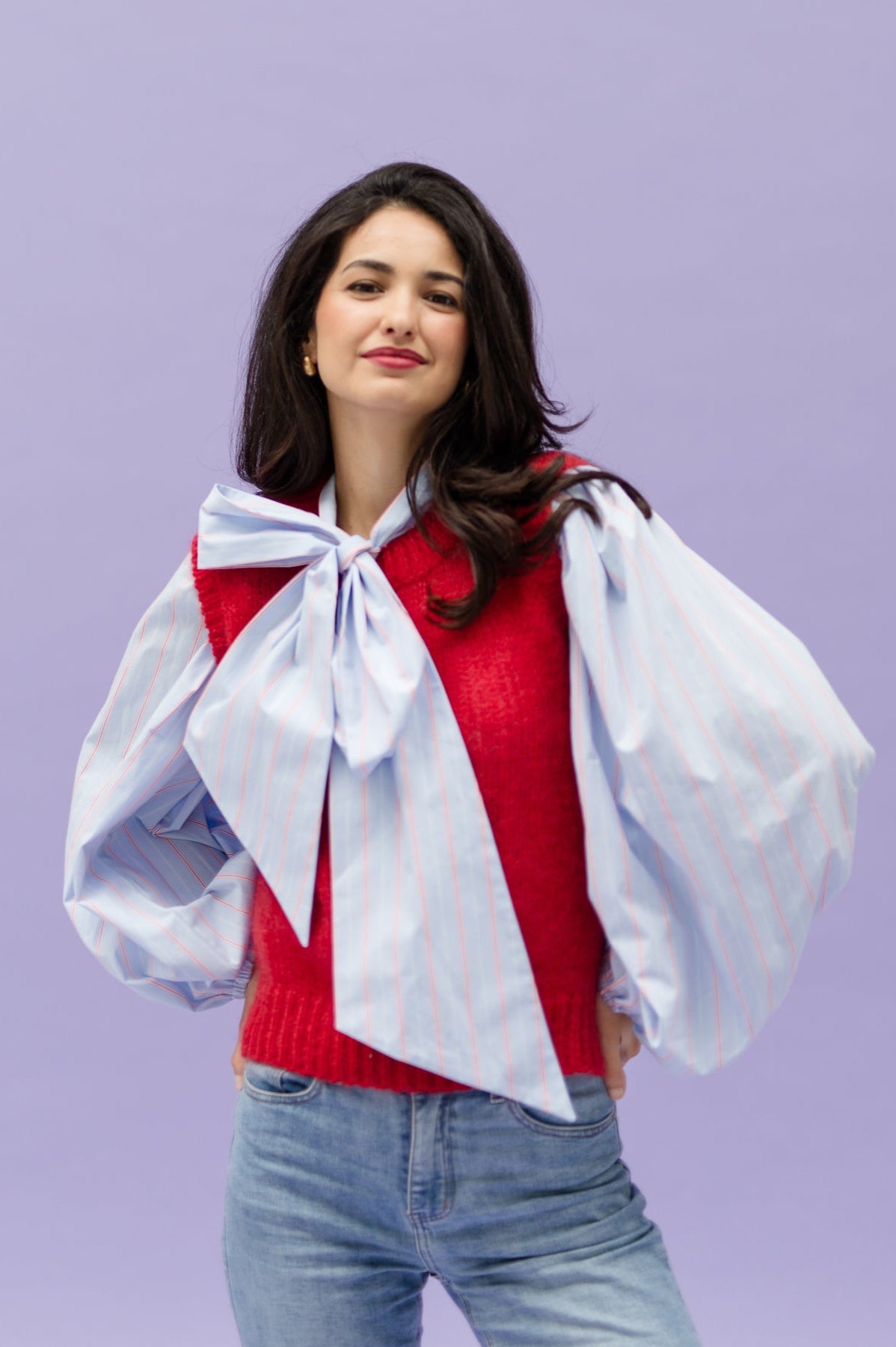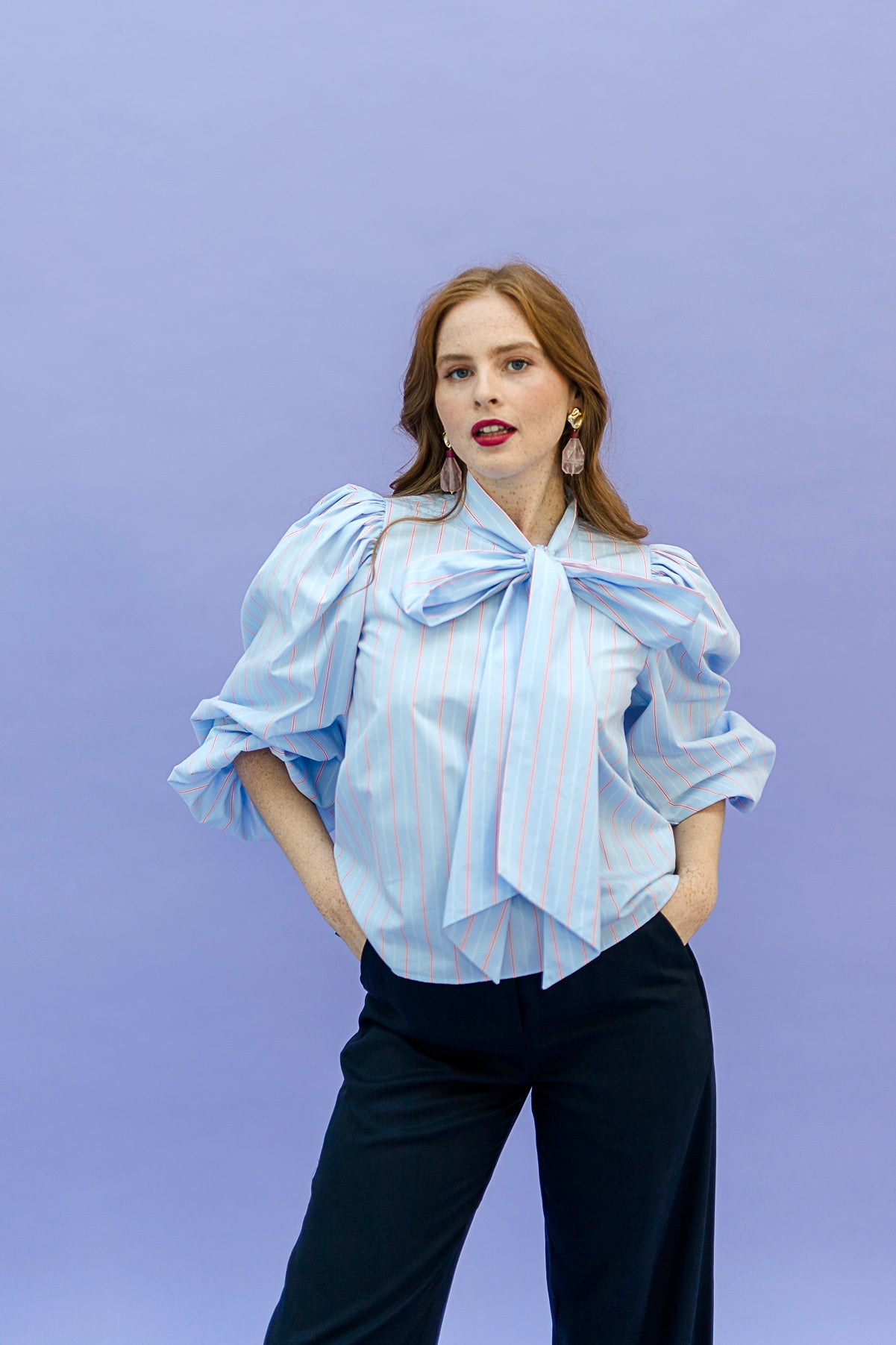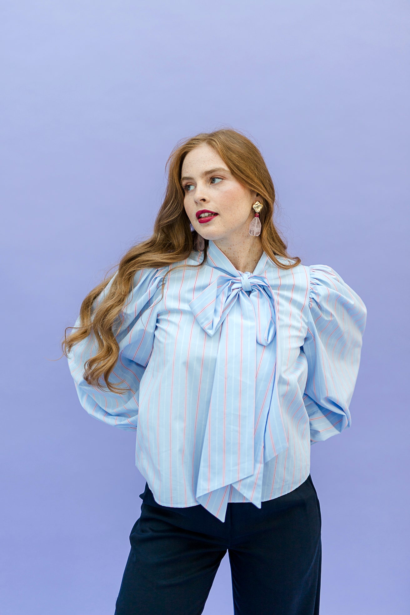 The PAULA blouse is a fresh and stylish addition to your wardrobe. Featuring playful balloon sleeves and a large bow at the front, it combines elegance with a touch of fun. Perfect for both casual and more polished looks, this blouse adds a chic flair to any outfit.