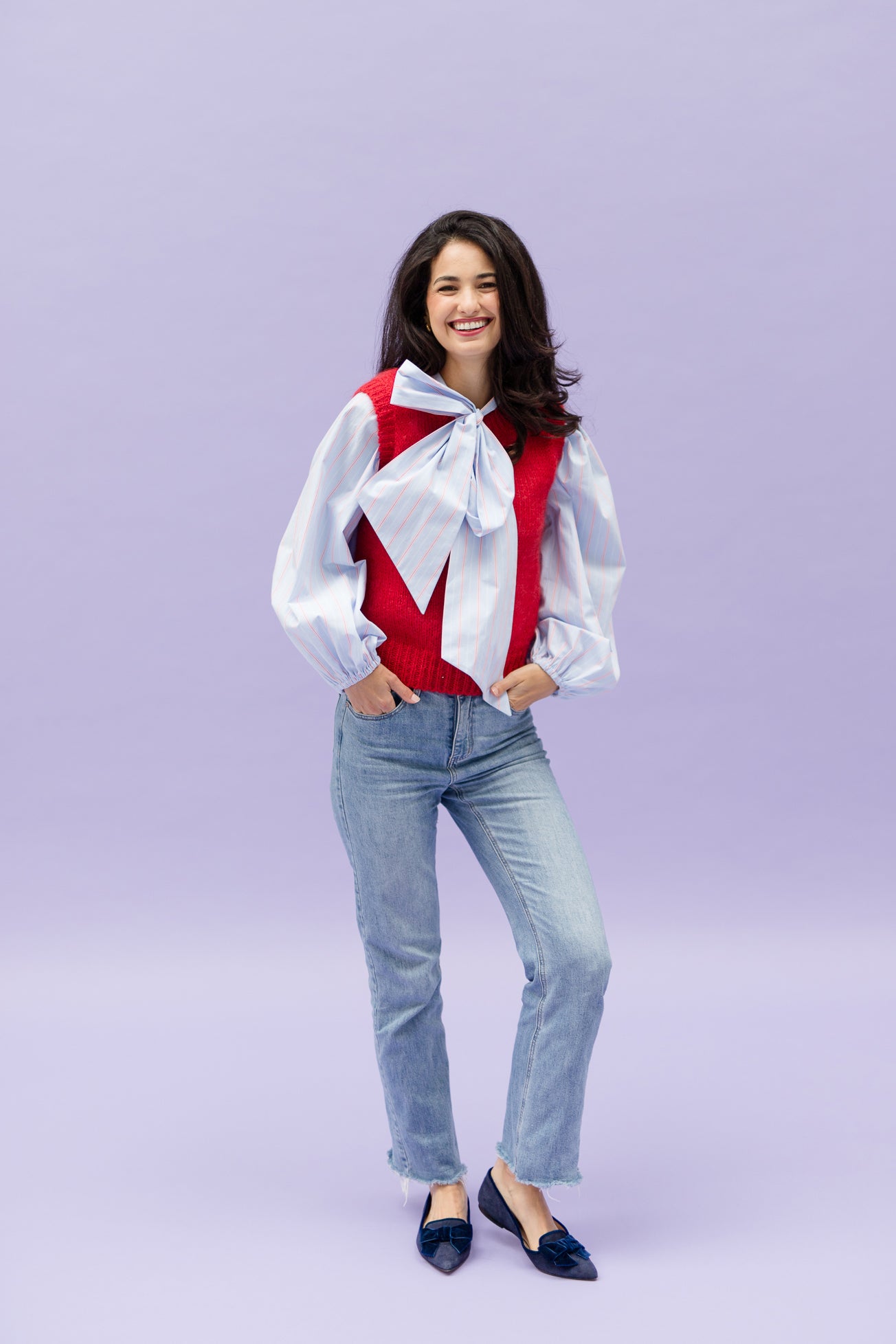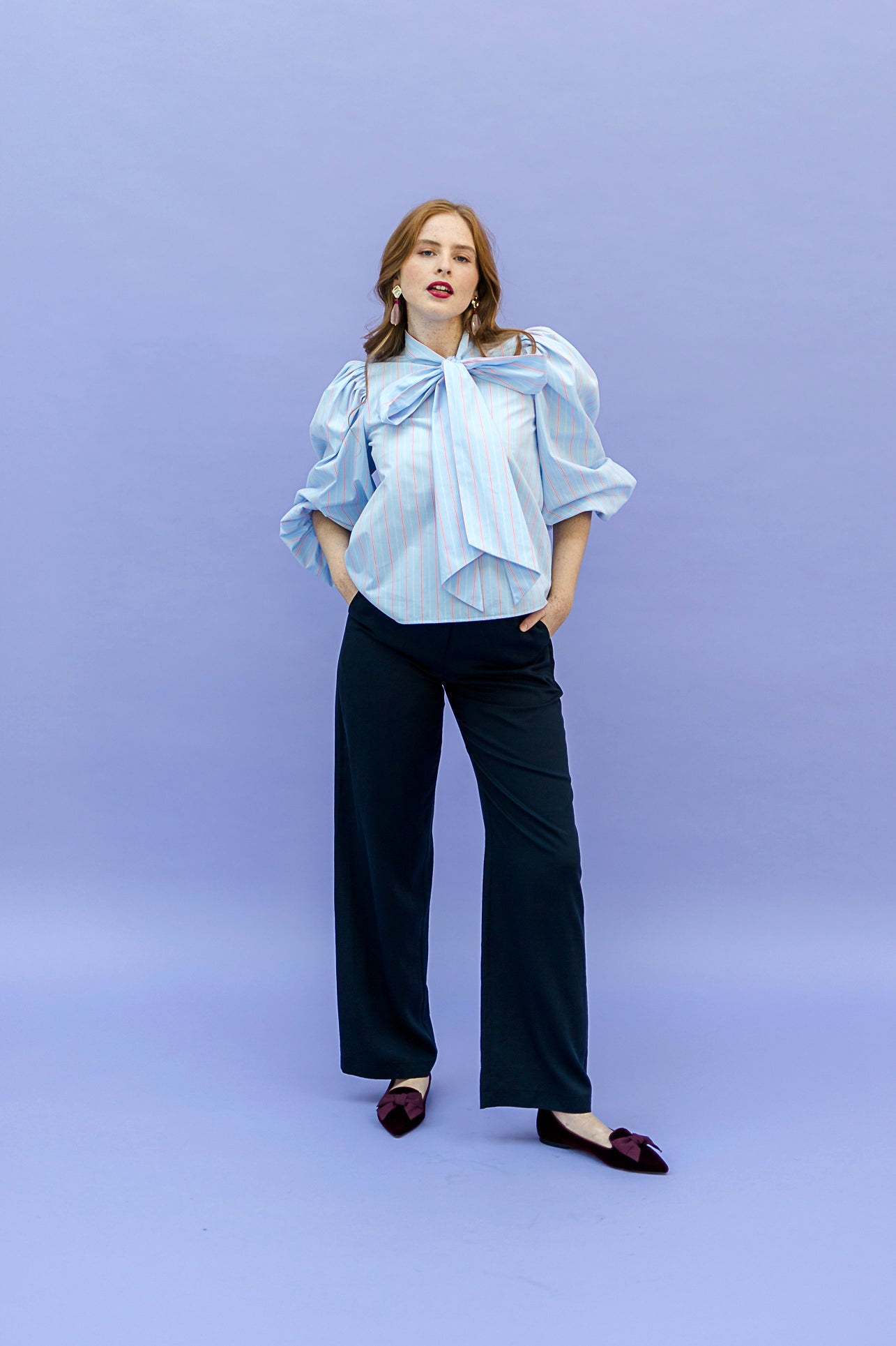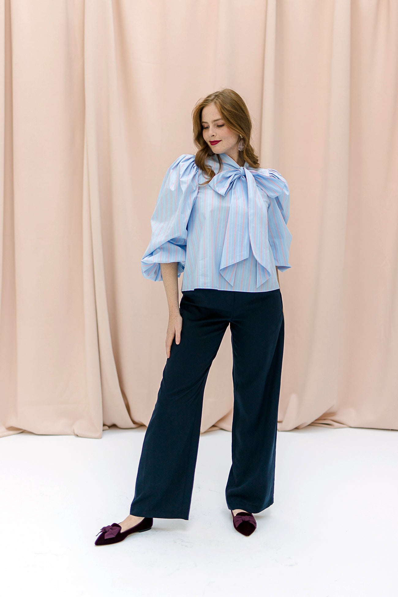 The PAULA blouse is a fresh and stylish addition to your wardrobe. Featuring playful balloon sleeves and a large bow at the front, it combines elegance with a touch of fun. Perfect for both casual and more polished looks, this blouse adds a chic flair to any outfit.