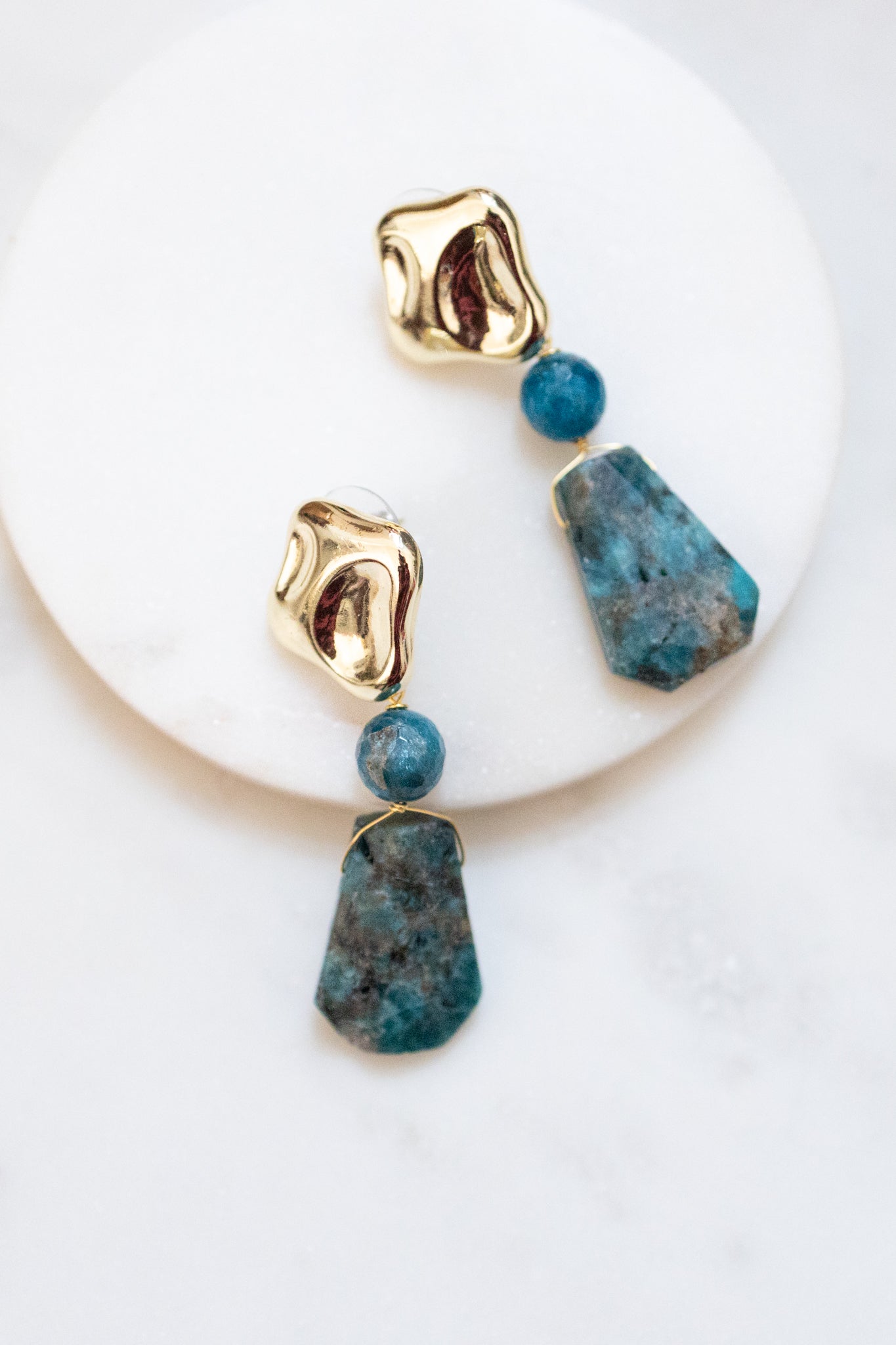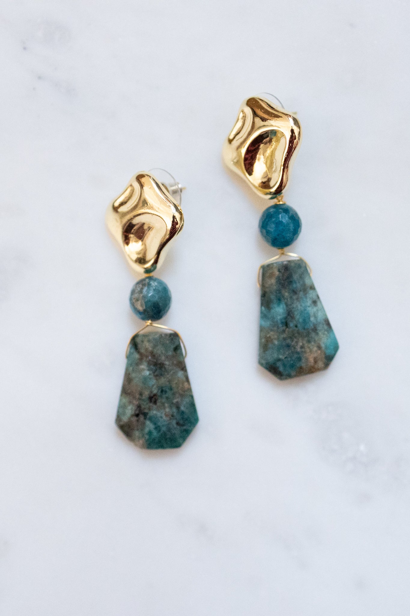 Elegant stud earrings in gold-plated bronze, featuring two shimmering petrol-colored stones that gently dangle. The golden stud adds a subtle, luxurious accent, giving the earrings a light and elegant feel. Timeless and feminine, they enhance any outfit with a touch of luxurious shine. The earrings are approximately 6.5 cm long.