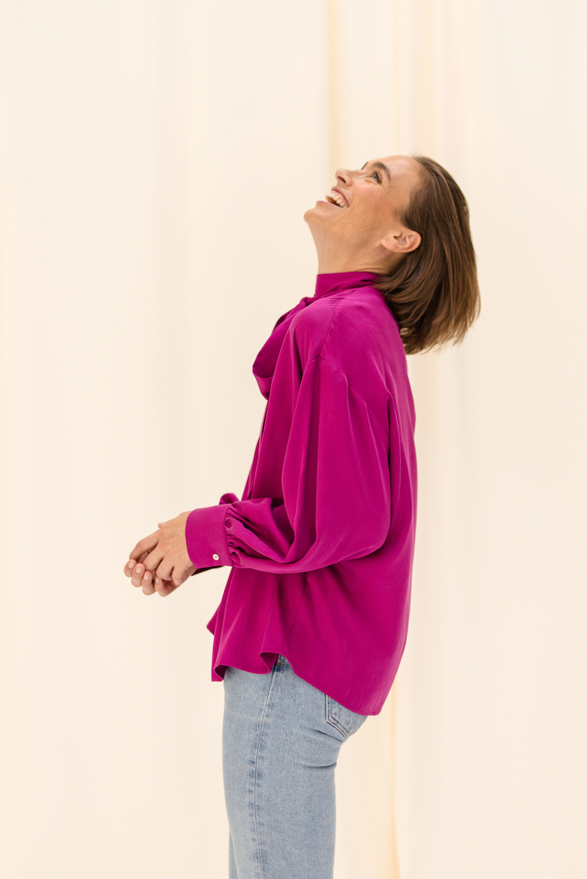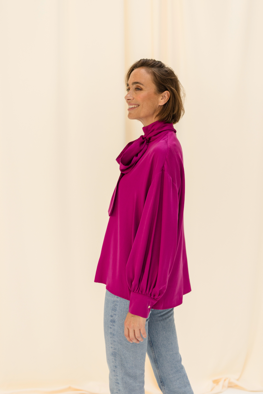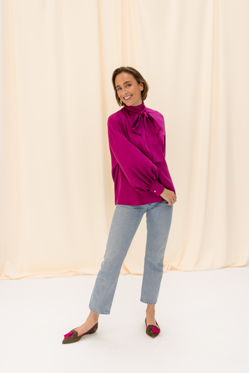 PIPPA is a beautiful blouse with a chic stand-up tie collar and zipper in the back. Perfect to wear with our AVA pants or to elevate any outfit. The beautiful tie collar can be worn both tied in the front or the back or left open. With its comfortable fit and timeless design, you'll feel confident and stylish all day long.