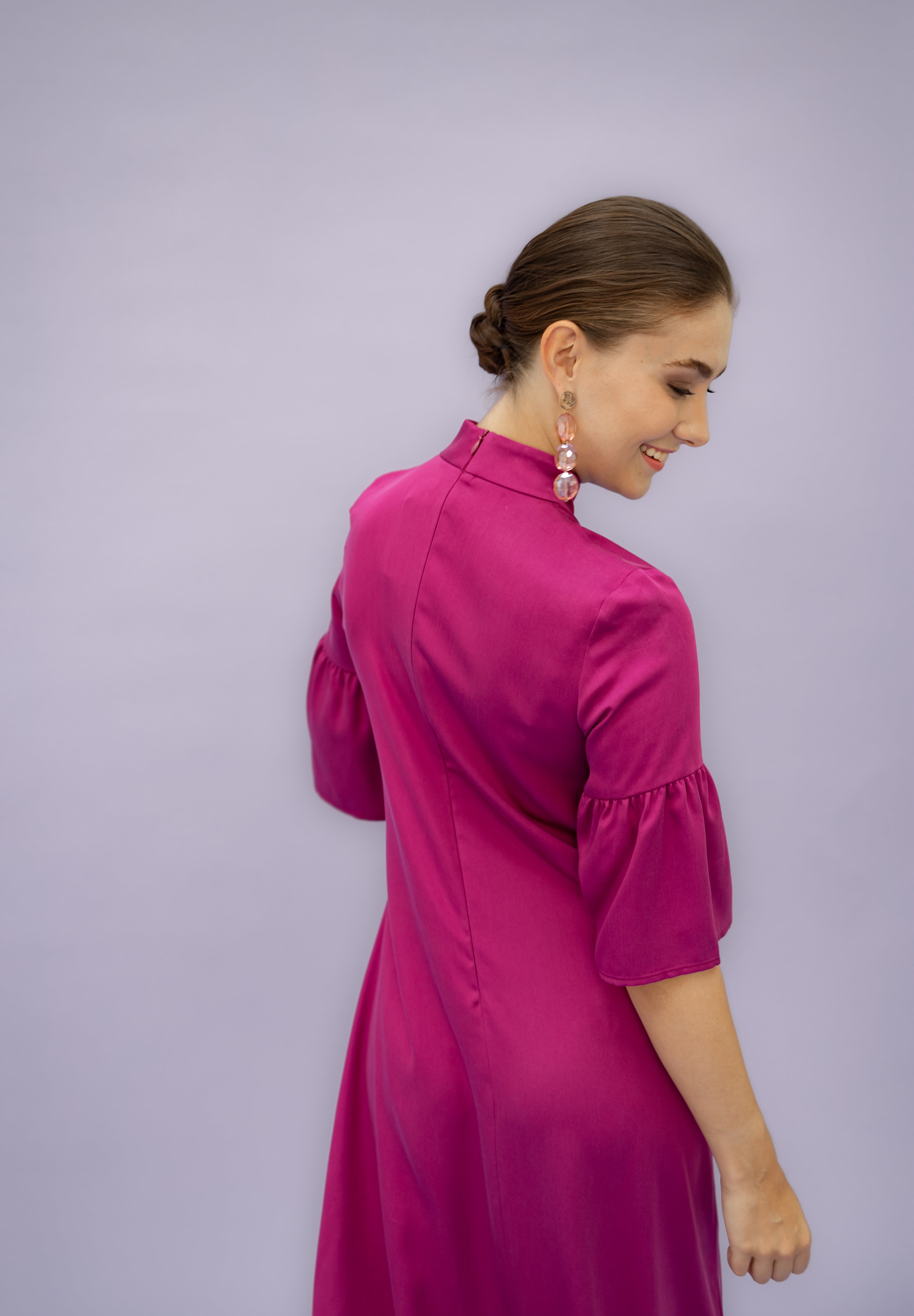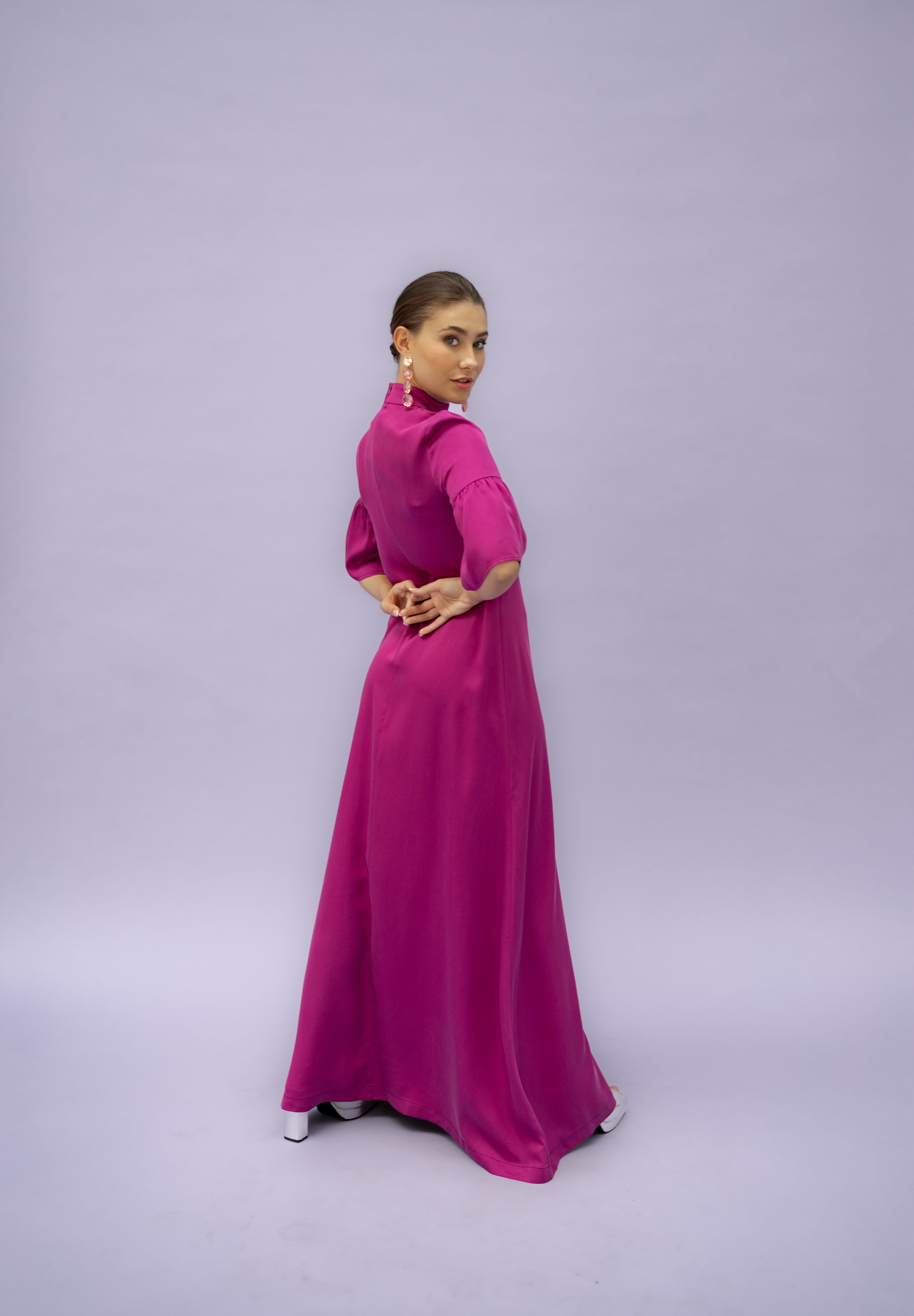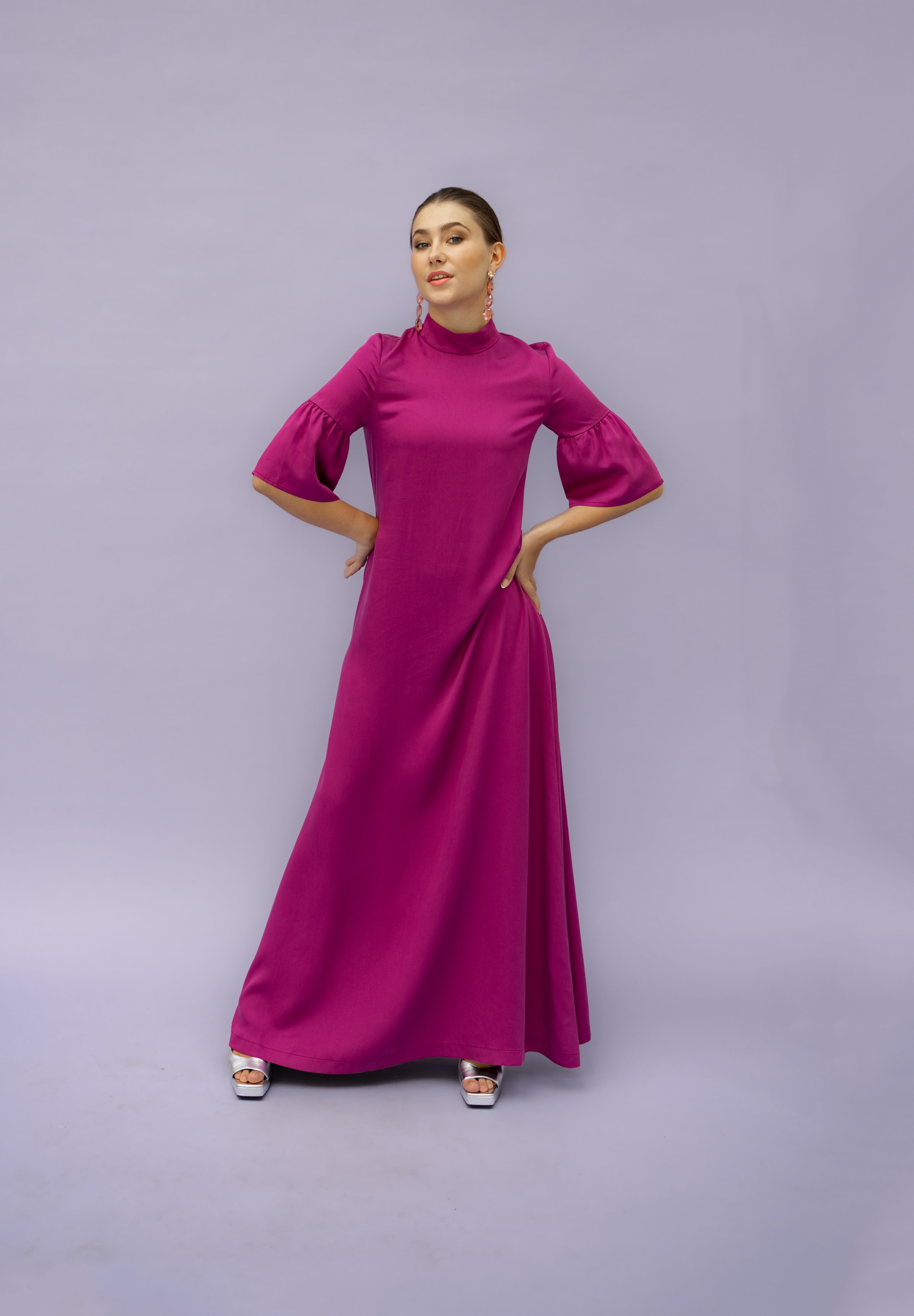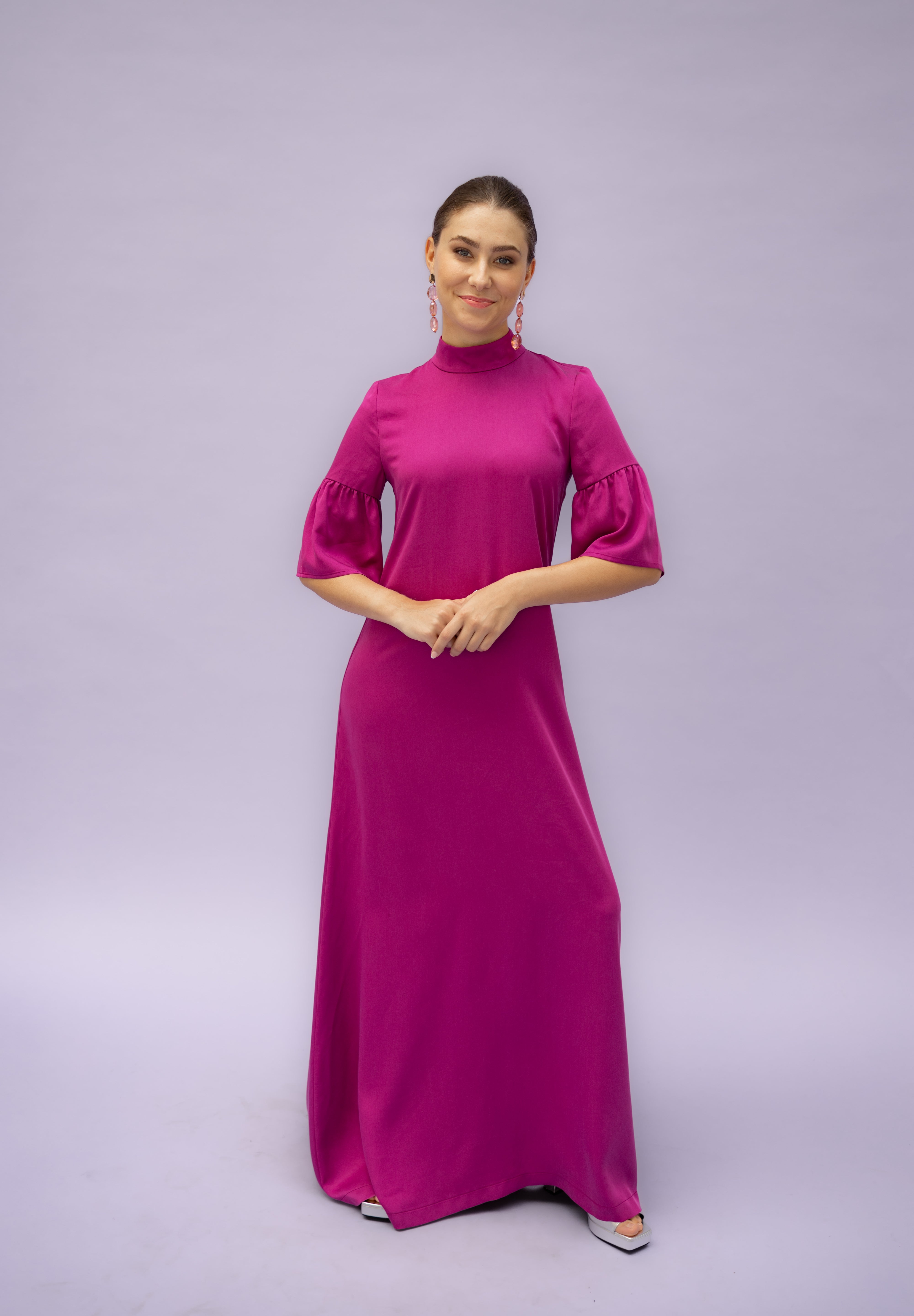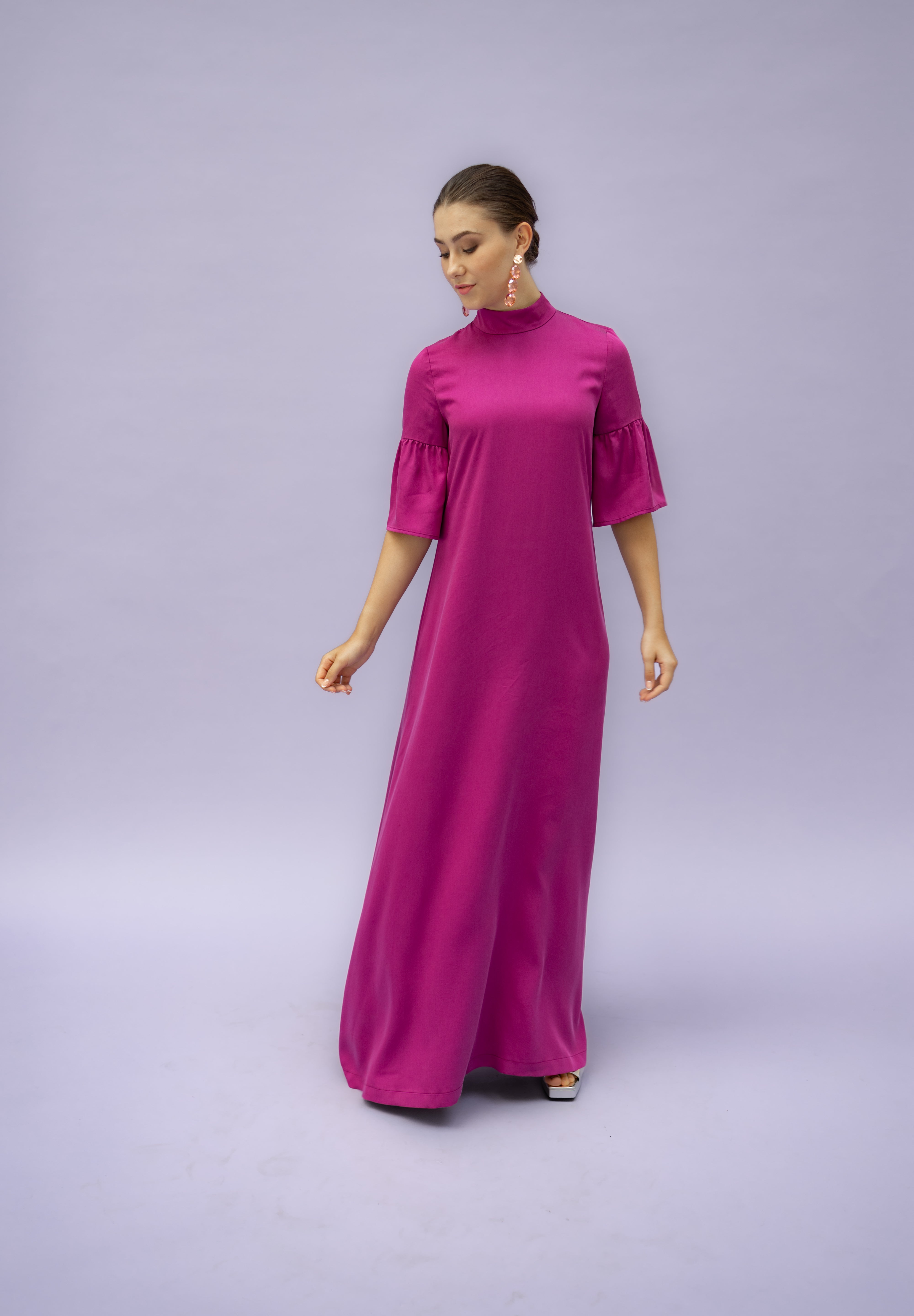 The FRANCA dress is a floor-length A-line gown featuring a chic stand-up collar and slender sleeves with ruffled edges. A seamless zip at the center back ensures a smooth fit. Crafted from luxurious fabrics, the FRANCA is the perfect choice for any formal occasion, combining classic style with modern sophistication.