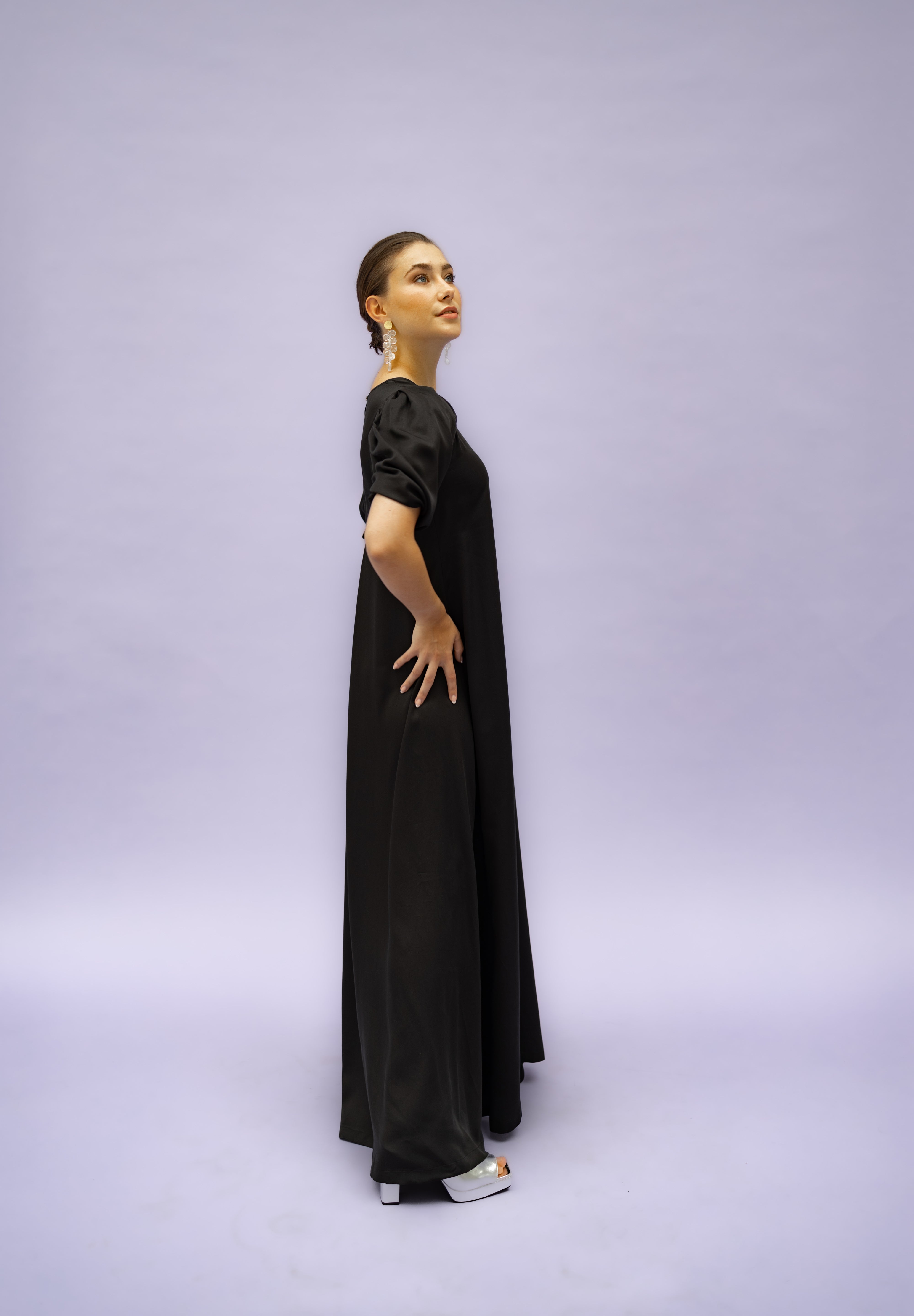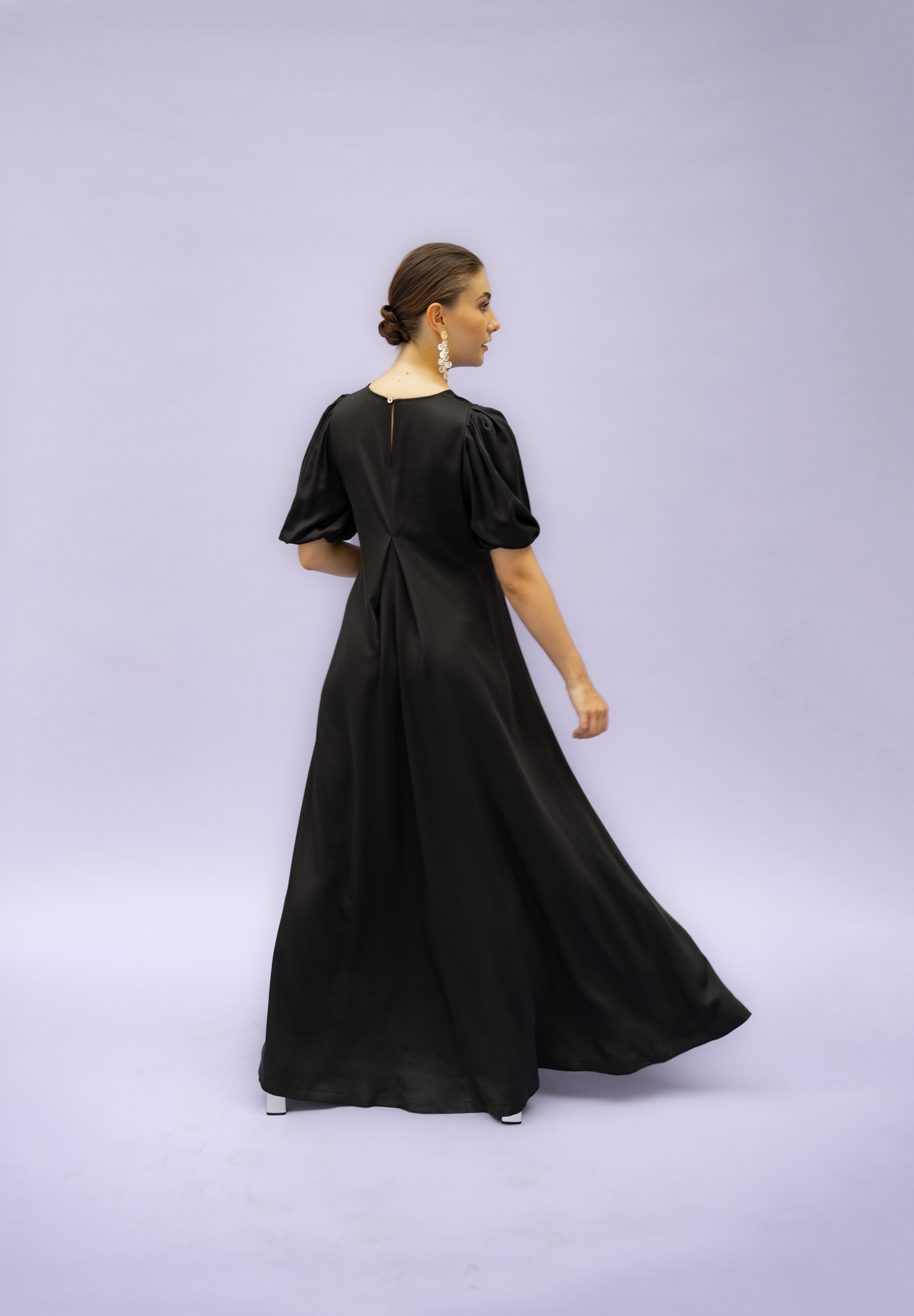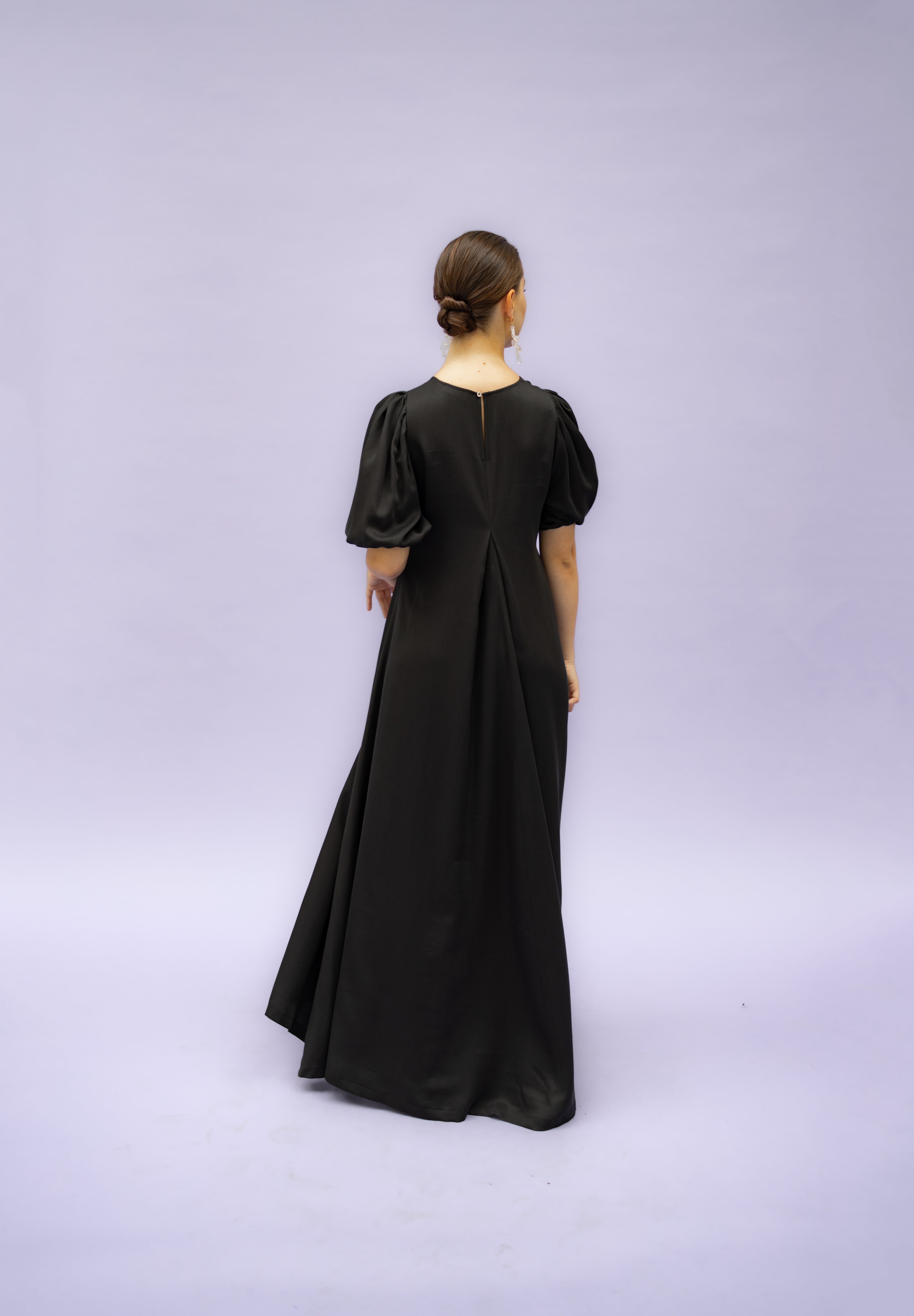 The JUNA Ball is a floor-length A-line gown with voluminous puff sleeves, perfect for an elegant ball night. Made from luxurious fabrics, it combines classic sophistication with a modern touch. A standout feature is the box pleat at the back, adding depth and graceful movement to the silhouette – ideal for an unforgettable entrance.