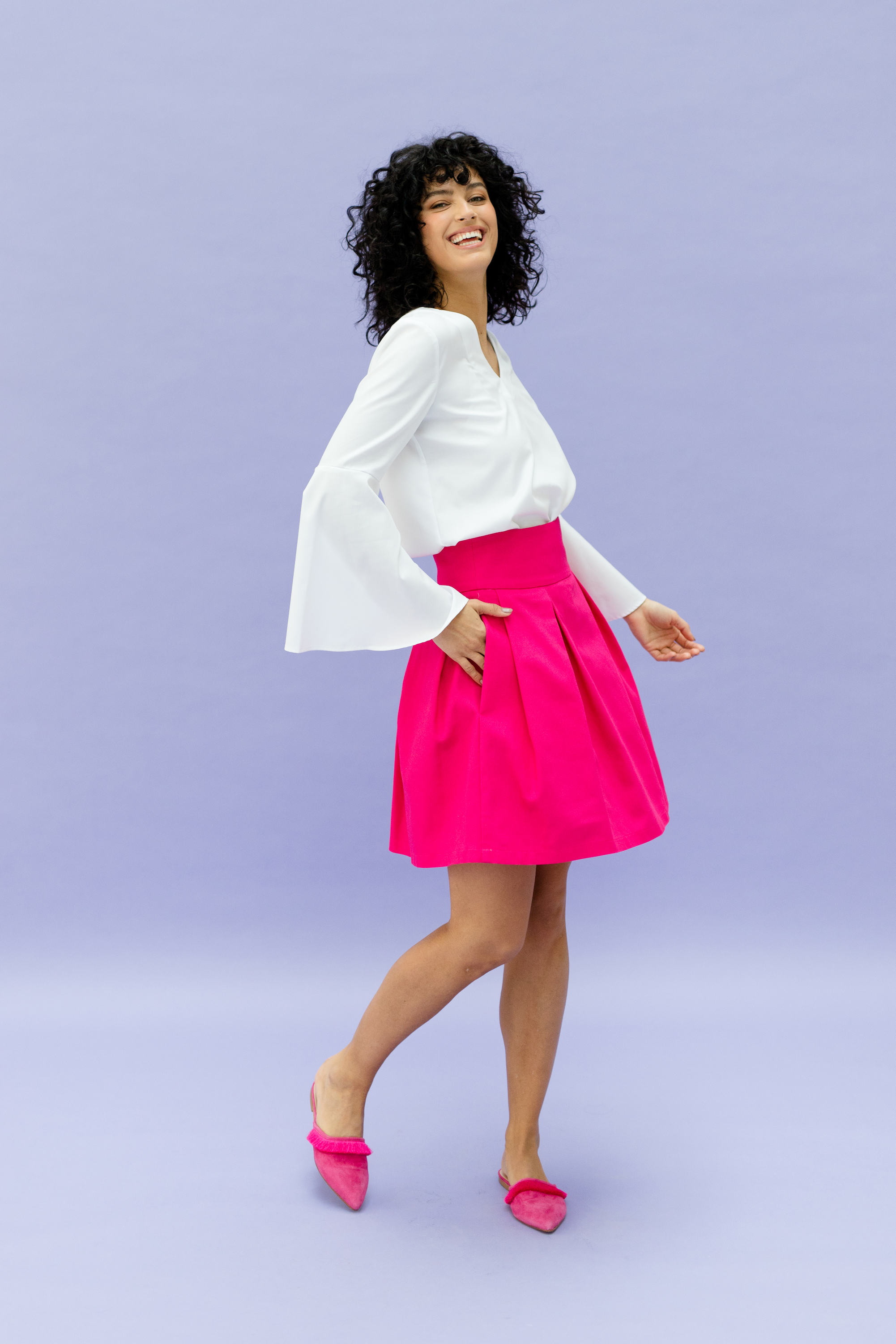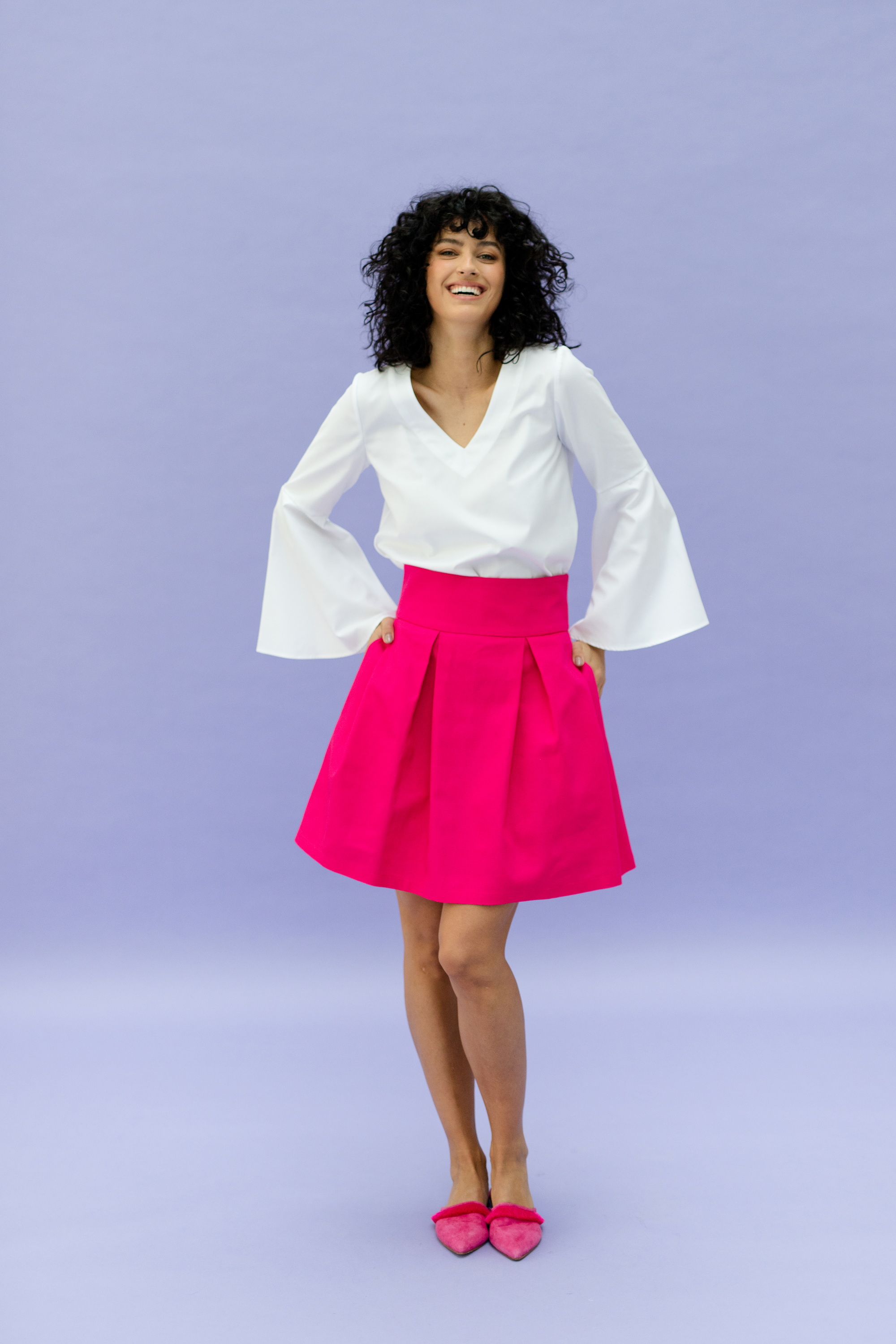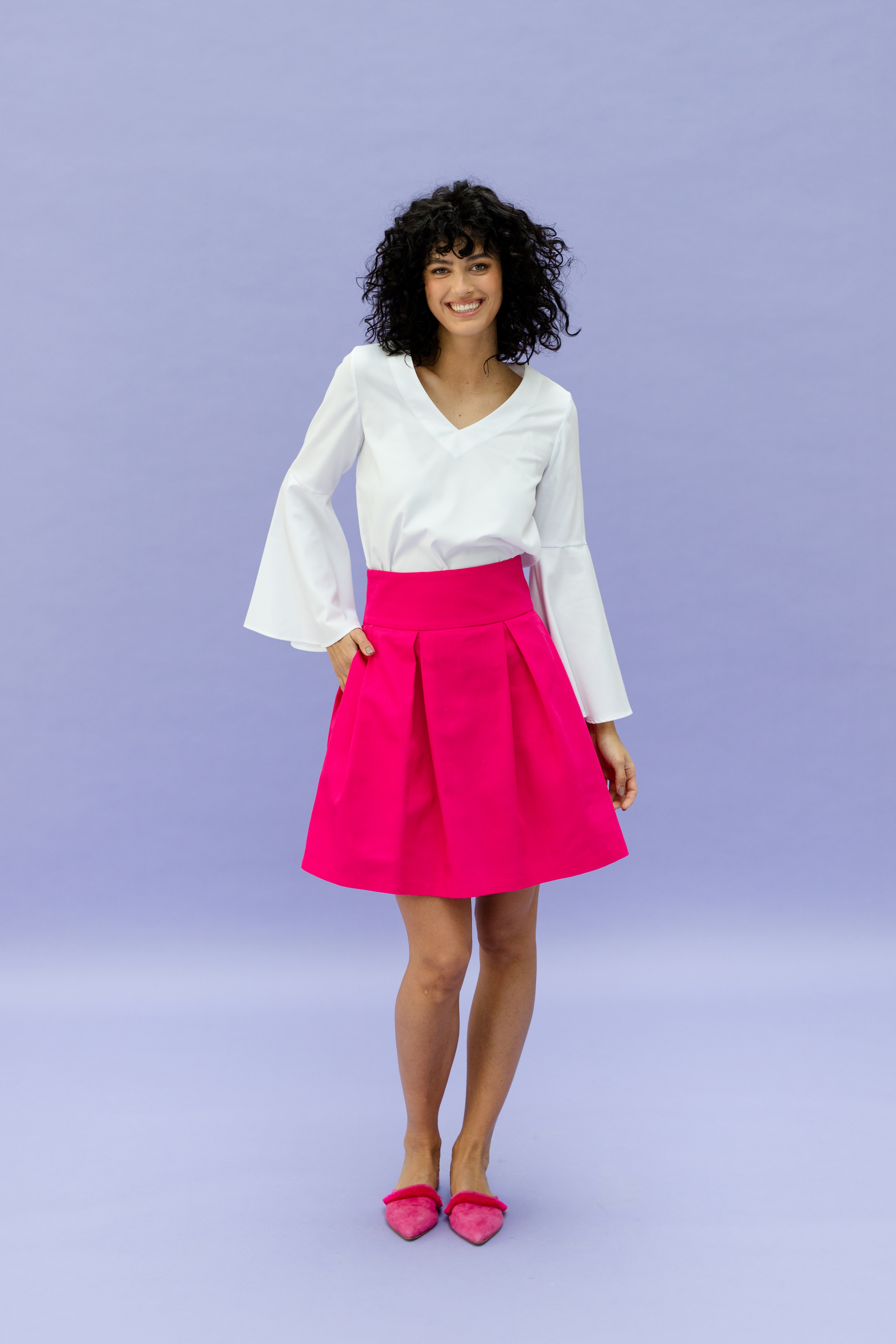RUBY, our new skirt gives you an amazing silhouette has a wide waistband, is laid in folds and skims the knees.