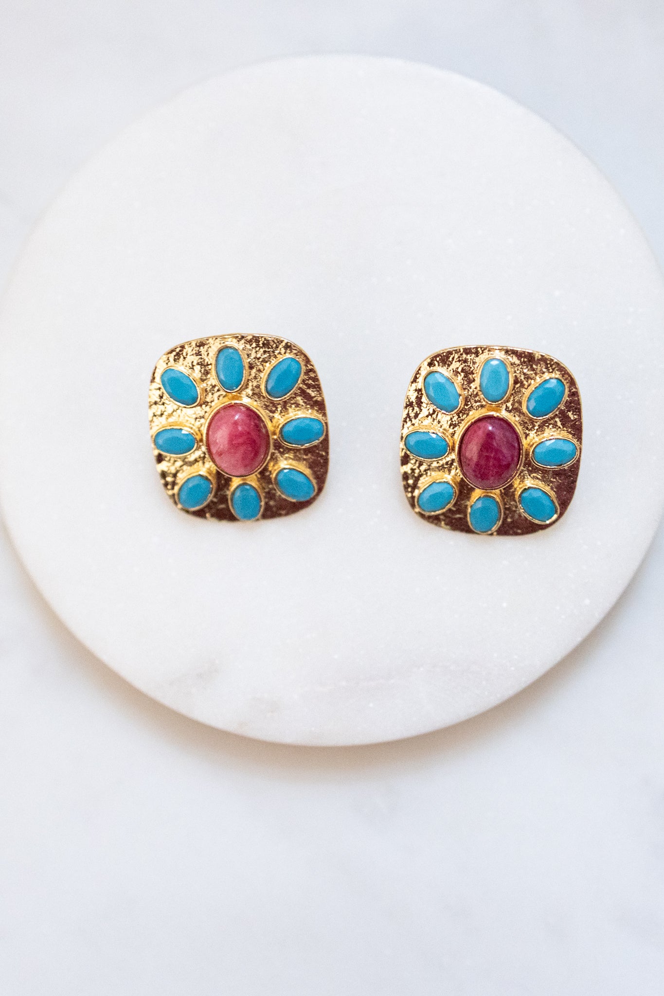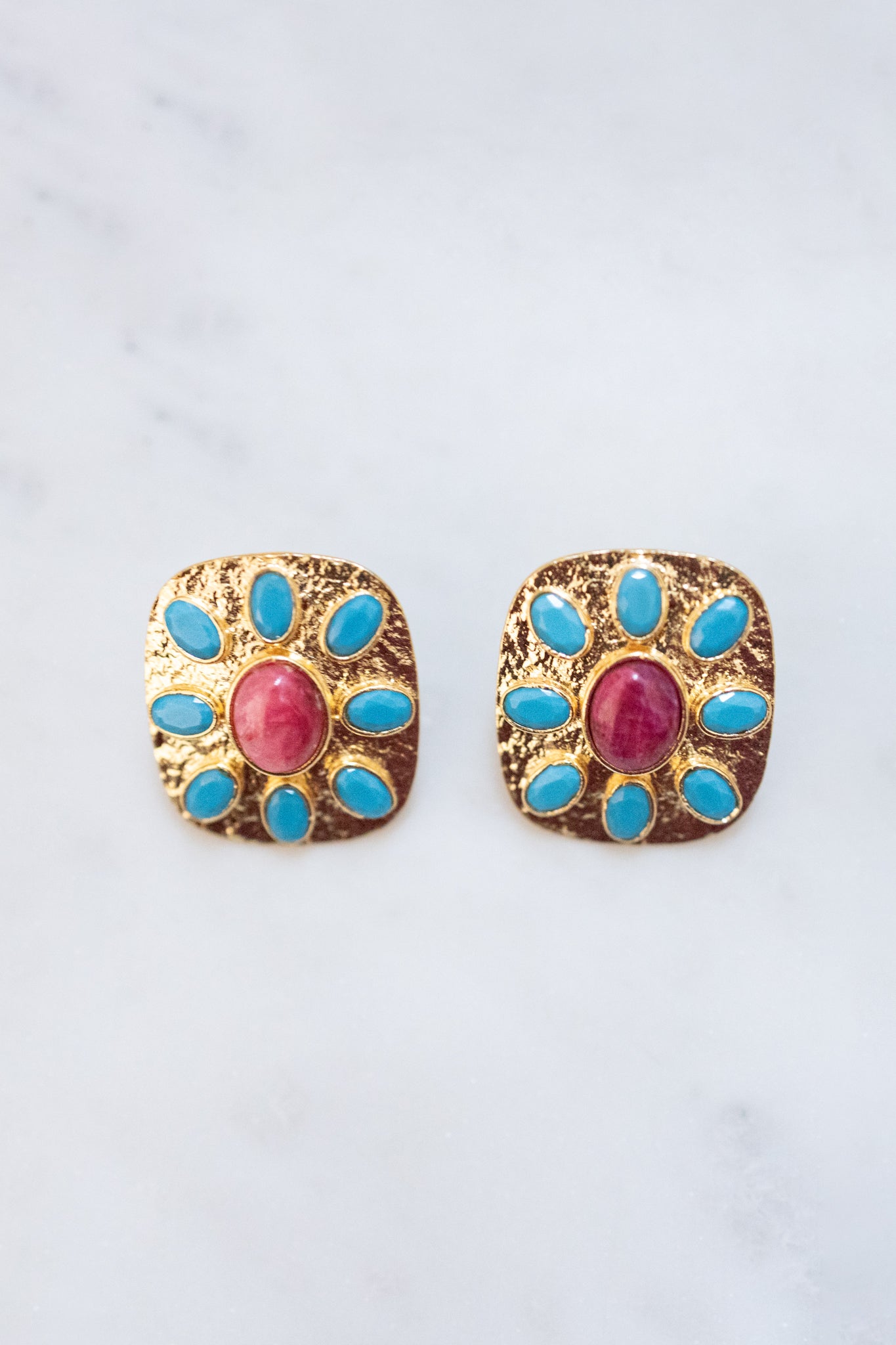 Statement earrings in a modern rectangular shape, crafted from bronze, 18 kt gold-plated and nickel-free. The surface is adorned with carefully set semi-precious stones, giving each earring a unique, artistic character. A striking accessory for those who love bold, timeless jewelry, adding a touch of luxurious elegance and artistic refinement to any look. The earrings are approximately 2.5 cm long.