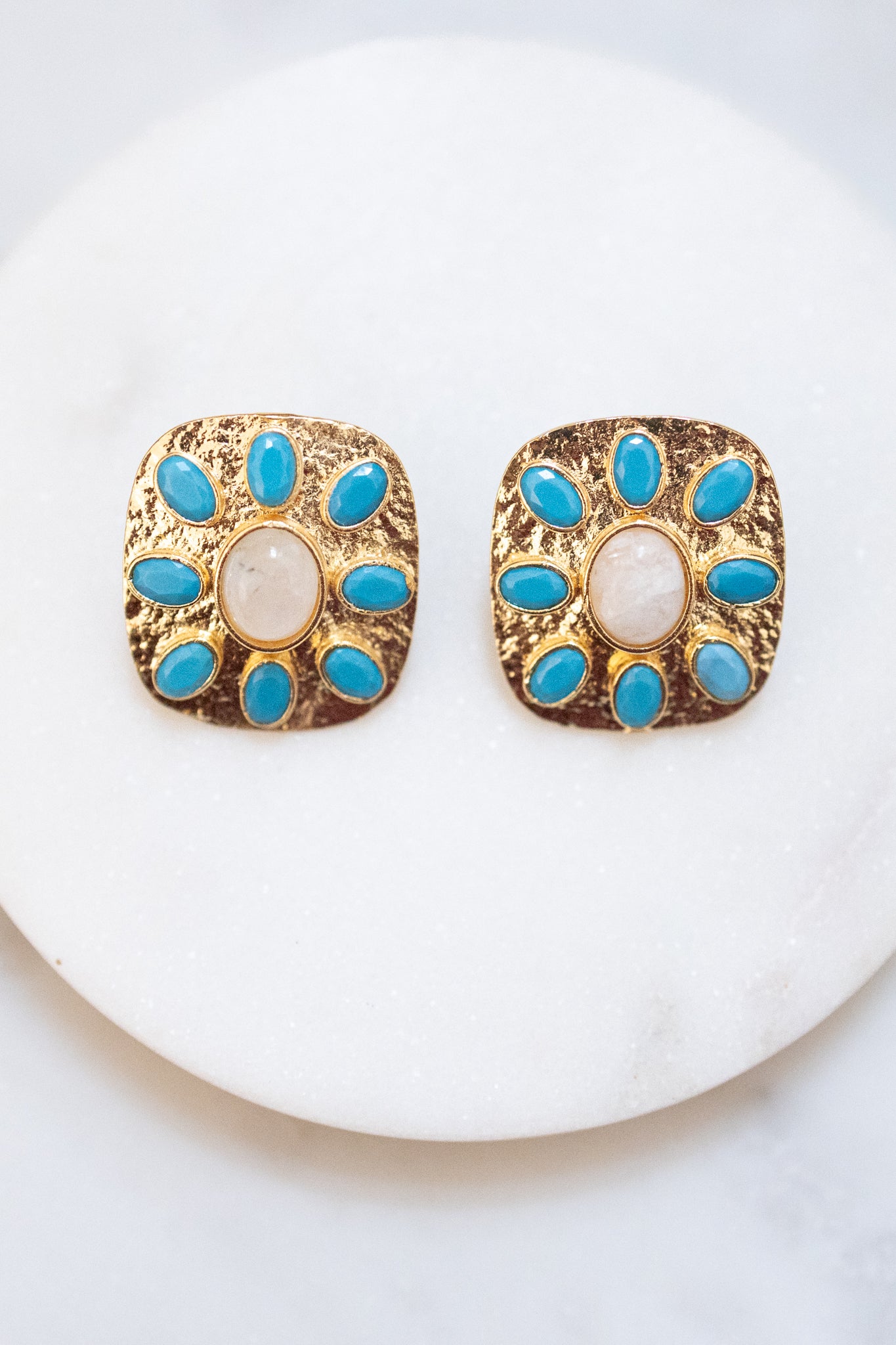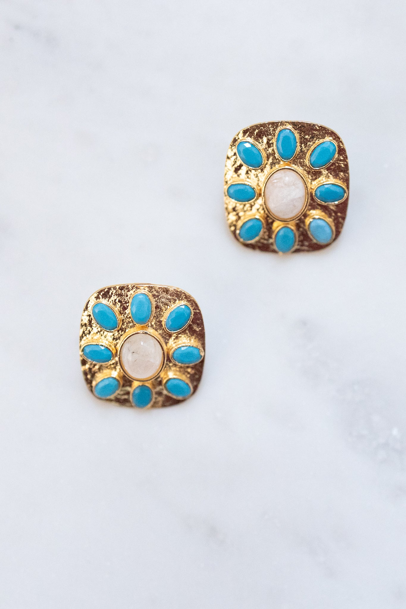 Statement earrings in a modern rectangular shape, crafted from bronze, 18 kt gold-plated and nickel-free. The surface is adorned with carefully set semi-precious stones, giving each earring a unique, artistic character. A striking accessory for those who love bold, timeless jewelry, adding a touch of luxurious elegance and artistic refinement to any look. The earrings are approximately 2.5 cm long.
