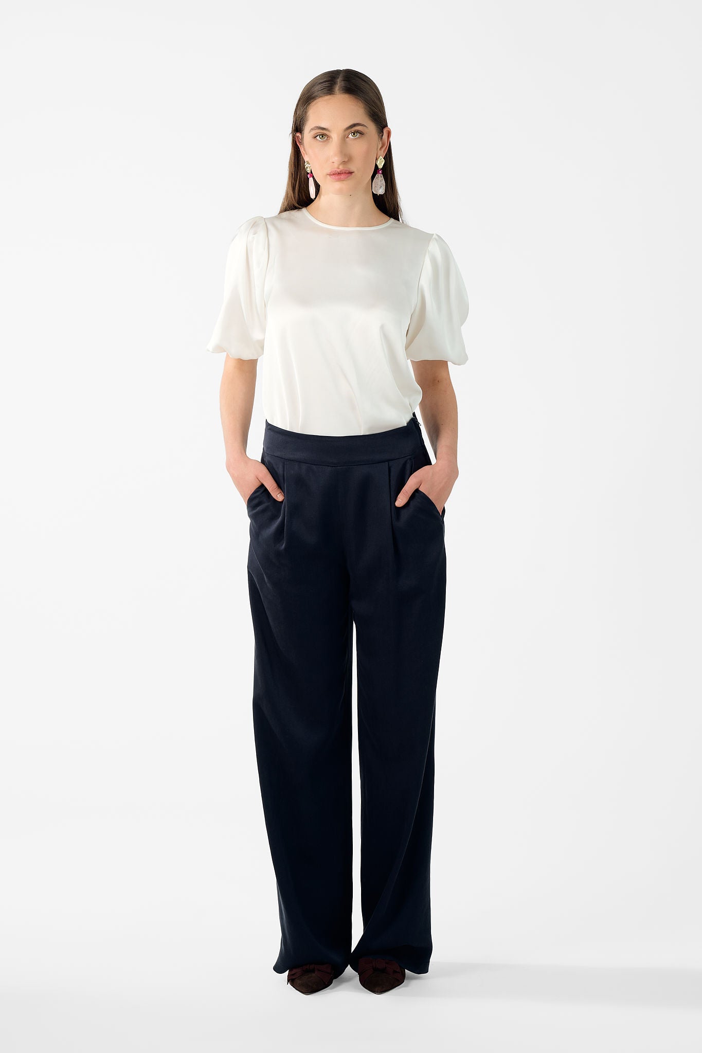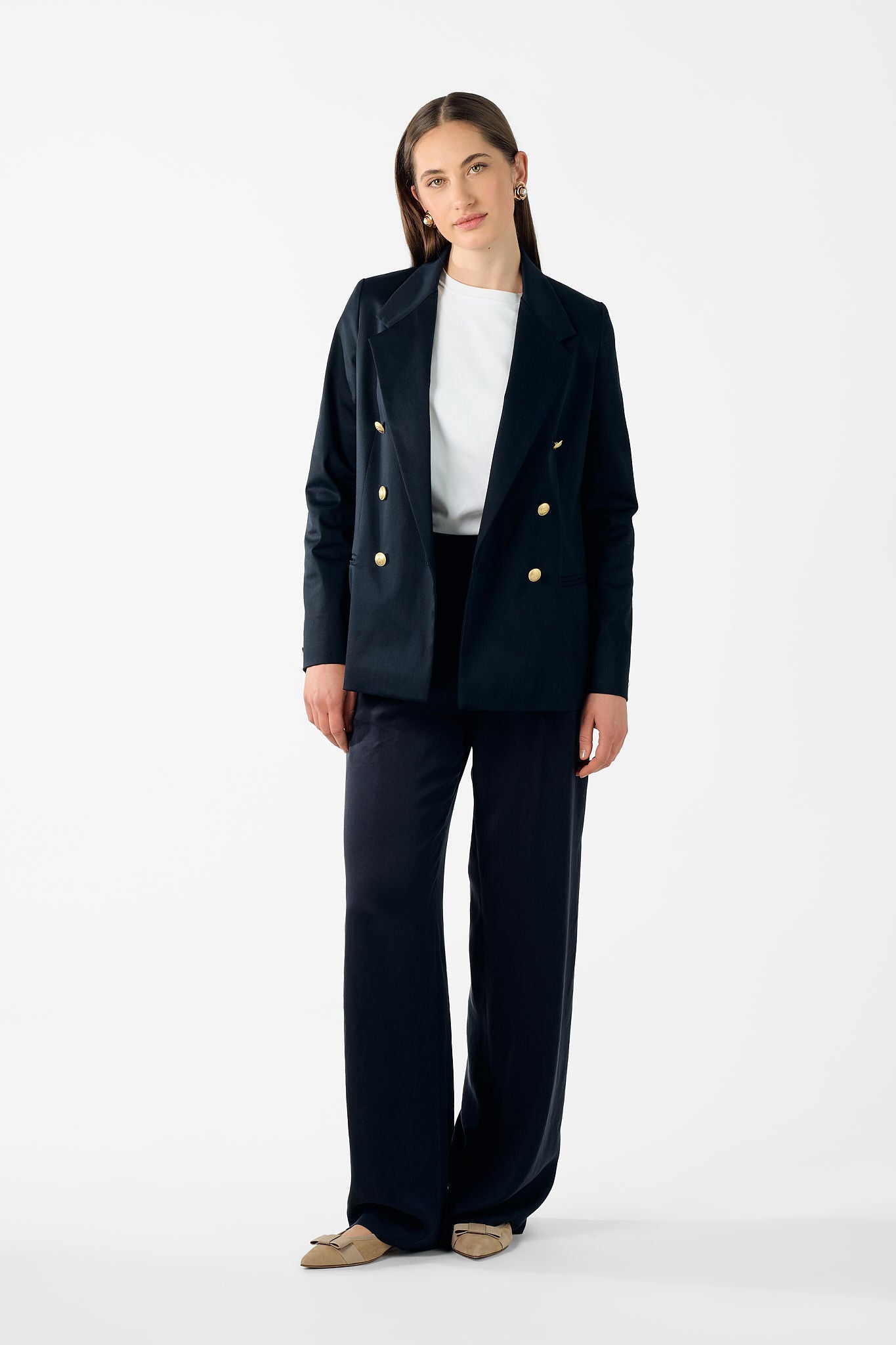 CLEO navy tencel besteht aus einem gewebten, sandgewaschenen Satin-Tencel-Stoff.