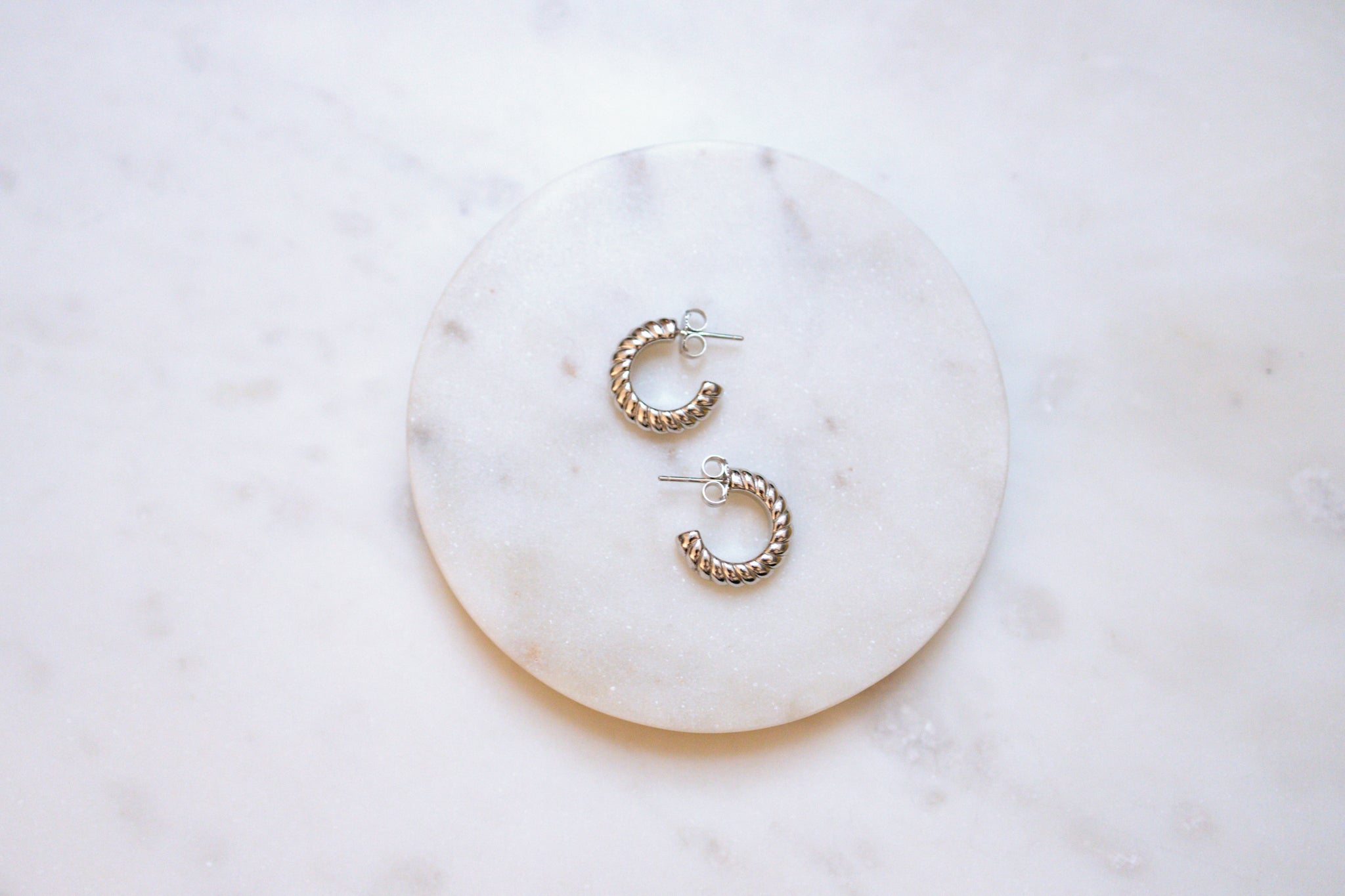 These ruffle-style hoops are crafted from 925 sterling silver with a rhodium-plated finish for a sleek, polished look. Textured, eye-catching, and full of character, they’re a stylish twist on a classic everyday staple. Approximately 2 cm long.