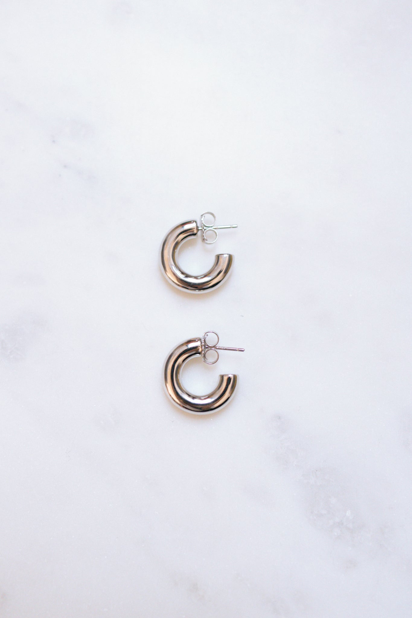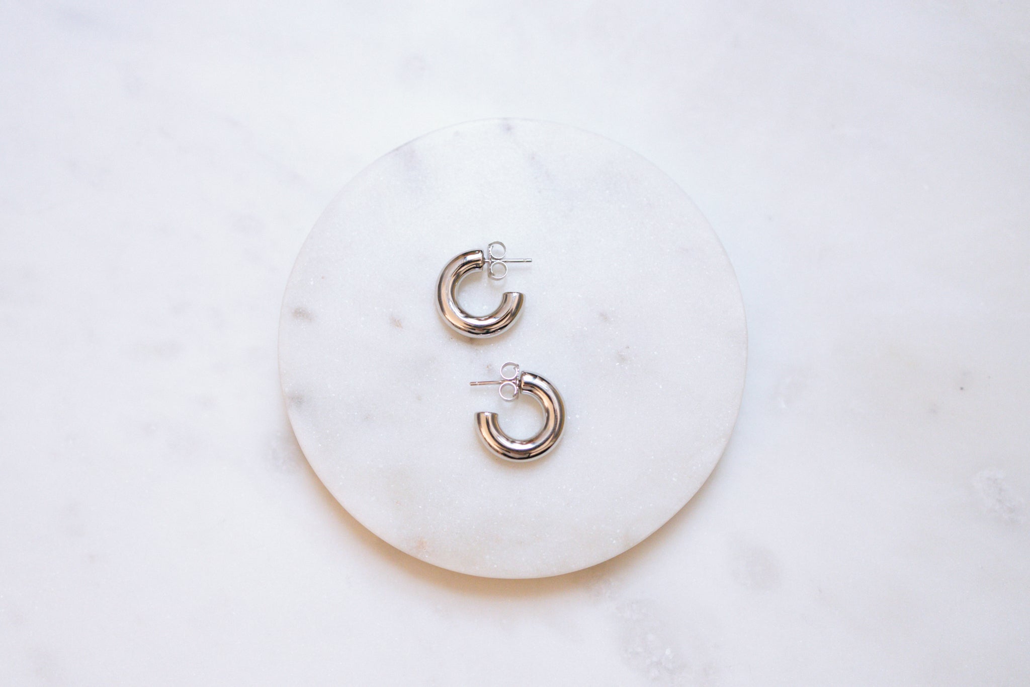 Elegant hoops crafted from rhodium-plated 925 sterling silver. Simple, versatile, and perfect for everyday wear, these hoops are a subtle yet striking addition to any jewelry collection. Approximately 2 cm long.
