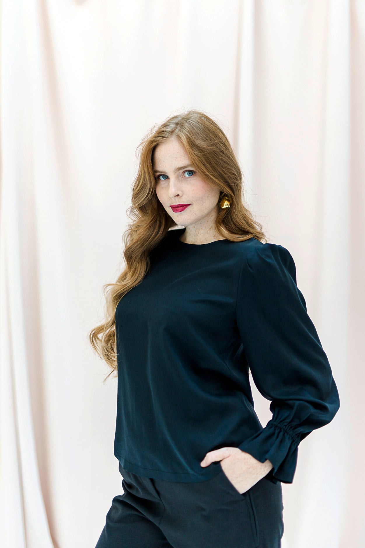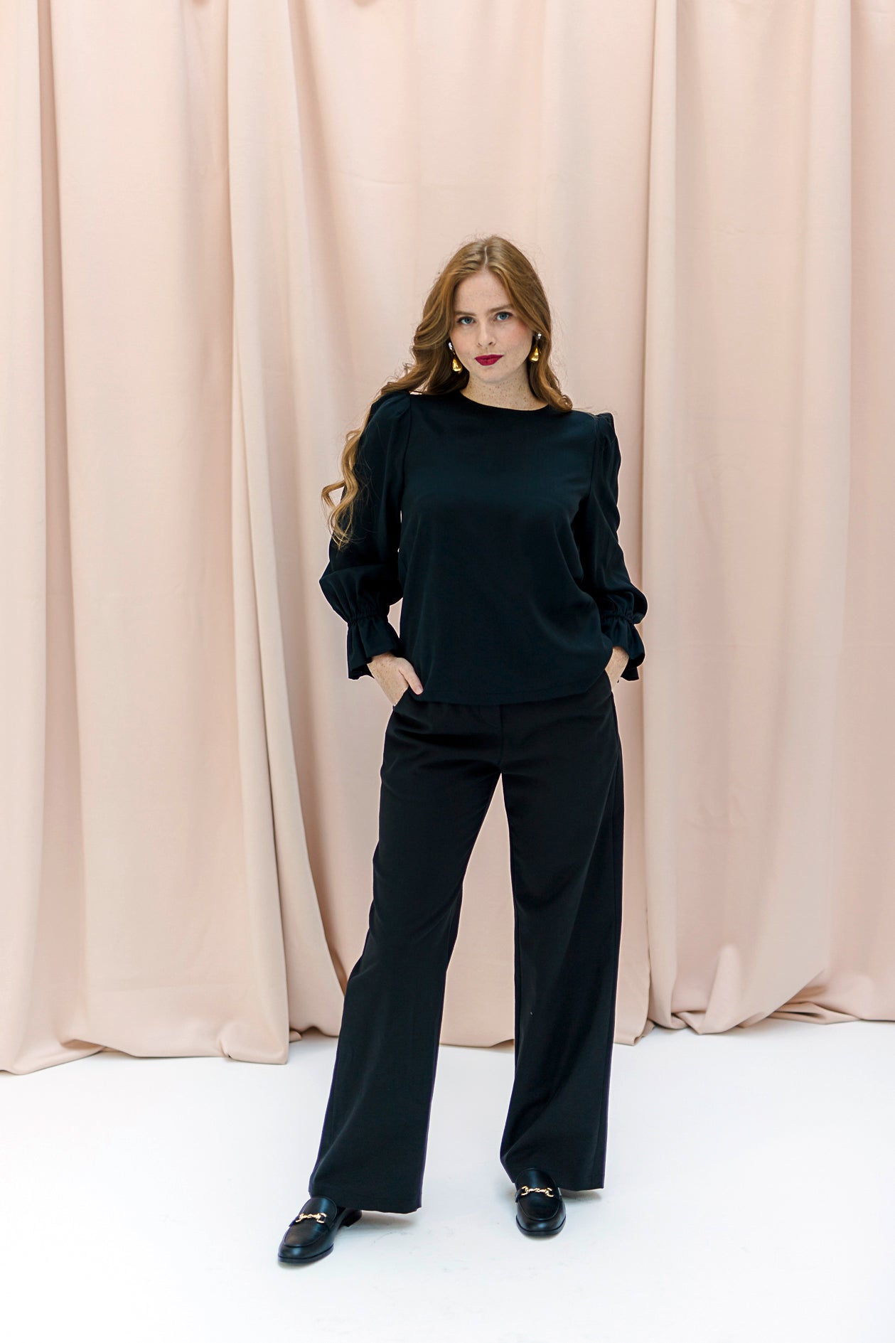 The LOLA blouse brings the ultimate WOW factor. With its long, ruffled sleeves and straight silhouette, LOLA combines a feminine touch with a modern edge. Perfectly styled with our skirts or pants for a standout ensemble.