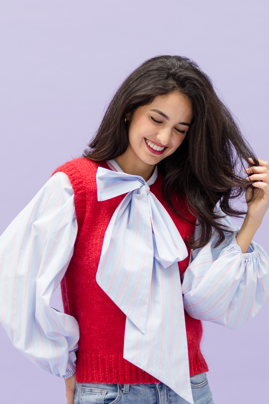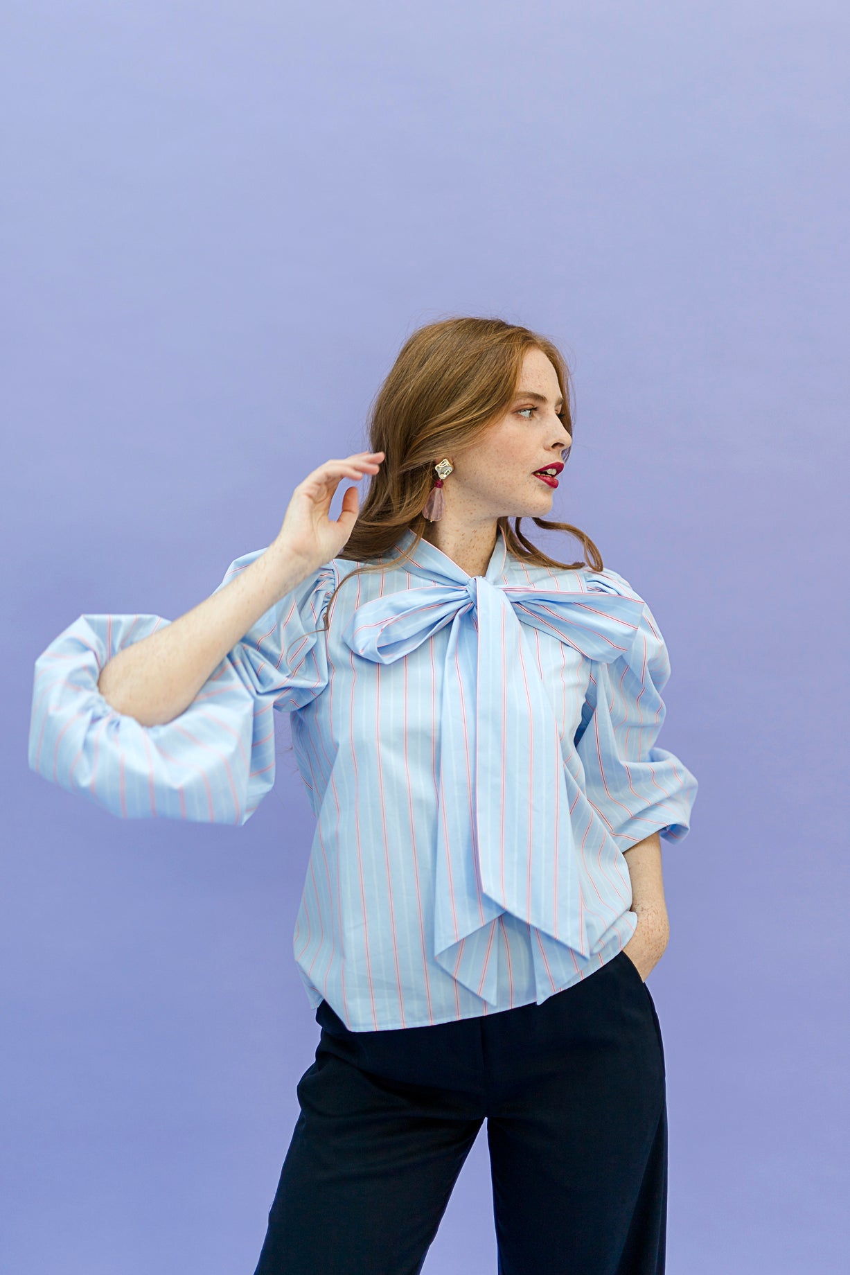 The PAULA blouse is a fresh and stylish addition to your wardrobe. Featuring playful balloon sleeves and a large bow at the front, it combines elegance with a touch of fun. Perfect for both casual and more polished looks, this blouse adds a chic flair to any outfit.